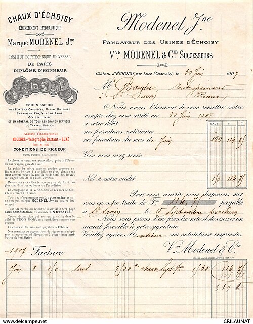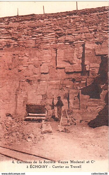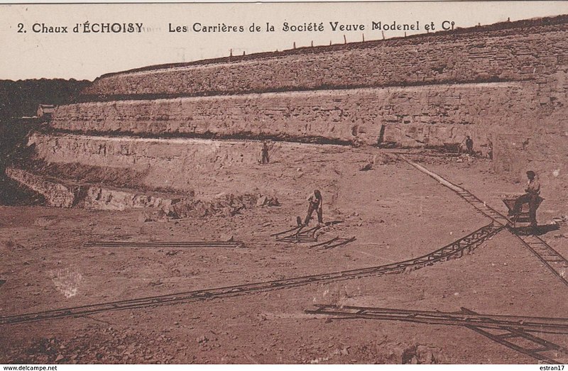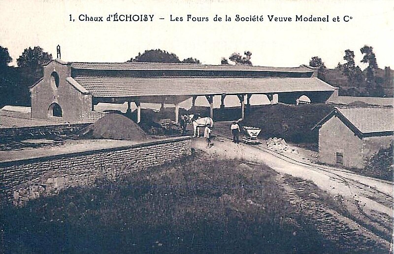 L'usine de chaux et de ciment hydraulique est édifiée vers 1850 pour Modenel et Cie ; le domaine appartient en 1851 à Jean‑Auguste Modenel, qui achève la démolition du château et installe sa résidence au vieux logis rebaptisé château, tout en gérant la nouvelle usine. L'activité prospère : la chaux d'Échoisy jouit d'une réputation nationale, avec notamment des commandes de la Marine pendant la Première Guerre mondiale. Le charbon et la chaux étaient transportés par le train dit « l'économique ». L'ensemble industriel conserve une plate-forme de cassage proche du hangar des gueulards, où s'opérait le chargement des fours ; l'usine comptait quatre fours à courte flamme et à cuisson continue pour la chaux hydraulique et deux fours destinés à la chaux lourde. Le hangar, à charpente bois et couvert d'un toit en tuile mécanique à lanterneau, s'accompagne d'un atelier des broyeurs, de bureaux et d'une modeste gare. L'intérêt du site tient surtout à la cohérence de l'ensemble, qui illustre la chaîne complète de production depuis l'extraction dans la carrière jusqu'à l'expédition par wagonnet, machines et outils compris.