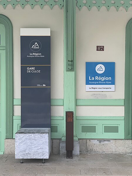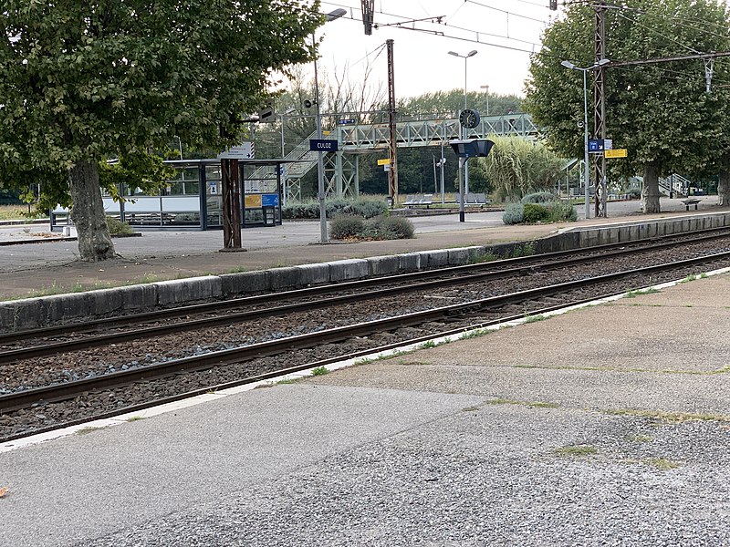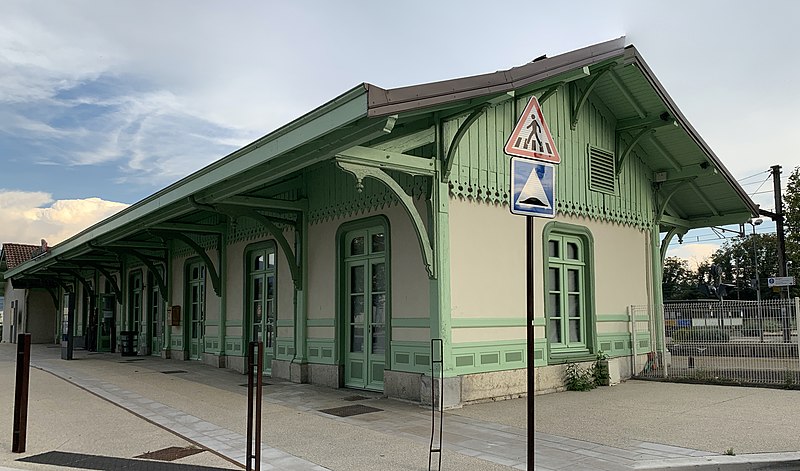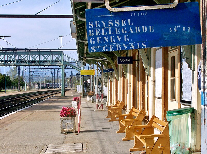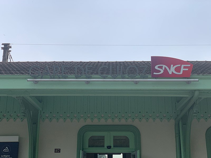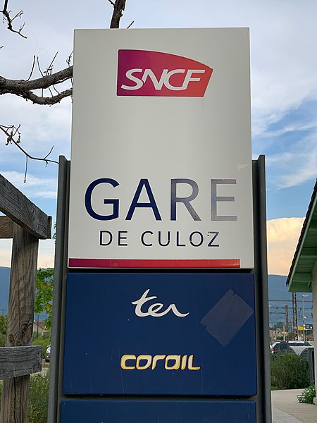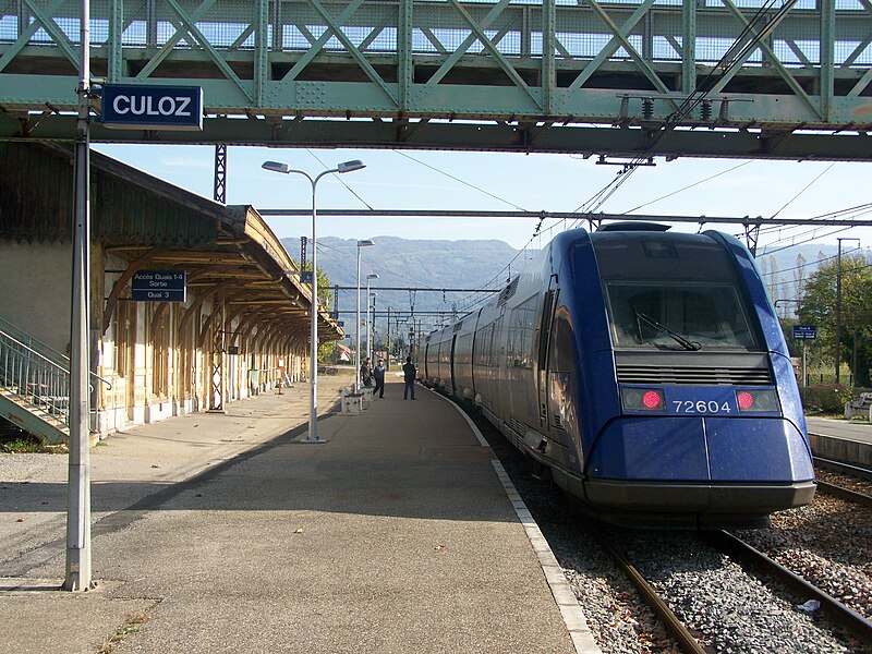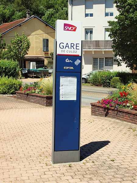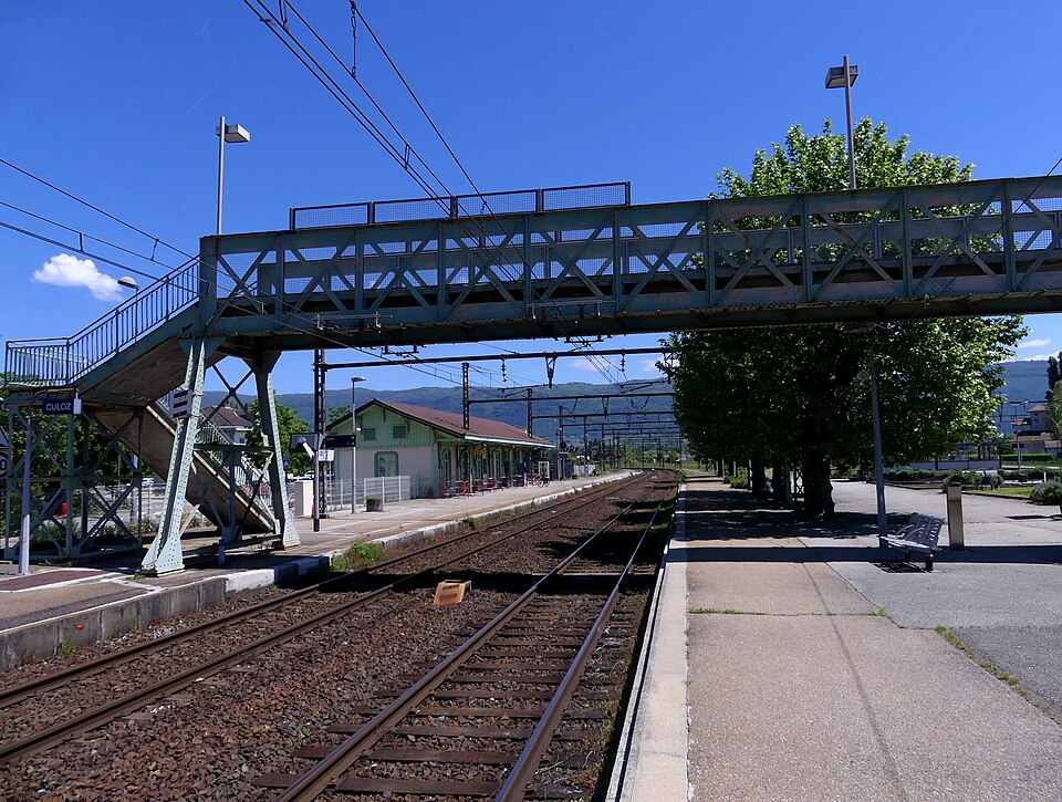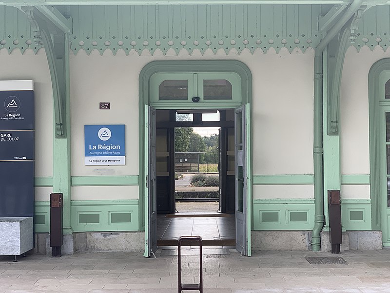La gare de Culoz, située sur la commune de Culoz (Ain, Auvergne-Rhône-Alpes), dessert les lignes de Lyon-Perrache à Genève (frontière) et de Culoz à Modane (frontière). Liée à la grande campagne d'aménagement ferroviaire du XIXe siècle, elle a été mise en service en 1857 par la Compagnie du chemin de fer de Lyon à Genève et inaugurée en 1858, permettant la traversée des marais puis du Rhône. Culoz devint rapidement une gare frontière et de correspondance vers les villes thermales et la Suisse. L’ensemble d’origine comprenait un « vestibule » côté rue destiné à filtrer les entrées et un vaste bâtiment dit « international » implanté entre les voies pour le buffet, la billetterie, les bureaux et le service des douanes, accompagnés de locaux techniques (lampisterie, château d’eau aujourd’hui disparus) et de logements pour les employés des douanes. Le style régionaliste se traduit par des boiseries évoquant les chalets de montagne, une toiture à charpente apparente et une passerelle métallique reliant les quais. Avec la suppression de la frontière, le bâtiment central a été progressivement réaffecté puis démoli en 2009, tandis que le vestibule a été inscrit au titre des monuments historiques le 23 janvier 2009. Établie à 237 mètres d’altitude au point kilométrique 101,355 de la ligne de Lyon-Perrache à Genève, la gare, de bifurcation et dite « en triangle », est l’origine de la ligne vers Modane ; le quai central présente un côté dénommé quai 2 pour Genève et un côté quai 3 pour Chambéry. Gare SNCF desservie par des TER Auvergne-Rhône-Alpes, elle dispose d’un bâtiment voyageurs avec guichet ouvert tous les jours, d’automates, d’une grande passerelle et d’espaces de stationnement pour vélos et véhicules. Elle est également ouverte au fret en wagon isolé avec une grue de 6 tonnes et dessert un embranchement particulier (SME) consacré au démantèlement de matériels roulants.