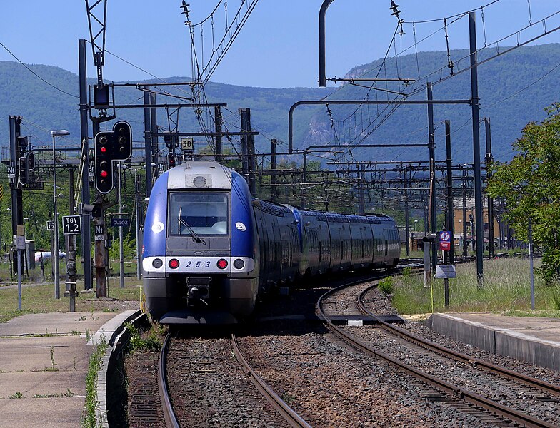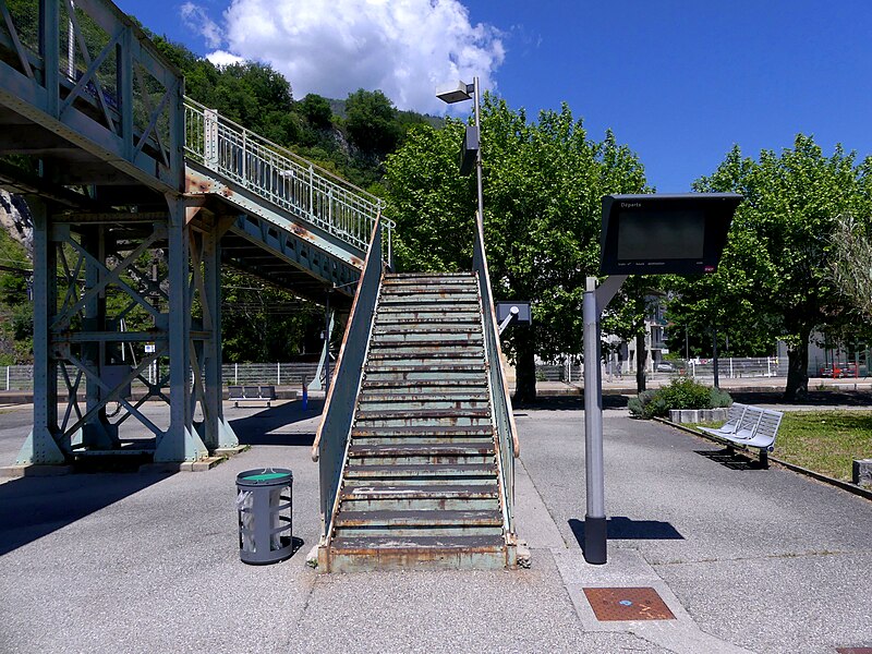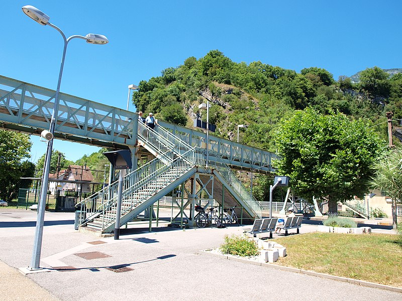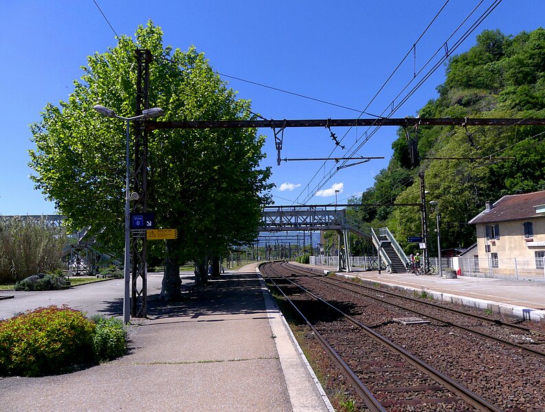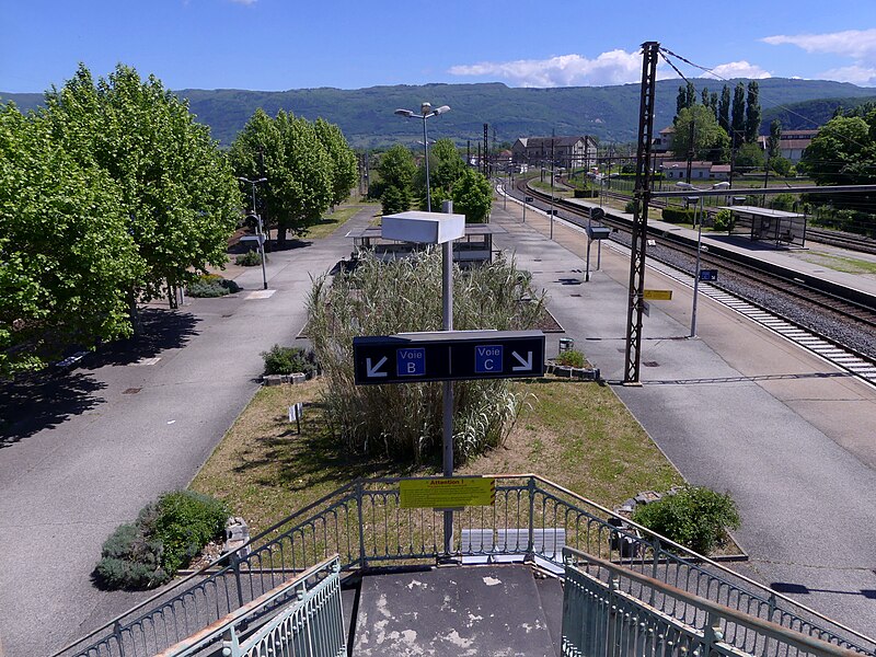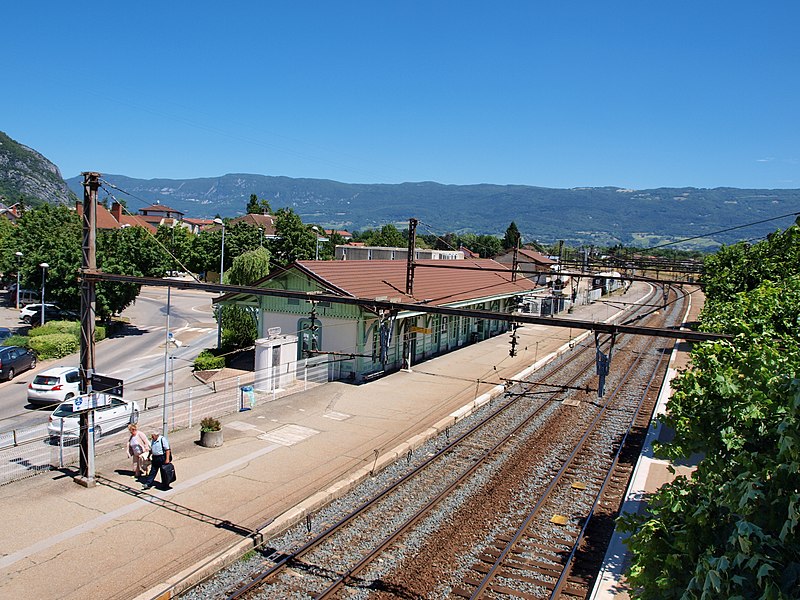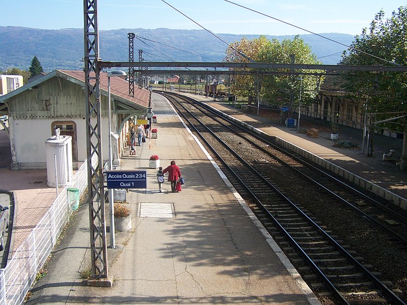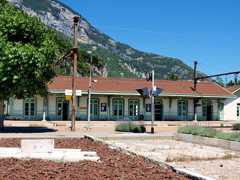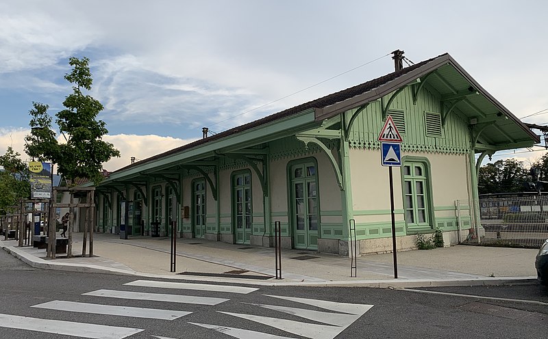 La gare de Culoz, située sur la commune de Culoz (Ain, Auvergne-Rhône-Alpes), dessert les lignes de Lyon-Perrache à Genève (frontière) et de Culoz à Modane (frontière). Liée à la grande campagne d'aménagement ferroviaire du XIXe siècle, elle a été mise en service en 1857 par la Compagnie du chemin de fer de Lyon à Genève et inaugurée en 1858, permettant la traversée des marais puis du Rhône. Culoz devint rapidement une gare frontière et de correspondance vers les villes thermales et la Suisse. L’ensemble d’origine comprenait un « vestibule » côté rue destiné à filtrer les entrées et un vaste bâtiment dit « international » implanté entre les voies pour le buffet, la billetterie, les bureaux et le service des douanes, accompagnés de locaux techniques (lampisterie, château d’eau aujourd’hui disparus) et de logements pour les employés des douanes. Le style régionaliste se traduit par des boiseries évoquant les chalets de montagne, une toiture à charpente apparente et une passerelle métallique reliant les quais. Avec la suppression de la frontière, le bâtiment central a été progressivement réaffecté puis démoli en 2009, tandis que le vestibule a été inscrit au titre des monuments historiques le 23 janvier 2009. Établie à 237 mètres d’altitude au point kilométrique 101,355 de la ligne de Lyon-Perrache à Genève, la gare, de bifurcation et dite « en triangle », est l’origine de la ligne vers Modane ; le quai central présente un côté dénommé quai 2 pour Genève et un côté quai 3 pour Chambéry. Gare SNCF desservie par des TER Auvergne-Rhône-Alpes, elle dispose d’un bâtiment voyageurs avec guichet ouvert tous les jours, d’automates, d’une grande passerelle et d’espaces de stationnement pour vélos et véhicules. Elle est également ouverte au fret en wagon isolé avec une grue de 6 tonnes et dessert un embranchement particulier (SME) consacré au démantèlement de matériels roulants.