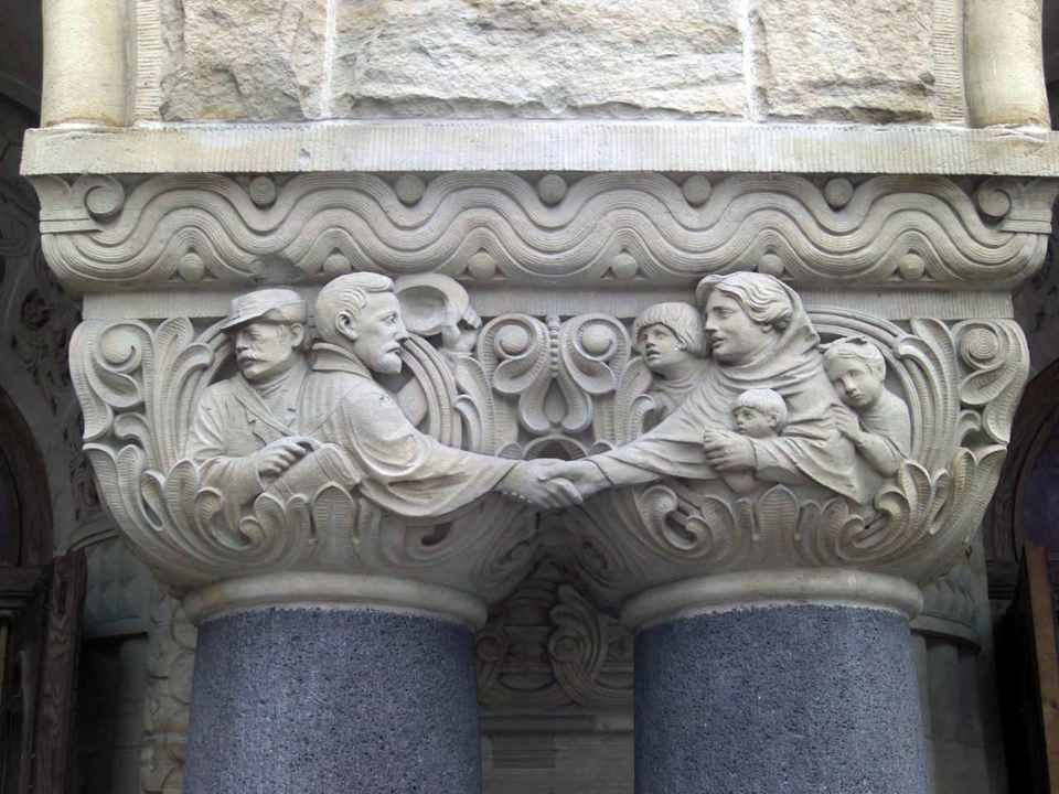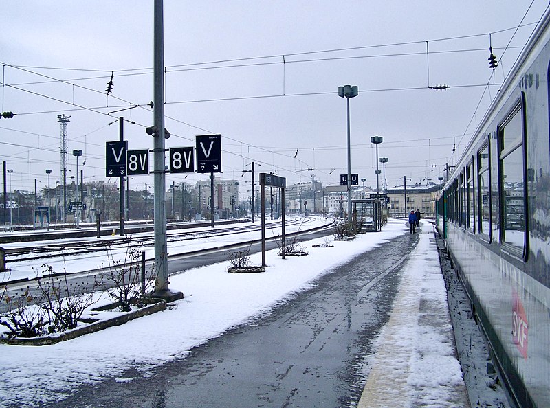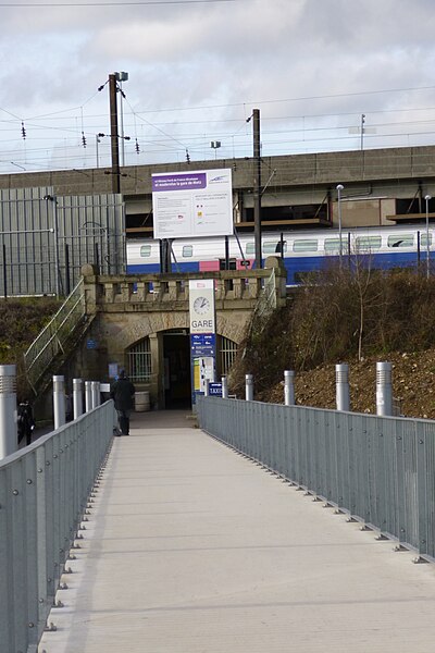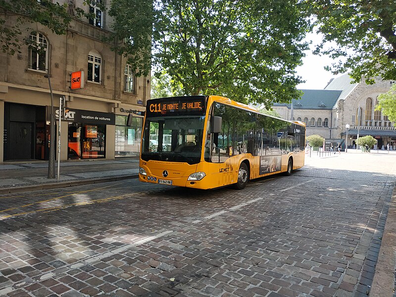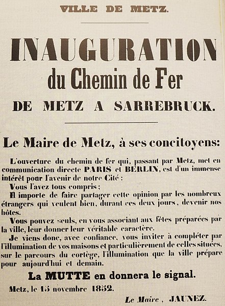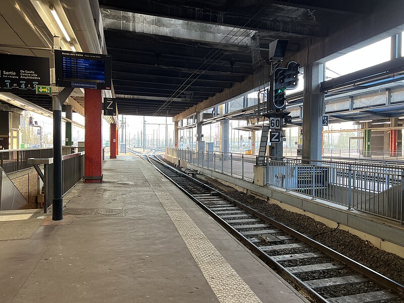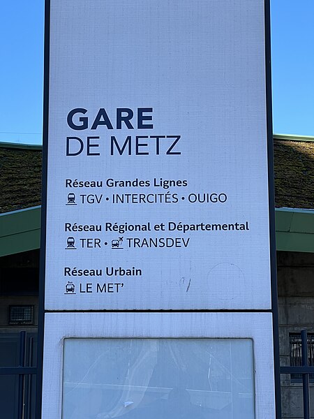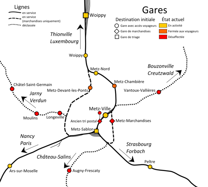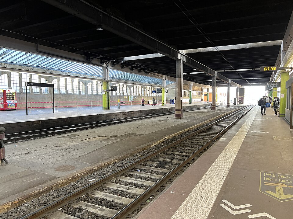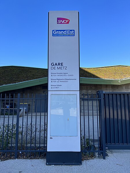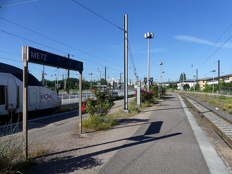 La gare de Metz-Ville, usuellement appelée gare de Metz, est une gare ferroviaire française située à proximité du centre-ville de Metz, préfecture de la Moselle en région Grand Est. Sa construction fut décidée par ordonnance impériale du 21 avril 1901 et confiée à un concours ouvert aux architectes allemands ; l'architecte berlinois Jürgen Kröger, assisté de Peter Jürgensen et Jürgen Bachmann, remporta le premier prix. La construction s'étendit de 1904 à 1908 et le bâtiment voyageurs, long de plus de 300 mètres avec une tour de l'horloge d'environ 40 mètres, fut inauguré en 1908 par la Direction générale impériale des chemins de fer d'Alsace-Lorraine. Établie sur les anciens fossés de la ville, la gare repose sur 3 034 pieux de fondation en béton armé de dix à dix-sept mètres, réalisés selon le procédé de François Hennebique, et le gros œuvre fut assuré par la Société de construction lorraine de Metz. Conçue dans un style romano-rhénan ou néo-roman rhénan voulu par l'Académie royale de Berlin et l'empereur, la gare mêle références religieuses et impériales dans sa volumétrie et son décor sculpté. Le décor sculpté et les vitraux évoquent des thèmes de puissance, de voyage et des références carolingiennes, tandis que certains éléments à connotation allemande furent modifiés ou supprimés après 1918. À l'origine deux halles métalliques, puis une troisième ajoutée après 1908, couvraient les quais ; ces marquises furent progressivement démantelées et remplacées par une dalle en béton armé aménagée en parc de stationnement dans les années 1970. La gare fut conçue pour répondre à des besoins militaires : terminus d'une ligne stratégique, elle comportait de nombreuses voies et des quais larges et surélevés destinés au chargement rapide de troupes et de matériel. La tour isolée jouait le rôle de château d'eau avec une capacité de 300 m3 pour alimenter les locomotives à vapeur. Classée au titre des monuments historiques depuis le 15 janvier 1975, la protection porte sur les façades et toitures (hors verrière), le salon d'honneur, le décor du buffet et le hall de départ. Construite en grès de Niderviller de couleur gris pâle, la gare contraste avec les pierres locales du centre-ville et s'inscrit dans le quartier impérial ou Neustadt, dont l'urbanisme constitue une composition novatrice. Le projet architectural lauréat, intitulé « Licht und Luft », initialement influencé par l'Art nouveau, fut adapté à la stylistique romane rhénane pour répondre aux attentes impériales tout en conservant une organisation fonctionnelle rigoureuse. Le buffet adjacent au salon d'honneur présente un décor riche de boiseries, frises peintes et bas-reliefs illustrant le voyage et la hiérarchie sociale des voyageurs, tandis que de nombreux détails sculptés et vitraux renforcent la portée symbolique de l'édifice. Après 1918 la gare changea d'exploitant : elle fut rattachée à l'administration des chemins de fer d'Alsace et de Lorraine, devint concession de la SNCF lors de sa création en 1938 et, durant la Seconde Guerre mondiale, fut gérée par la Deutsche Reichsbahn jusqu'à la Libération. Aujourd'hui exploitée par la SNCF, la gare accueille des TGV et des trains express régionaux et reste le centre d'un important complexe ferroviaire établi à 179 mètres d'altitude et point kilométrique de plusieurs lignes. Pour répondre à l'augmentation du trafic, notamment liée à l'arrivée du TGV, des travaux de modernisation et l'ouverture de nouveaux quais ont été menés entre 2002 et 2012, augmentant la cadence et la capacité d'accueil. Ce projet, soutenu financièrement par la région Lorraine, l'État et Réseau ferré de France, a renforcé les liaisons transfrontalières et la desserte du sillon lorrain. La gare dispose d'un bâtiment voyageurs avec guichets et automates, d'aménagements pour les personnes à mobilité réduite, de commerces et services dans le hall, ainsi que de passages souterrains et d'une passerelle permettant l'accès aux voies et aux quartiers voisins. Le passage Jürgen-Kröger relie la place du Général-de-Gaulle au quartier de l'Amphithéâtre et, après restauration, fut rouvert en 2012 ; le passage Adrienne-Thomas relie la rue La Fayette au pôle d'échange multimodal et une passerelle sud conduit au Centre Pompidou-Metz. La gare a suscité au fil du temps critiques et éloges : accueillie avec hostilité par certains au début du XXe siècle, elle a depuis reçu plusieurs distinctions publiques et figure dans la littérature et les arts. Des œuvres et statues contemporaines, notamment une œuvre de Stephan Balkenhol rendant hommage à Jean Moulin et une statue du général de Gaulle inaugurée en 2021, complètent aujourd'hui le parvis et le patrimoine symbolique de la gare. La gare accueille par ailleurs un service fret et conserve une place importante dans les réseaux régionaux et internationaux desservis par TGV, TER et autres liaisons.