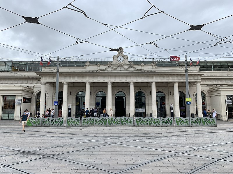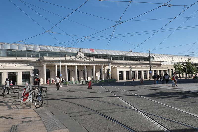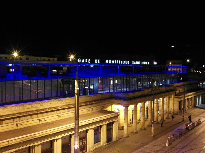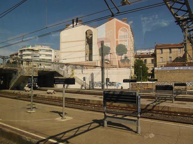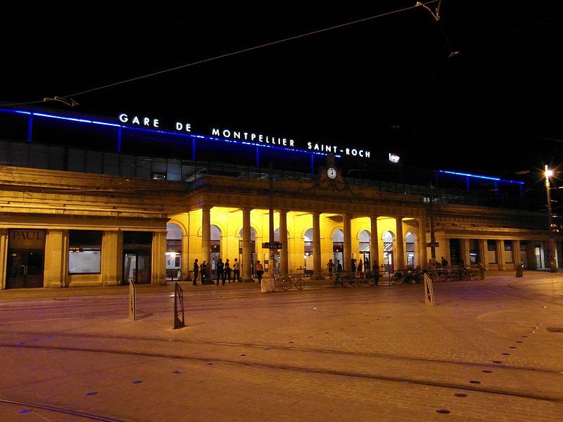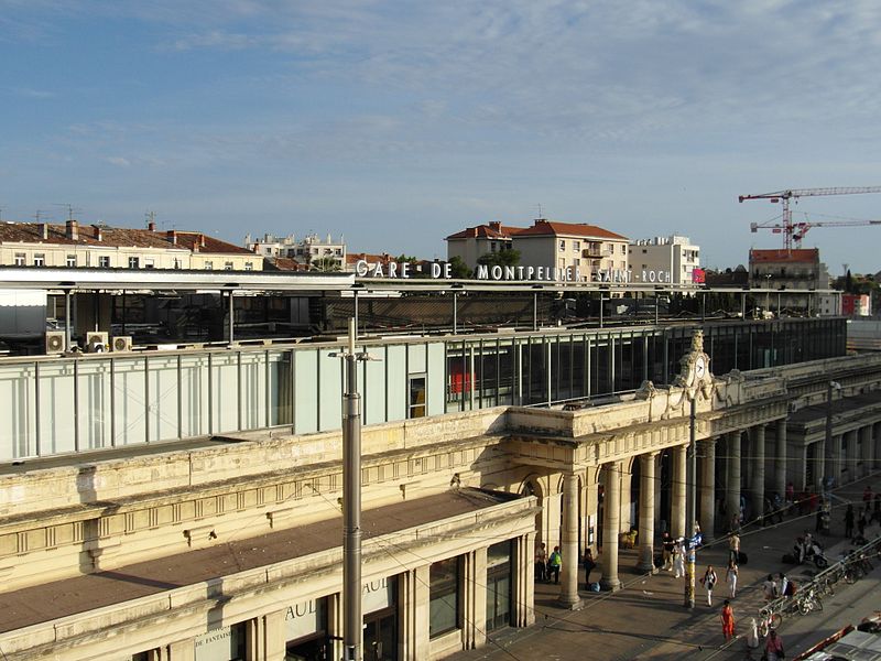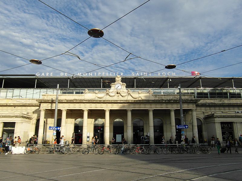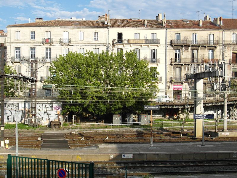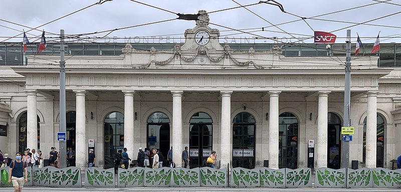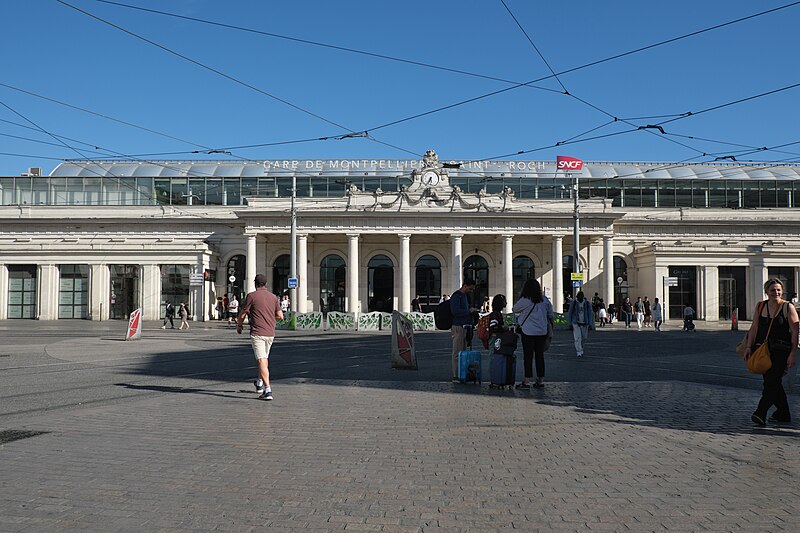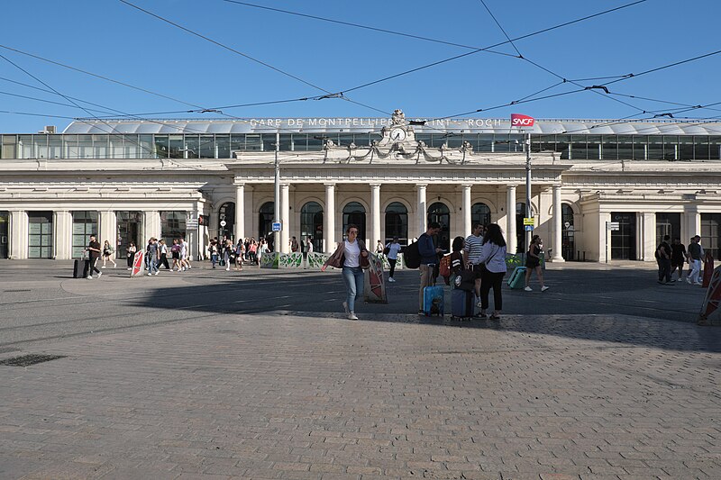La gare de Montpellier-Saint-Roch est une gare ferroviaire française située sur la commune de Montpellier (Hérault), établie à 27 mètres d'altitude au point kilométrique 76,959 de la ligne de Tarascon à Sète-Ville ; elle est aussi gare de bifurcation au PK 519,296 de la ligne de Paulhan à Montpellier (non exploitée). Construite en 1843-1844, le bâtiment voyageurs a été profondément transformé depuis son origine : de son aspect du XIXe siècle ne subsiste que le péristyle à colonnades et la façade néoclassique, tandis que la halle et les marquises en fonte ont disparu. La première gare, terminus de la ligne de Montpellier à Sète, se trouvait près de l'actuelle rue du Grand-Saint-Jean ; la seconde, implantée lors de la création de la ligne vers Nîmes, occupe l'emplacement actuel et a favorisé l'urbanisation du secteur. Le tracé et l'implantation ont été définis sous la direction de l'ingénieur Charles Didion, la construction de la gare de Montpellier ayant été dirigée par l'ingénieur Aurès en 1844. En 1852 la gare voyageurs de la ligne de Sète a été transférée dans la nouvelle gare, les anciens emplacements servant ensuite de garage de locomotives puis de gare de marchandises. Pour répondre à l'augmentation du trafic, le bâtiment a été agrandi notamment entre 1868 et 1871 puis en 1905, avec l'ajout d'une horloge sur l'attique, et des aménagements complémentaires ont été réalisés au XXe siècle, comme les passages souterrains creusés en 1924. La marquise en fonte qui couvrait les voies a été démolie en novembre 1937. Pendant la Seconde Guerre mondiale la gare fut le théâtre d'événements marquants, notamment l'arrêt du général Franco en février 1941 et un bombardement des infrastructures ferroviaires en juillet 1944. L'électrification a porté les caténaires au-dessus des voies en octobre 1947 et, après-guerre, les installations de marchandises furent progressivement déplacées au-delà du pont de Sète. À partir des années 1970 la gare connut d'importantes modifications urbaines : une dalle construite au-dessus des voies reçut une gare routière et un parking, aménagements remaniés à l'approche du TGV et au moment de la reconstruction de la gare dans les années 1980, la partie centrale de la façade étant inscrite au titre des monuments historiques le 28 décembre 1984. La nouvelle gare, mise en service en 1981 et inaugurée en 1982, a vu son hall agrandi et l'ouverture du service TGV la même année. L'arrivée du tramway en juillet 2000 a conduit à une réorganisation des lignes de bus et au déplacement de la gare routière, et l'appellation « Montpellier-Saint-Roch » a été progressivement utilisée à partir de 2003 avant d'être officialisée le 31 mars 2005. Au début des années 2010, un vaste réaménagement a été engagé, comprenant la construction d'une verrière métallique partiellement ouverte en juin 2013 et la réouverture complète du bâtiment rénové le 2 décembre 2014 afin d'améliorer la lisibilité et la capacité pour les quelque 18 000 voyageurs quotidiens. L'ouverture du contournement ferroviaire de Nîmes et de Montpellier en 2018 n'a pas permis aux trains de rejoindre Saint‑Roch, qui est ainsi secondée par la nouvelle gare de Montpellier‑Sud‑de‑France. Structurée sur trois niveaux et dotée d'une façade protégée, la gare combine passages piétons sous les voies, niveau des quais, rez-de-chaussée et un premier étage abritant l'accueil et les guichets ; une dalle au-dessus des voies supporte un espace de circulation et un parking de courte durée. Desservie par la SNCF, Montpellier‑Saint‑Roch accueille des relations TGV inOui, AVE, Intercités de jour et de nuit ainsi que des TER vers les principales villes régionales et des liaisons internationales. Elle constitue une plate-forme de correspondance majeure, desservie par les quatre lignes du tramway de Montpellier et par de nombreuses lignes de bus ; les autocars interurbains et internationaux ont été déplacés vers des arrêts de tramway comme Les Sabines et Place de France, tandis que certaines lignes suburbaines s'arrêtent sur le pont de Sète. L'emprise dédiée aux activités ferroviaires non urbaines a été fortement réduite depuis les années 2000 avec l'abandon de la gare de marchandises, de la gare multimodale et d'une grande partie de la gare routière ; les terrains ainsi libérés ont été consacrés à l'opération immobilière Nouveau Saint-Roch et au programme Eden Roch. Fermée au service du fret depuis le 1er juin 2006, la gare reste l'une des principales gares de la région Occitanie, située entre Nîmes et Sète et jouant un rôle central dans l'organisation des transports urbains et régionaux de Montpellier.