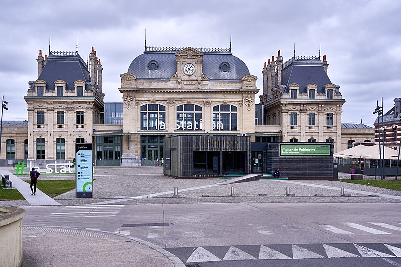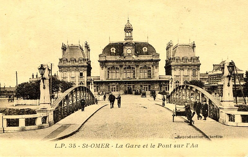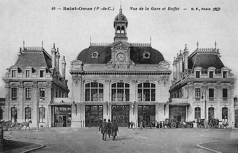 Gare de la ville, le bâtiment voyageurs actuel, de style classique, a été conçu pour la Compagnie des chemins de fer du Nord et dessiné par Clément Ligny ; il a été ouvert en 1904. La station elle-même est mise en service en 1848 et se trouve au point kilométrique 66,407 de la ligne de Lille aux Fontinettes, établie à huit mètres d'altitude ; elle est également l’origine de la ligne de Saint-Omer à Hesdigneul, partiellement déclassée et utilisée pour le fret sur les sections subsistantes et par le chemin de fer touristique de la vallée de l'Aa à partir d'Arques. Dès les premières études de 1837, la municipalité s’était opposée à l’implantation d’un triage sur les marais, si bien que la bifurcation principale fut installée à Hazebrouck, puis Saint-Omer obtint ultérieurement des lignes vers Boulogne et Berguette. Des travaux d’équipement sont réalisés dans les années 1880, et l’intervention d’Alexandre Ribot permet en 1890 une baisse de 50 % des tarifs pour les maraîchers, entraînant une forte hausse des expéditions locales, qui passent de 4 094 tonnes en 1889 à 11 240 tonnes en 1898. Le nouveau bâtiment voyageurs, déclaré d’utilité publique en 1900, est construit sur pieux en chêne et réalisé en pierres blanches de Creil et pierres bleues de Soignies ; son corps central, orné de grandes travées vitrées, de cheminées monumentales, de marquises et de caducées de Mercure, comporte une horloge et les armes de Saint-Omer. Pendant la Première Guerre mondiale, la gare joue un rôle logistique pour l’armée britannique ; la partie centrale du bâtiment est endommagée par les bombardements de la Seconde Guerre mondiale et remise en état en 1948, le clocheton n’ayant pas été rétabli. Inscrit au titre des monuments historiques depuis le 28 décembre 1984, le bâtiment connaît des modernisations : nouveau poste d’aiguillage au début des années 1990 et électrification de la section Hazebrouck–Calais en itinéraire de secours. La liaison TGV quotidienne avec Paris, en place depuis 1994, est supprimée en 2012 pour des raisons de conventionnement et de faible fréquentation depuis Saint-Omer. Le bâtiment voyageurs est fermé en mars 2011 pour risque d’effondrement du plafond ; il est racheté en 2016 par la communauté d’agglomération, qui lance sa réhabilitation afin d’y installer un tiers-lieu à vocation numérique nommé « La Station » et d’y réintroduire un service de vente SNCF. Les travaux, comportant démolition intérieure et désamiantage, débutent en janvier 2017 ; le bâtiment rouvre le 15 novembre 2019, suivi d’un week-end inaugural. Un pavillon modulaire installé sur le parvis, qui préfigurait « La Station », a été réaffecté à plusieurs reprises et son retrait n’est pas prévu avant 2026. Des travaux d’amélioration de l’accessibilité achevés en 2023, pour un coût de 5,73 millions d’euros, ont notamment relevé les quais, posé des surfaces podotactiles et installé des ascenseurs ; un souterrain équipé d’ascenseurs permet la traversée des voies. Selon les estimations de la SNCF, la fréquentation annuelle s’établit à 942 826 voyageurs en 2023, après des variations annuelles comprises entre 622 485 en 2020 et 938 516 en 2019. Gare SNCF desservie par le réseau TER Hauts-de-France, elle assure des relations entre Lille-Flandres, Hazebrouck, Arras, Saint-Omer et Calais-Ville, et voit ponctuellement circuler une rame TGV affrétée pour le pèlerinage à Lourdes. Le bâtiment, géré par une association, accueille des espaces de fab lab et de coworking, conserve des automates et un guichet de vente ouvert tous les jours. La gare dispose d’un parc à vélos, d’un parking et d’une desserte par le réseau urbain Mouvéo ainsi que par les lignes interurbaines Arc‑en‑Ciel 1 (904, 904E, 923) et Oscar (421, 422). Elle possède enfin des voies de service et reste ouverte au fret, exclusivement par train massif.