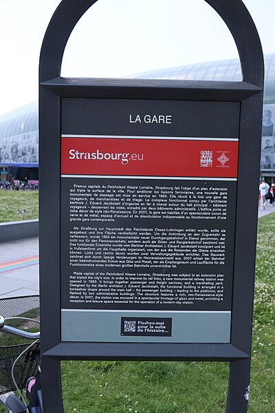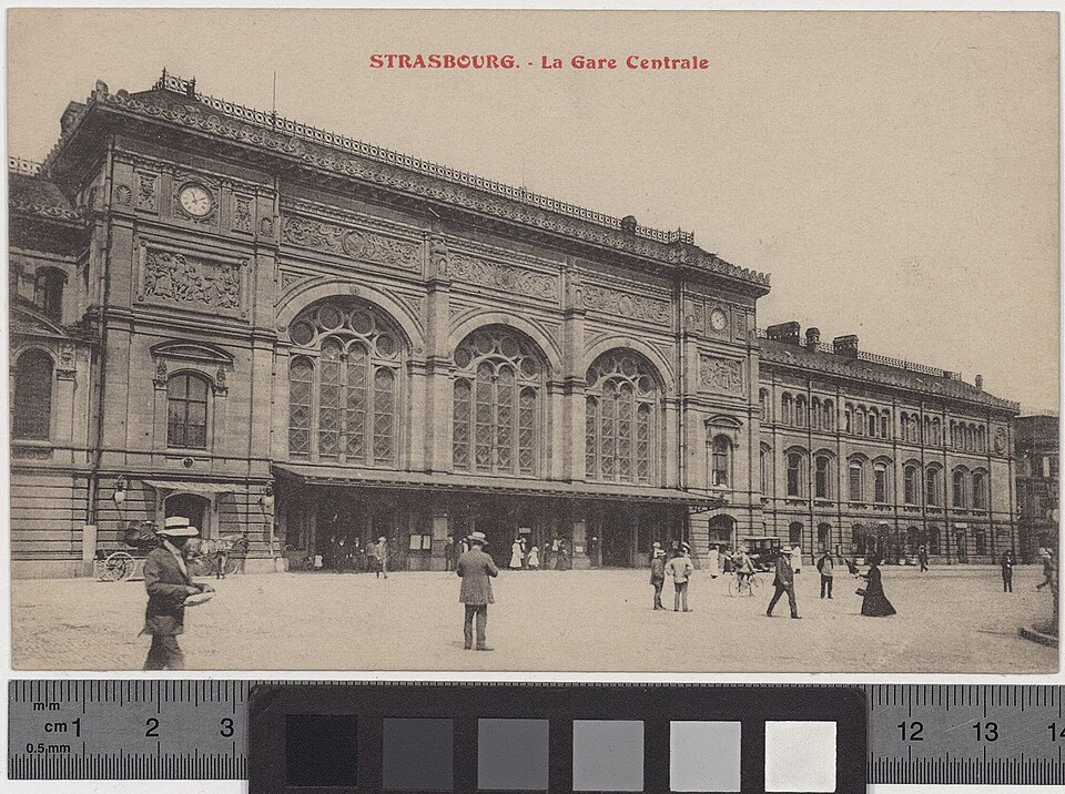 La desserte ferroviaire de Strasbourg débute en 1841 avec un débarcadère provisoire à Koenigshoffen, suivi en 1846 par la gare du Marais-Vert le long du quai Kléber, qui deviendra ensuite une halle de marché et conservera des fonctions marchandises. Le projet d'une nouvelle gare de passage est lancé en 1871 dans le cadre de la Neustadt ; conçu par l'architecte Johann Eduard Jacobsthal et inspiré de la gare de Hanovre, le bâtiment voyageurs est mis en service en 1883, même si des travaux se poursuivent jusqu'à la fin du siècle. Conçue comme gare voyageurs, gare aux marchandises, triage et dépôt, l'installation s'étendait à l'origine sur quelque 37 hectares et s'ouvrait sur une vaste place en hémicycle d'environ 33 000 m², entourée d'axes urbains et d'hôtels.