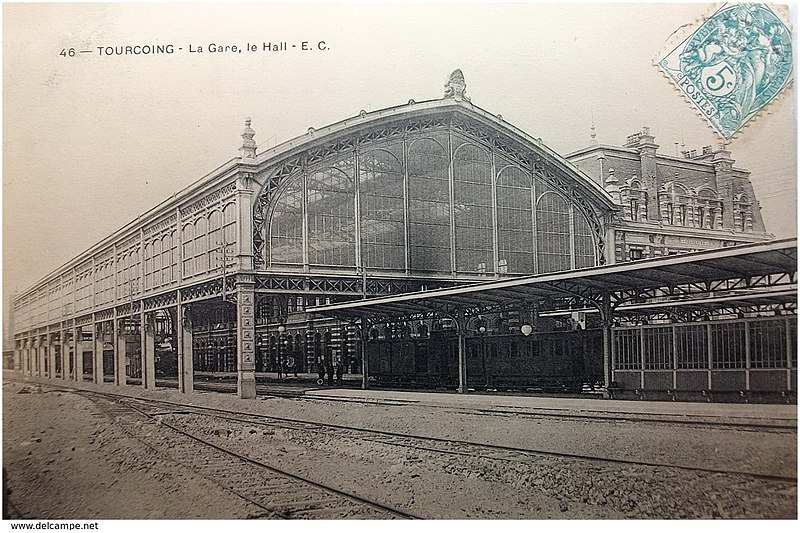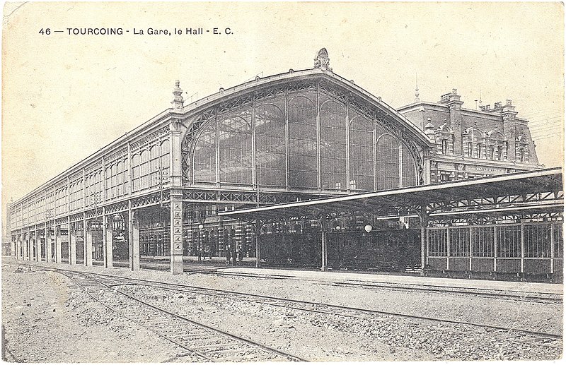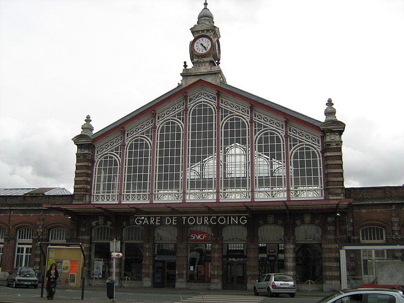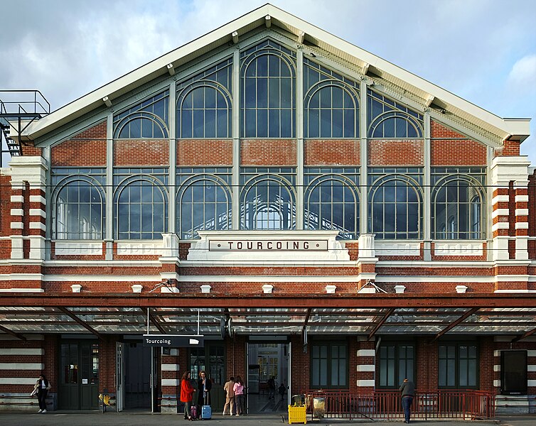 La gare de Tourcoing, située sur les lignes de Fives à Mouscron et de Somain à Halluin, a remplacé une première station mise en service en 1842. L'accroissement du trafic voyageurs et marchandises, notamment lié à l'industrie lainière, a entraîné dès le milieu du XIXe siècle des travaux d'extension puis un projet de gare nouvelle à la fin du siècle. Entre 1897 et 1903 ont été menées des enquêtes et conventionnées l'acquisition et la rétrocession de terrains nécessaires ; le programme prévoyait une gare voyageurs avec hall et quais, des voies séparées pour les services voyageurs et les trains de passage, des voies extérieures pour le fret, des installations pour machines, une usine électrique et, côté frontière, des équipements de marchandises et de douane ainsi qu'un dépôt. Les travaux menés à partir d'avril 1904 s'achèvent en 1905 ; la réalisation a longuement été attribuée à Sydney Dunnett, mais les plans sont signés par les ingénieurs Clément Ligny, M. Aumont et Vainey, qui se sont inspirés de la gare voisine de Roubaix. L'édifice, de style néo‑Louis XIII mêlant brique et pierre, présente un corps central long de 110 mètres encadré de pavillons à haute mansarde, un hall central ouvert sur un pignon métallique vitré surmonté d'une horloge, et une grande halle métallique abritant les quais. La façade, rythmée par des pilastres alternant pierre et brique, abritait autrefois un hôtel, un bureau de poste, un restaurant, des logements et des services tels que télégraphe et douane, adaptés à son rôle de gare frontière. La nouvelle gare, organisée autour d'une cour pavée donnant sur plusieurs rues en éventail, a été inaugurée lors de l'exposition de 1906 en présence du président de la République. La partie commerciale, correspondant à la halle des voyageurs, a été rénovée en 1982 et le bâtiment voyageurs a fait l'objet d'une inscription au titre des monuments historiques depuis le 28 décembre 1984. Pendant la Seconde Guerre mondiale, la gare fut le point de départ du « Train de Loos » le 1er septembre 1944, convoi de déportation de prisonniers politiques. L'ouverture partielle de la LGV Nord en 1993 a modifié les relations longues distances, les TGV remplaçant une partie des trains Corail. En décembre 2015, l'arrivée de services Ouigo a nécessité des aménagements et entraîné une forte hausse de fréquentation, qui passa d'environ 169 000 voyageurs en 2015 à plus d'un million en 2017 avant de se replier sous l'effet de la pandémie et de remonter à 710 223 en 2023. La collectivité a racheté l'ancienne halle Sernam en 2018 puis l'a cédée à un promoteur en 2019 en vue d'une réhabilitation mixte ; parallèlement, entre 2020 et 2022, le bâtiment voyageurs et ses abords ont fait l'objet d'un chantier de restauration et de création d'un pôle d'échanges, d'un coût de 7,2 millions d'euros, incluant la requalification des espaces publics, un garage à vélos et un parking relais de 270 places. Un garage de rames TGV est implanté à l'est de la gare, intégré au Technicentre Nord‑Pas‑de‑Calais, pour compenser la saturation du technicentre de Fives et assurer l'entretien courant de rames, dont des Duplex utilisés par Ouigo. Aujourd'hui, la gare conserve sa double vocation historique — desserte voyageurs et facilités pour le fret et la frontière — tout en ayant été adaptée aux évolutions ferroviaires et aux besoins d'intermodalité.