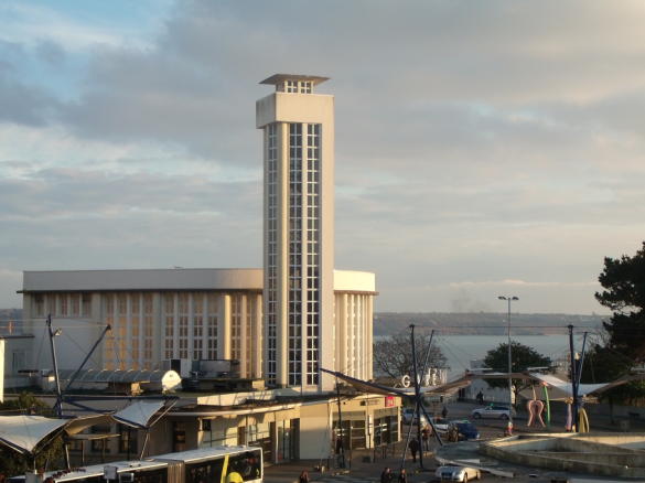 Le bâtiment voyageurs actuel, élevé dans les années 1930 par l'architecte Urbain Cassan (1890-1979), se signale par une tour d'horloge et un corps central en hémicycle percé de hautes verrières qui éclairent le vaste hall. L'emploi maîtrisé du béton confère à l'édifice des lignes élégantes et équilibrées, qui s'accordent à la physionomie de la ville reconstruite après la Seconde Guerre mondiale. Un bas-relief en granit rose sculpté par Lucien Brasseur orne encore la partie basse de la tour ; la partie haute, endommagée pendant la guerre, n'a pas été conservée lors de la rénovation d'après-guerre.