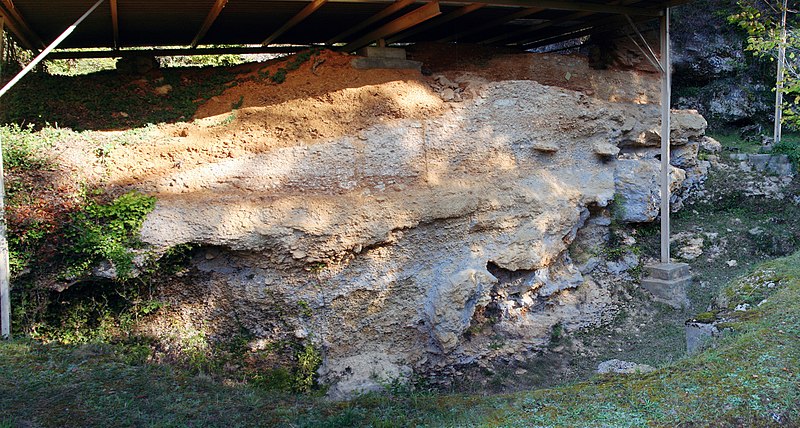 Selon cette étude de 1993, les dépôts se subdivisent en trois ensembles sédimentaires imbriqués. L’ensemble inférieur, riche en galets et graviers et sans vestiges archéologiques, correspond aux couches I à XII distinguées par Laville et Rigaud. L’ensemble moyen, qui regroupe pratiquement tous les niveaux archéologiques, comprend à sa base une unité argileuse et des lits de galets et graviers calcaires granoclassés intercalés de niveaux rouges sablo-argileux ; la couche L2/3 (SIO 10), attribuée par F. Bordes à l’Acheuléen méridional, a livré une industrie centrée sur la production d’éclats. L’ensemble supérieur, sablo-argileux et d’épaisseur moyenne, est absent de la coupe témoin actuelle ; le niveau ayant conduit à la définition du Micoquien pourrait se situer à la base de cet ensemble mais n’a pas été retrouvé dans les fouilles récentes. Les galets et graviers des ensembles inférieur et moyen sont désormais interprétés comme des dépôts alluviaux liés à des chenaux fluviaux tressés, comme l’attestent aussi des gastéropodes d’eaux tempérées ; les niveaux rouges résultent d’écoulements en masse provenant du versant et non de paléosols lessivés. Des données géologiques et des datations (ESR et U/Th) situent les ensembles inférieur et moyen entre les stades isotopiques 12 et 10, la phase interglaciaire à la base de l’ensemble moyen étant vraisemblablement le SIO 11, tandis que l’ensemble supérieur semble s’être mis en place à l’Holocène.