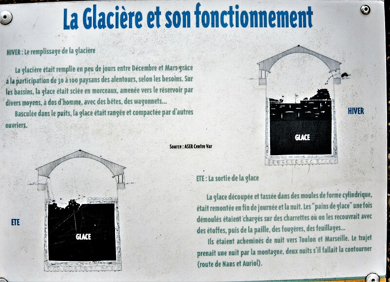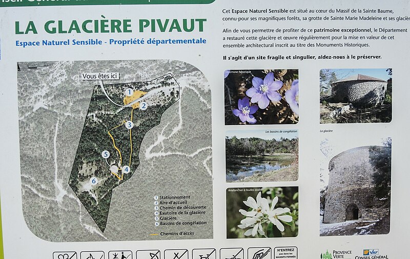 La glacière du Gaudin, dite de Pivaut, est située au lieu-dit Le Gaudin sur la commune de Mazaugues (Var). Représentative des glacières de la Sainte-Baume, elle a été construite dans les années 1880 mais n'a été utilisée que quelques années en raison des progrès techniques de l'époque. Semi-enterrée et bâtie en grès, la glacière mesure 23 mètres de hauteur et 17,60 mètres de diamètre ; elle pouvait conserver 3 100 m3 de glace. Sa cuve est fermée par une voûte en forme de coupole et la charpente, en pierre, prend la forme d'arcades qui convergent au sommet vers une pierre taillée en forme d'épi. Immédiatement derrière la glacière ont été aménagés trois bassins de congélation destinés à l'alimenter en hiver ; leur surface totale est de 5 000 m2 pour une hauteur d'eau de 15 cm. Chaque bassin offre une capacité d'environ 750 m3 et ils sont séparés par des butées de terre et des blocs de pierre. L'ensoleillement des bassins est atténué par une légère inclinaison et la présence de grands chênes ; il fallait entre deux et quatre gelées des bassins pour remplir la glacière. La documentation et les ressources en ligne citent notamment l'article « La grande glacière Pivaut à Mazaugues », le portail du Var, le portail du froid et de la climatisation et la base Mérimée.