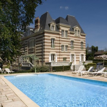 Le Grand Hôtel d'Houlgate, édifié par l'architecte caennais Jacques-Claude Baumier en 1859, est l'un des édifices les plus remarquables du patrimoine balnéaire de la Côte Fleurie. Sa construction s'inscrit dans le projet urbain mené par Baumier qui, dès 1858, a fondé avec d'autres personnalités une société civile immobilière pour développer la station de Beuzeval, aujourd'hui Houlgate, et a tracé son premier plan d'urbanisme. Le corps central réalisé en 1859 a été prolongé par deux pavillons ajoutés par son fils René-Jacques Baumier vers 1896-1897, puis complété en 1904 par une rotonde couronnée d'un dôme à l'angle ouest. Transformé en immeuble d'habitations sous le nom de résidence Les Pléiades, l'édifice fait l'objet d'une inscription au titre des monuments historiques depuis 2000 : sont protégées les façades et les toitures de l'hôtel, y compris celles de la maison de gardien, à l'exception du bâtiment des anciennes écuries. Implanté le long de la rue Baumier, parallèle à la mer, il est séparé de la plage par un jardin en terrasses aménagé en parcours de minigolf et par le casino situé en contrebas. Le bâtiment présente un corps central rythmé par des pilastres d'ordre colossal en brique et un étage d'attique doté d'un balcon en ferronnerie, encadré par deux pavillons en légère saillie qui reprennent le style d'origine avec une décoration extérieure plus riche — chaînages alternés de brique et de pierre, balcons de pierre et lucarnes ouvragées. La rotonde surmontée d'un dôme, accolée au pavillon occidental, achève la silhouette de l'ensemble.