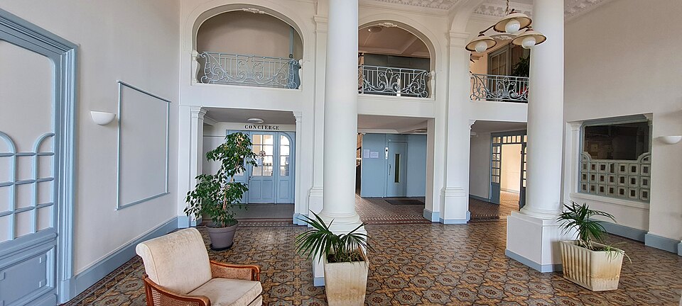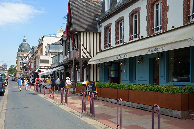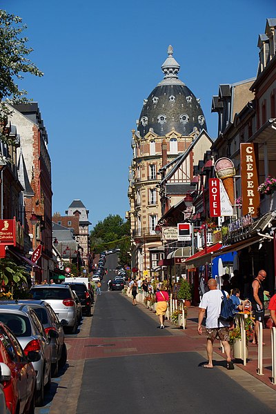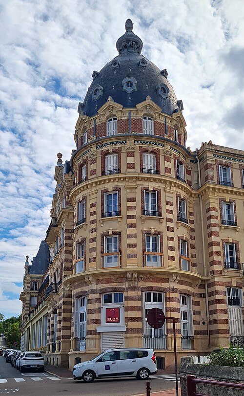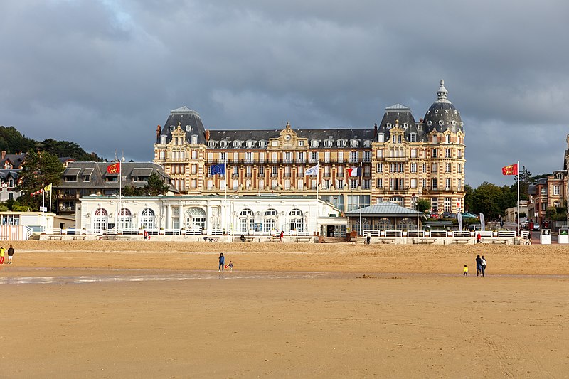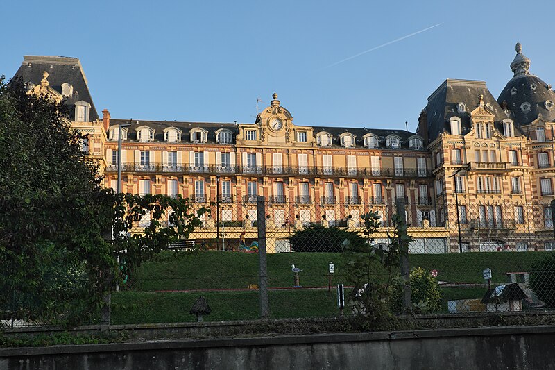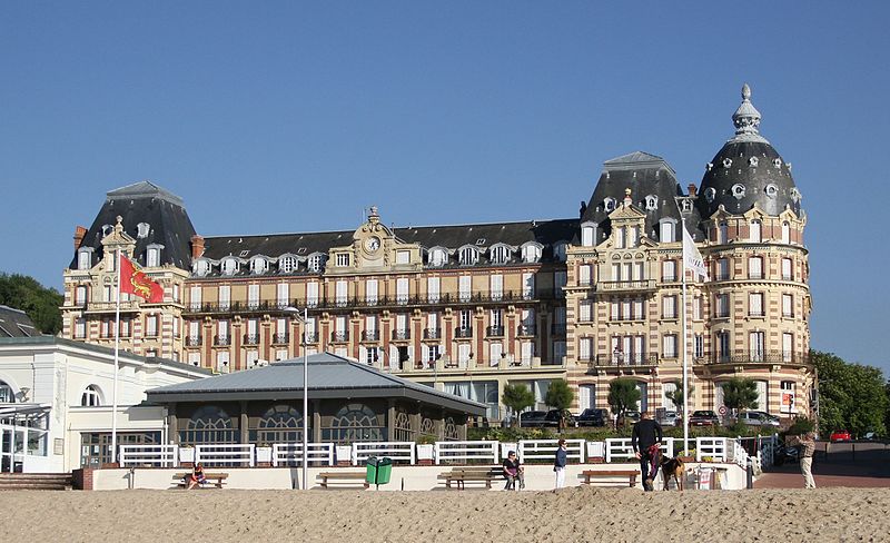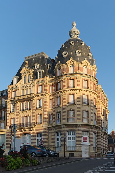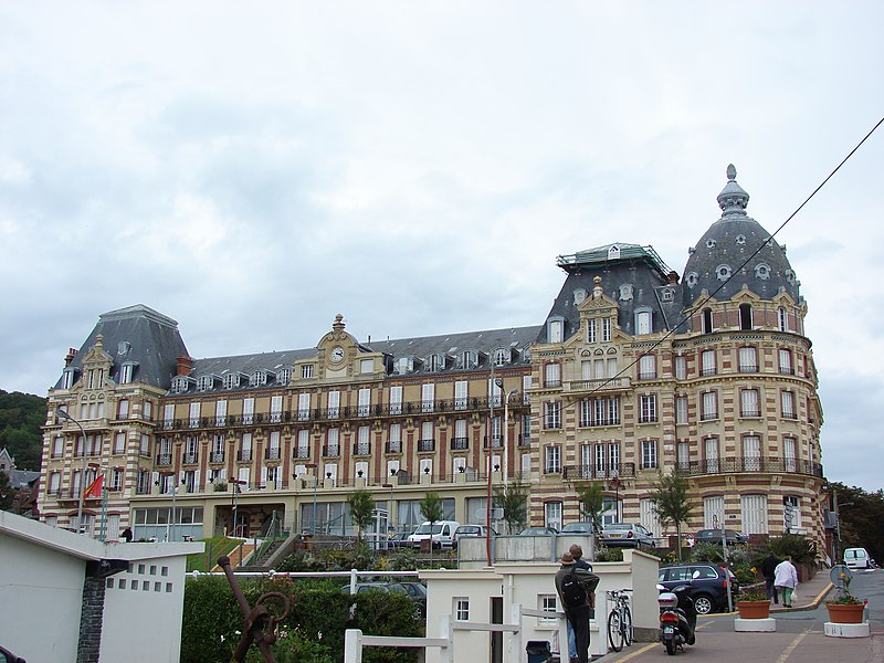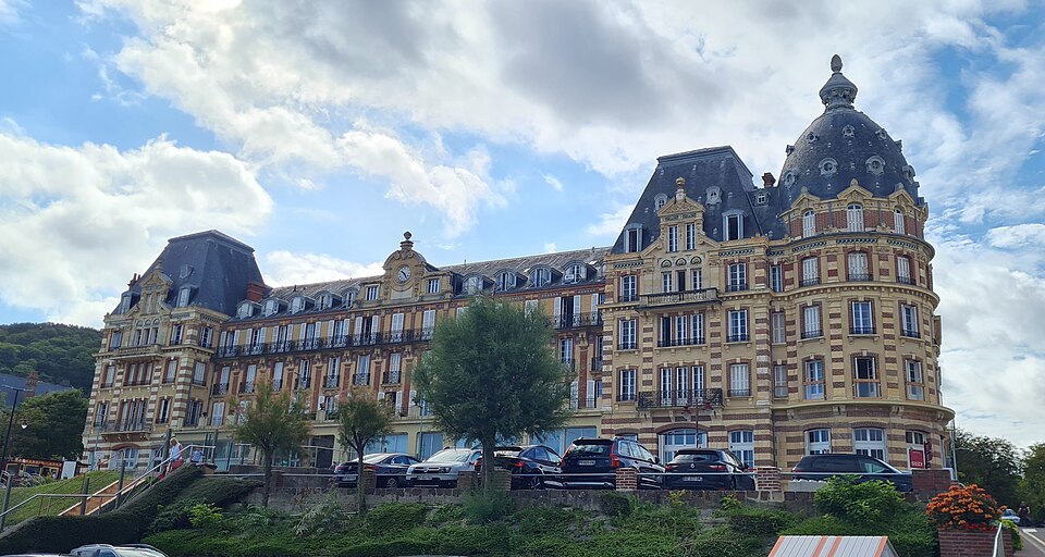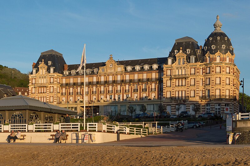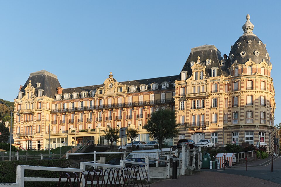 Le Grand Hôtel d'Houlgate, édifié par l'architecte caennais Jacques-Claude Baumier en 1859, est l'un des édifices les plus remarquables du patrimoine balnéaire de la Côte Fleurie. Sa construction s'inscrit dans le projet urbain mené par Baumier qui, dès 1858, a fondé avec d'autres personnalités une société civile immobilière pour développer la station de Beuzeval, aujourd'hui Houlgate, et a tracé son premier plan d'urbanisme. Le corps central réalisé en 1859 a été prolongé par deux pavillons ajoutés par son fils René-Jacques Baumier vers 1896-1897, puis complété en 1904 par une rotonde couronnée d'un dôme à l'angle ouest. Transformé en immeuble d'habitations sous le nom de résidence Les Pléiades, l'édifice fait l'objet d'une inscription au titre des monuments historiques depuis 2000 : sont protégées les façades et les toitures de l'hôtel, y compris celles de la maison de gardien, à l'exception du bâtiment des anciennes écuries. Implanté le long de la rue Baumier, parallèle à la mer, il est séparé de la plage par un jardin en terrasses aménagé en parcours de minigolf et par le casino situé en contrebas. Le bâtiment présente un corps central rythmé par des pilastres d'ordre colossal en brique et un étage d'attique doté d'un balcon en ferronnerie, encadré par deux pavillons en légère saillie qui reprennent le style d'origine avec une décoration extérieure plus riche — chaînages alternés de brique et de pierre, balcons de pierre et lucarnes ouvragées. La rotonde surmontée d'un dôme, accolée au pavillon occidental, achève la silhouette de l'ensemble.