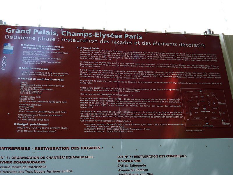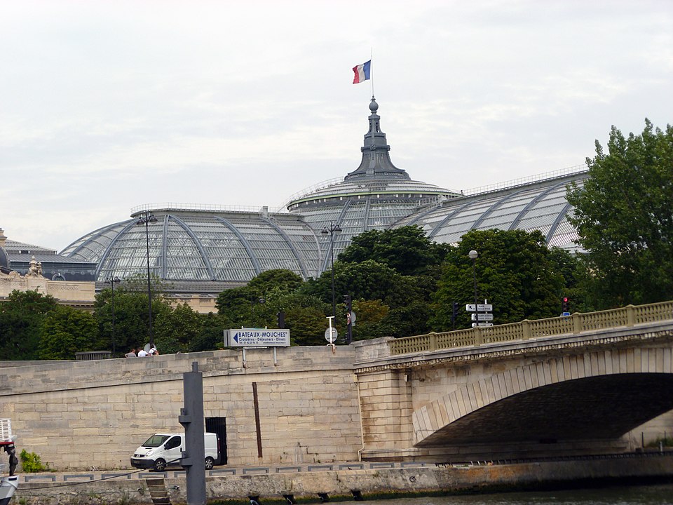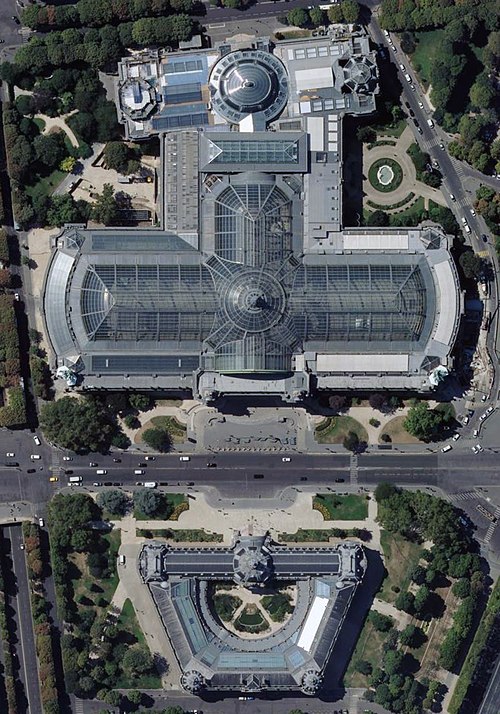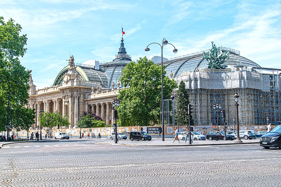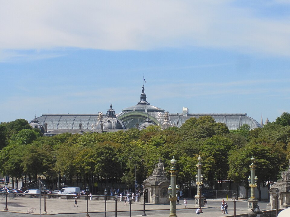 Le Grand Palais, situé en bordure des Champs‑Élysées dans le 8e arrondissement de Paris et faisant face au Petit Palais de l'autre côté de l'avenue Winston‑Churchill, accueille sur 77 000 m2 salons et expositions. Construit pour l'Exposition universelle de 1900 à partir d'un concours national, il a été réalisé par une synthèse des projets d'Henri Deglane, Albert Louvet, Albert Thomas et Charles Girault. De style néo‑Louis XIV avec des références au XVIIIe siècle et des influences Art nouveau, l'édifice associe façades en pierre de taille, charpente métallique couverte d'une vaste verrière et éléments en béton armé. Son décor, dû à divers artistes, comprend notamment les quadriges de Georges Récipon et la grande frise en mosaïque dessinée par Louis‑Édouard Fournier et exécutée par Guilbert‑Martin. L'ensemble réunit la grande nef, les Galeries nationales et le Palais de la découverte, installé dans l'aile ouest à l'occasion de l'Exposition de 1937 puis pérennisé. Dès l'origine, le Grand Palais est destiné aux grandes manifestations artistiques officielles, mais il reçoit aussi une grande diversité d'événements : salons d'art, concours hippiques, salons techniques et commerciaux, présentations automobiles et aéronautiques, foires, concerts et spectacles. Les salons artistiques connaissent leur apogée dans les premières décennies, puis cèdent progressivement de l'espace aux expositions techniques et commerciales, notamment après l'installation du Palais de la découverte. Pendant la Première Guerre mondiale, le bâtiment sert d'hôpital militaire ; pendant la Seconde Guerre mondiale il est réquisitionné et utilisé à diverses fins, y compris pour des expositions organisées par des collaborateurs. Le monument a traversé des périodes de désaffection et de réaménagement : partiellement désaffecté dans les années 1950‑1960, il voit à partir de 1965 l'aménagement des Galeries nationales. La nef a été classée au titre des monuments historiques en 1975 et l'ensemble du Grand Palais a été protégé en 2000. Le bâtiment a souffert de pathologies structurelles liées aux fondations, à la nature alluvionnaire du terrain, à la corrosion de la charpente et aux sollicitations liées aux usages, ce qui a rendu nécessaires des interventions répétées. Après l'alerte de 1993 due au détachement d'un élément de rivetage, le monument a été fermé provisoirement puis l'objet d'une importante campagne de restauration conduite au début des années 2000 ; les travaux ont porté sur la reprise en sous‑œuvre des fondations, la réparation des maçonneries, la restauration de la verrière, la consolidation de la charpente et la remise en état des décors. La mise en œuvre et le financement des opérations ont été assurés par les services de l'État puis par l'établissement public du Grand Palais, qui a pour mission de préserver, valoriser, aménager et exploiter ce patrimoine et d'en assurer la programmation culturelle, scientifique et économique. Une opération de rénovation plus récente a été conduite pour adapter le monument aux usages contemporains et aux événements internationaux, avec la mise en place d'une structure temporaire pour accueillir les manifestations pendant les travaux. La richesse architecturale du Grand Palais tient à l'imposant vaisseau couvert d'une verrière, à l'articulation entre pierre et métal et à la qualité des décors extérieurs et intérieurs, qui en font un témoin majeur de l'éclectisme et des techniques de la Belle Époque. Accessible depuis les stations Franklin D. Roosevelt et Champs‑Élysées–Clemenceau, le Grand Palais demeure une adresse centrale de la vie culturelle parisienne.
