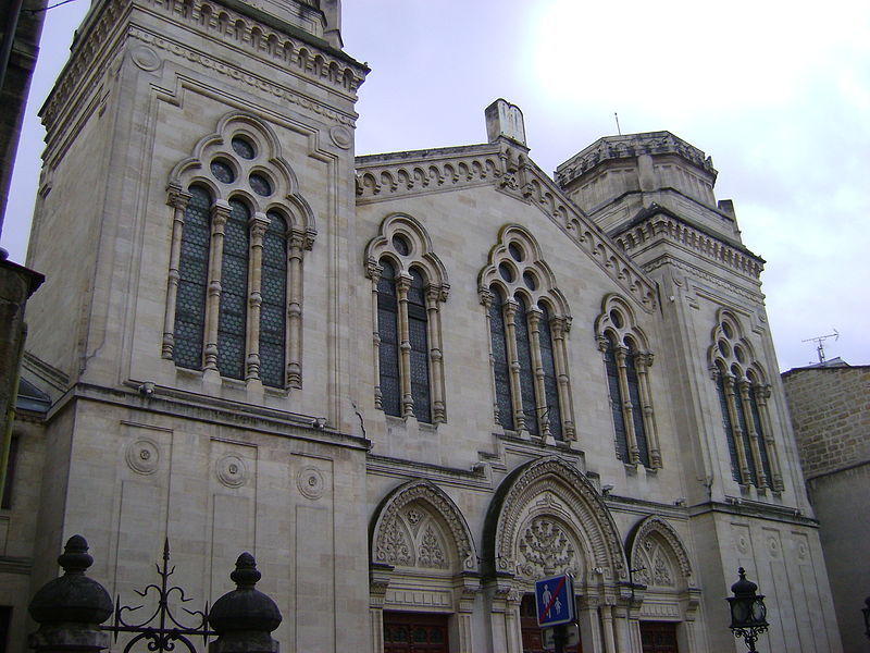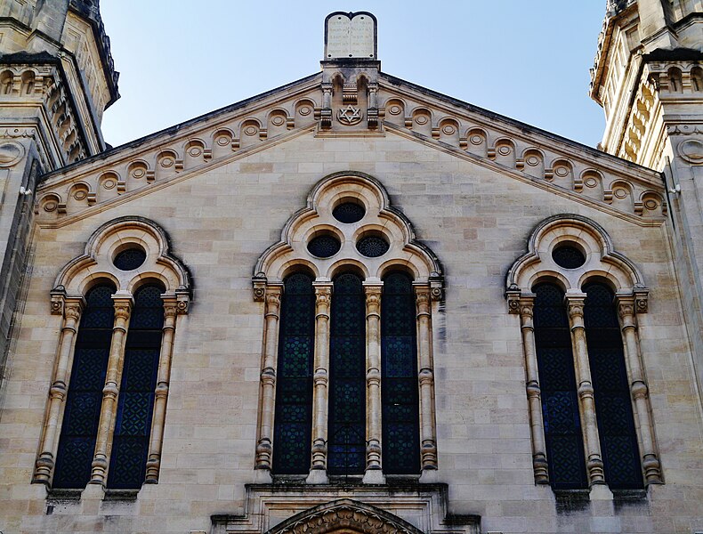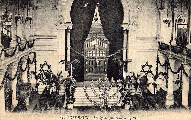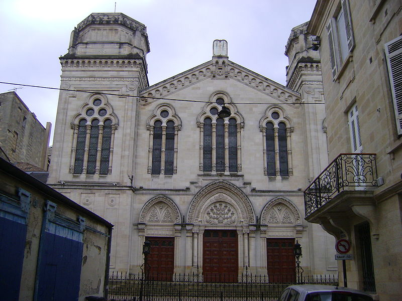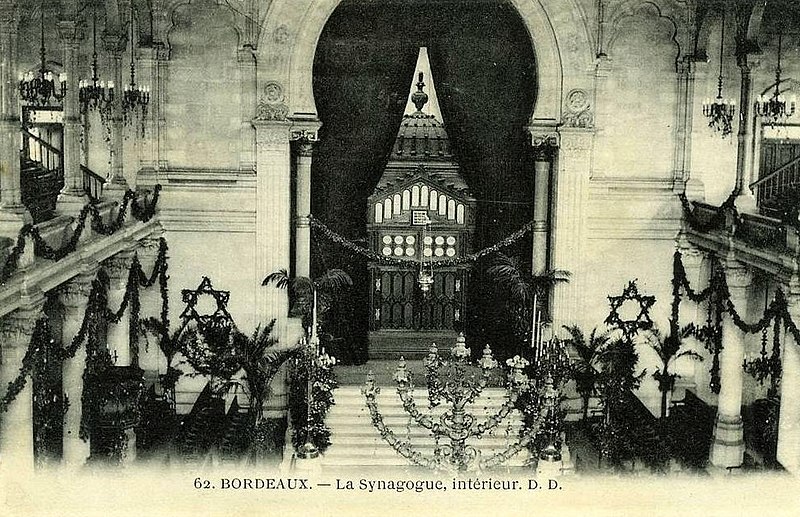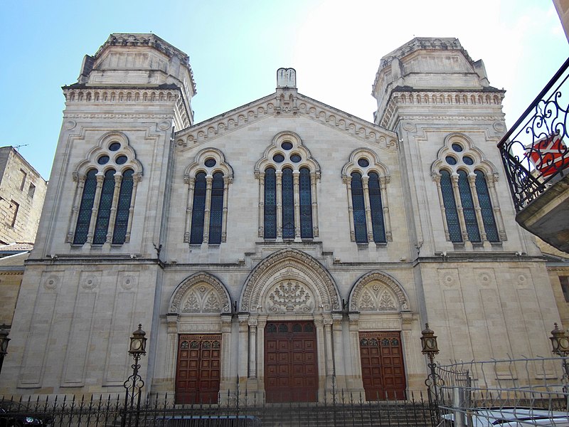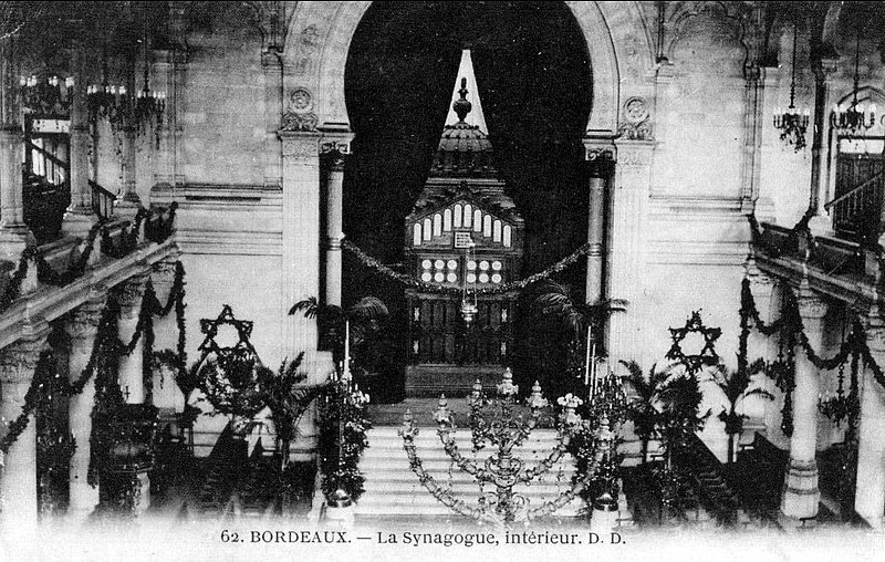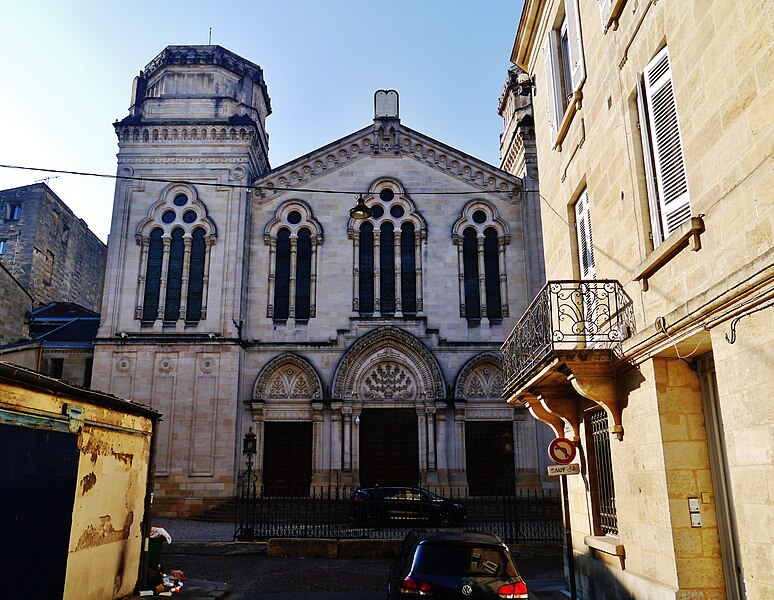 La grande synagogue de Bordeaux, située en Gironde, est le principal lieu de culte israélite de la ville. Construite sur les dessins de Charles Burguet puis de Charles Durand, l'édifice d'inspiration gothique et orientale a été élevé entre 1877 et 1882 pour succéder à une synagogue incendiée en 1873. Financé par les familles Pereire, Rothschild et Iffla Osiris, il est le siège de la communauté séfarade venue d'Espagne. Classée monument historique depuis 1998, elle figure parmi les plus vastes synagogues d'Europe. Pendant l'occupation allemande, la synagogue fut pillée et transformée en lieu d'internement de la fin de 1943 jusqu'à la Libération ; son mobilier fut détruit ou pillé en novembre 1943, mais son architecture resta intacte. Près de 1 600 familles y furent emprisonnées avant d'être déportées vers les camps, et la synagogue servit d'annexe à la prison du Hâ pour certains détenus. Un convoi de résistants et de prisonniers, dont Albert Lautman, fut lié à des événements tragiques et à des transferts entre gares et lieux de détention, certains prisonniers ayant ensuite été exécutés après sélection par les autorités allemandes. Aujourd'hui, la synagogue, située rue du Grand-Rabbin-Joseph-Cohen à proximité de la rue Sainte-Catherine, reste un centre actif de la communauté juive bordelaise, avec des offices matin et soir. L'édifice combine des traits gothiques et des influences orientalistes, courantes à l'époque de sa construction. Sa façade monumentale est flanquée de deux tours ; le projet initial prévoyait de les surmonter de bulbes octogonaux, mais ces travaux n'ont pas été menés à terme. Le bâtiment forme un vaisseau de 36 mètres sur 26 mètres et adopte un plan basilical avec un vaisseau central séparé des collatéraux par quatorze colonnes corinthiennes. Des tribunes supérieures, appelées mekhitsa, accueillent traditionnellement les femmes. Au fond du sanctuaire, l'arche sainte (heckal) s'inscrit dans une grande arcade en arc outrepassé et est ornée d'un rideau de velours aux teintes grenat. La tebah occupe la partie centrale et précède un monumental chandelier à sept branches, une menorah de près de 4,50 mètres. Le couvrement est une structure métallique porteuse en tôle rivetée réalisée par les ateliers de Gustave Eiffel ; l'ossature, dissimulée sous un stucage peint, soutient une voûte en anse de panier bordée de berceaux transversaux, l'ensemble atteignant plus de 16 mètres. Cette armature métallique permet de dégager un vaste espace intérieur et contribue à l'effet de monumentalité de l'édifice.