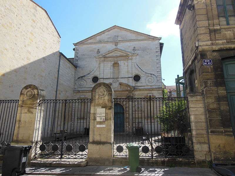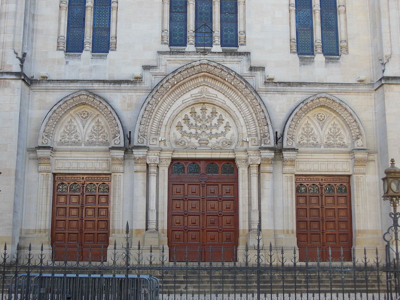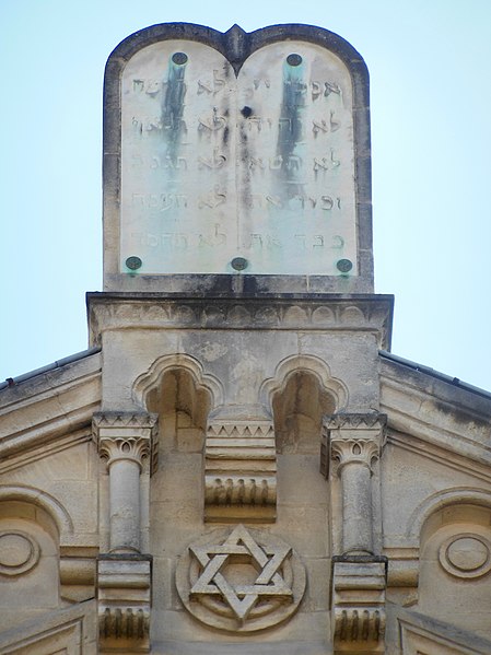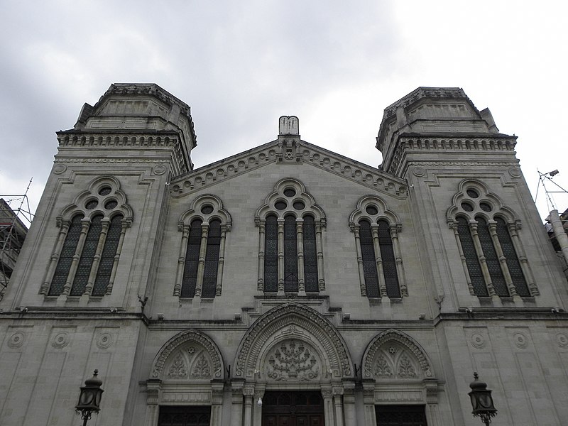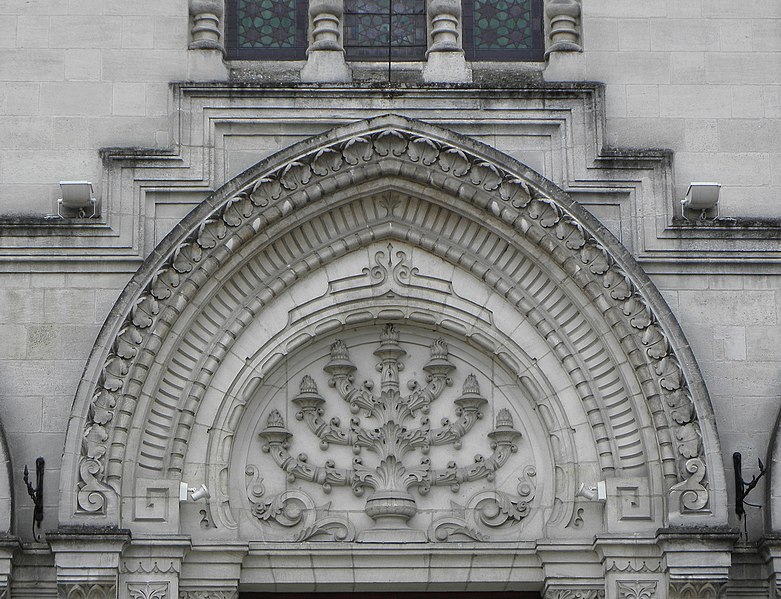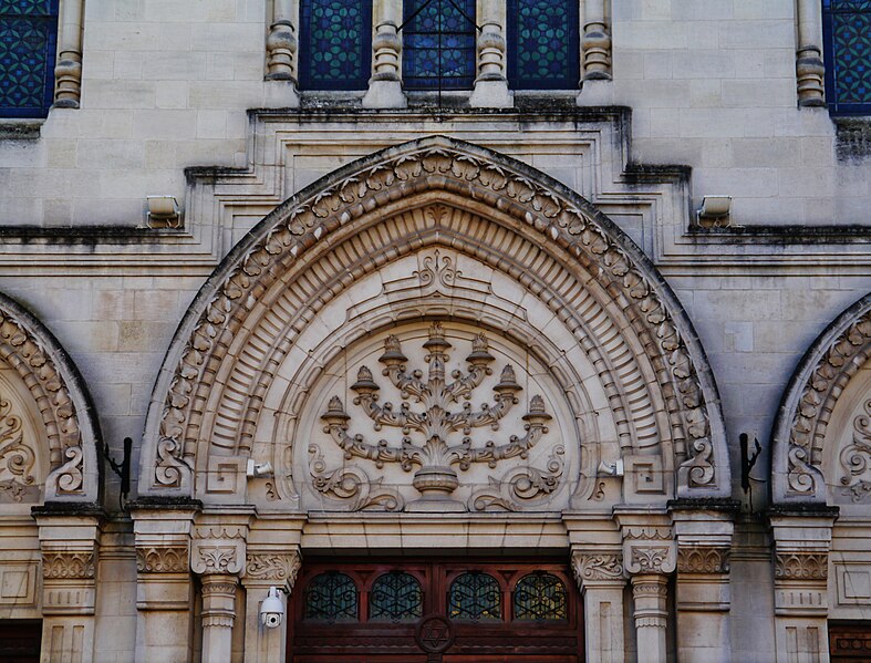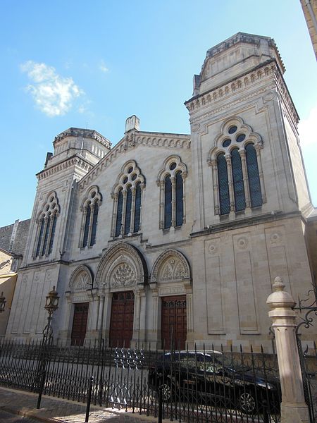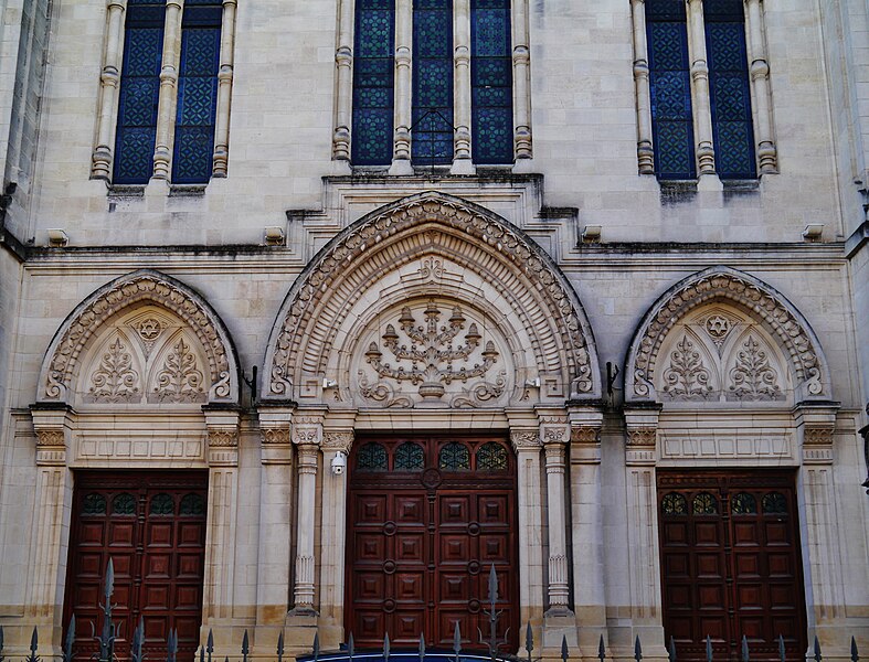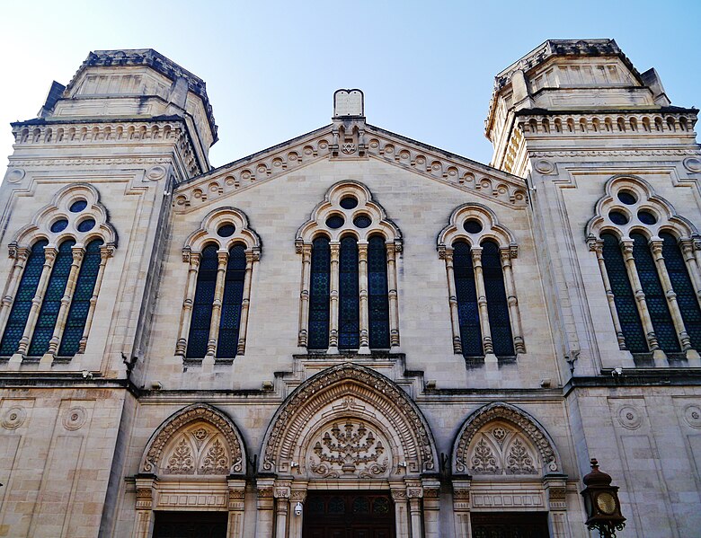 La grande synagogue de Bordeaux, située en Gironde, est le principal lieu de culte israélite de la ville. Construite sur les dessins de Charles Burguet puis de Charles Durand, l'édifice d'inspiration gothique et orientale a été élevé entre 1877 et 1882 pour succéder à une synagogue incendiée en 1873. Financé par les familles Pereire, Rothschild et Iffla Osiris, il est le siège de la communauté séfarade venue d'Espagne. Classée monument historique depuis 1998, elle figure parmi les plus vastes synagogues d'Europe. Pendant l'occupation allemande, la synagogue fut pillée et transformée en lieu d'internement de la fin de 1943 jusqu'à la Libération ; son mobilier fut détruit ou pillé en novembre 1943, mais son architecture resta intacte. Près de 1 600 familles y furent emprisonnées avant d'être déportées vers les camps, et la synagogue servit d'annexe à la prison du Hâ pour certains détenus. Un convoi de résistants et de prisonniers, dont Albert Lautman, fut lié à des événements tragiques et à des transferts entre gares et lieux de détention, certains prisonniers ayant ensuite été exécutés après sélection par les autorités allemandes. Aujourd'hui, la synagogue, située rue du Grand-Rabbin-Joseph-Cohen à proximité de la rue Sainte-Catherine, reste un centre actif de la communauté juive bordelaise, avec des offices matin et soir. L'édifice combine des traits gothiques et des influences orientalistes, courantes à l'époque de sa construction. Sa façade monumentale est flanquée de deux tours ; le projet initial prévoyait de les surmonter de bulbes octogonaux, mais ces travaux n'ont pas été menés à terme. Le bâtiment forme un vaisseau de 36 mètres sur 26 mètres et adopte un plan basilical avec un vaisseau central séparé des collatéraux par quatorze colonnes corinthiennes. Des tribunes supérieures, appelées mekhitsa, accueillent traditionnellement les femmes. Au fond du sanctuaire, l'arche sainte (heckal) s'inscrit dans une grande arcade en arc outrepassé et est ornée d'un rideau de velours aux teintes grenat. La tebah occupe la partie centrale et précède un monumental chandelier à sept branches, une menorah de près de 4,50 mètres. Le couvrement est une structure métallique porteuse en tôle rivetée réalisée par les ateliers de Gustave Eiffel ; l'ossature, dissimulée sous un stucage peint, soutient une voûte en anse de panier bordée de berceaux transversaux, l'ensemble atteignant plus de 16 mètres. Cette armature métallique permet de dégager un vaste espace intérieur et contribue à l'effet de monumentalité de l'édifice.