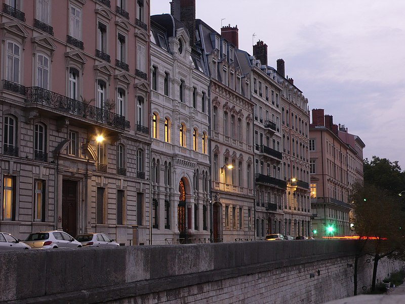 L'ensemble se compose de deux bâtiments : un immeuble en façade sur le quai Tilsitt de 160 m2 et un bâtiment en retrait de 550 m2, séparés par une cour de 120 m2. Le bâtiment sur rue, discret extérieurement, abrite les bureaux du consistoire, ceux du grand-rabbin et du rabbin, un petit oratoire pour les offices en semaine, une salle de conférence et des salles de cours pour le Talmud Torah ; l'accès au bâtiment principal s'effectue par un porche sous le premier bâtiment, fermé par une grille en fer forgé. Un vestibule, ouvert sur la cour par trois arcs en plein cintre, mène à la salle de prières par trois portes en bois ; la grande salle rectangulaire se divise en une nef centrale à hauteur totale et deux collatéraux plus bas, séparés par douze colonnes symbolisant les douze tribus d'Israël, chacune surmontée d'un chapiteau de style corinthien ou composite. Au-dessus des collatéraux et du vestibule se trouvent des galeries pour les femmes, protégées par des balustrades à colonnettes en pierre.