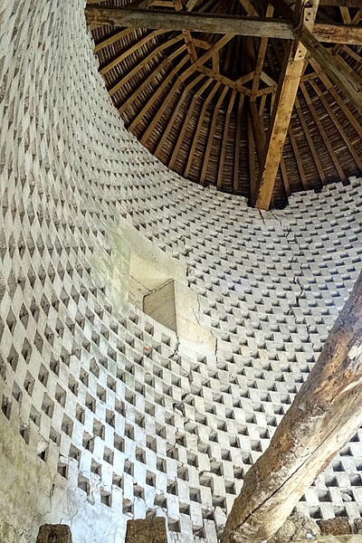 Le domaine de la grange cistercienne de Vollerand, situé à Villeron dans la plaine de France à l'est du Val-d'Oise, appartient à l'abbaye de Chaalis depuis le XIIe siècle et conserve une fonction agricole continue. Une description de 1315 mentionne la grange, une bâtisse, une bergerie et une maison, l'ensemble clos de murs ; la grange et les deux niveaux inférieurs des caves datent de cette époque. Le toponyme Vaulerent, issu du latin Vallis Laurentii, a connu de nombreuses graphies (Vallorens, Vaulaurent, Volleron, Vaulerand, Vaulerant) ; les chercheurs retiennent généralement Vaulerent comme la forme la plus proche de l'étymologie. Implanté sur un large plateau de calcaire de Saint-Ouen recouvert de limons, le domaine occupe des terres réputées fertiles, isolées au milieu de champs ouverts à environ 800 mètres du centre du village et à proximité d'une ancienne voie reliant Paris et Senlis. Dès la fondation de Chaalis, la seigneurie et des donations multiples ont permis d'agrandir le domaine : acquisitions et remembrements ont conduit, au milieu du XIIIe siècle, à une superficie estimée entre 320 et 380 hectares en un seul bloc. Exploité en faire-valoir direct par les moines convers jusqu'au début du XIVe siècle, le domaine passa ensuite majoritairement en affermage ; l'inventaire de 1315 cite notamment 500 moutons et un fermage fixé à 1 123,80 hectolitres de blé. Malgré les crises du bas Moyen Âge et les dommages subis durant la guerre de Cent Ans, la grange et la ferme restèrent des éléments centraux d'une exploitation parmi les plus productives de la région. En 1791 les terres furent vendues comme biens nationaux et entrèrent dans les possessions de Louis-Michel Lepeletier de Saint-Fargeau ; par la suite la propriété changea plusieurs fois de mains jusqu'à l'installation de la famille Lecerf à la fin du XIXe siècle. Dès le début du XXe siècle Émile Lecerf fit construire une distillerie et fit évoluer la maison de maître ; la distillerie fonctionna jusqu'aux années 1970 et fut transformée en 1946. La grange elle-même, datée globalement du XIIIe siècle, mesure 72 mètres de long sur 23 mètres de large et couvre au sol 1 656 m2, ce qui en fait l'un des édifices agricoles cisterciens les plus imposants en France. Édifiée en pierre de Saint-Ouen, elle offre deux files d'arcades qui divisent l'espace en trois vaisseaux de treize travées, soutenus par douze piliers carrés ; les arcs brisés atteignent 13 mètres de hauteur et la charpente repose sur ces arcades et sur les murs gouttereaux. Le pignon sud-ouest, élevé à plus de vingt mètres, porte une tourelle d'escalier qui conduit à une petite salle de guet ; cet appareil, distinct du reste du mur, semble résulter d'aménagements liés à la fortification du domaine. À l'intérieur, des corbeaux rappellent l'existence d'une charpente ancienne ; le sol est aujourd'hui bétonné et le bâtiment conserve sa vocation de stockage. L'ensemble de la ferme est ceinturé par un mur en pierre, sans doute remanié au XIVe siècle et flanqué de deux tours en poivrière attribuées au XVe siècle, et comprenait autrefois un verger et un potager aujourd'hui transformés en champs. Parmi les autres éléments remarquables figurent un colombier circulaire attribué aux XVIe–XVIIe siècles, un puits et des caves voûtées dont l'une, profonde et voûtée en croisées d'ogives, est datée aux alentours de 1200. La grange a été classée au titre des monuments historiques dès 1889 ; le colombier, le puits et les caves ont été inscrits en 1990, et des restaurations ont depuis été menées sur certaines parties. La ferme s'est modernisée au XXe siècle ; les descendants de la famille Lecerf, aujourd'hui Plasmans, restent propriétaires d'une exploitation qui s'étend désormais sur environ 500 hectares et s'est diversifiée vers la betterave, le blé, l'oignon et la pomme de terre, avec une unité de conditionnement et une commercialisation sous la marque « Primanord ». La grange, qui n'est pas ouverte au public, est évoquée par une tradition orale la surnommant « grange du diable » et figure ponctuellement dans des présentations muséales, notamment une maquette au musée Archéa. Les études menées sur Vaulerent, en particulier celles de Charles Higounet et de chercheurs en architecture, ont fait de ce site un exemple majeur pour l'histoire des exploitations cisterciennes et de l'agriculture médiévale.