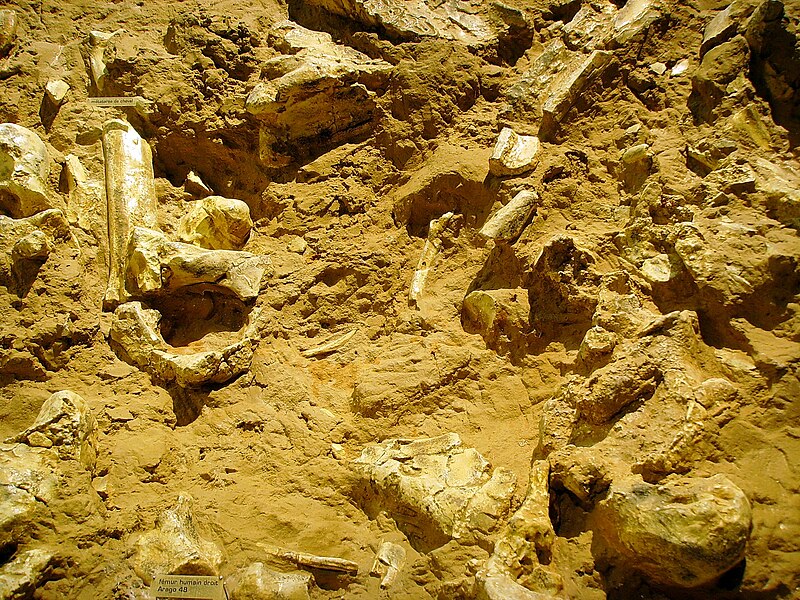 La faune retrouvée sur le site comprend 122 espèces, parmi lesquelles le cheval Equus mosbachensis tautavelensis et le bison Bison priscus figurent en abondance dans le niveau G, aux côtés de rennes, cerfs, daims, bœufs musqués, mouflons, tahrs, rhinocéros et d'ours de Deninger. La stratigraphie témoigne d'un remplissage puissant couvrant l'essentiel du Pléistocène moyen, avec des datations parfois contradictoires ; des datations uranium‑thorium donnent des âges limites d'environ 700 000 et 350 000 ans pour des planchers stalagmitiques situés à la base et au sommet de la séquence. Les principaux niveaux archéologiques se trouvent dans l'ensemble III (sols D à G), attribué à une fourchette de 300 000 à 450 000 ans, et a livré plusieurs restes humains dont un crâne incomplet (Arago XXI, sol G) et deux mandibules (Arago II, sol G et Arago XIII, sol F).