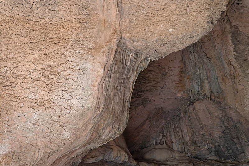 La cavité s'ouvre au sud à 85 mètres d'altitude, sur la rive gauche de l'Ardèche, à 2,5 km au nord‑ouest du bourg de Saint‑Martin‑d'Ardèche. Elle est précédée d'une longue terrasse partiellement abritée et dotée d'un vaste porche voûté d'environ 15 mètres, qui s'ouvre sur une grande salle rectangulaire d'environ 150 m² dont le sol remonte vers le nord. Le plafond de cette salle comporte une ouverture naturelle qui a servi d'exutoire aux eaux du plateau pendant la période postglaciaire, à l'origine de remplissages cryoclastiques visibles sur la terrasse et au fond de la grotte. Le fond donne sur une galerie profonde composée d'une première salle d'environ 12 mètres de long et d'un diverticule de 25 mètres qui débouche à l'extérieur par une étroite diaclase.