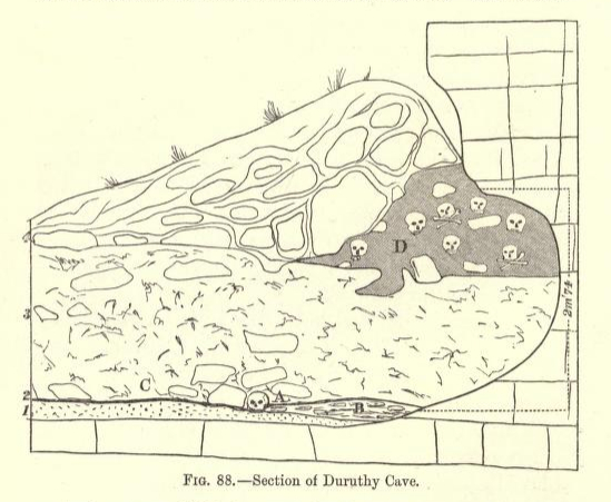 Dawkins publia en 1880 une stratigraphie illustrée de l'abri montrant, depuis la base, une terre rouge avec éclats de silex et fragments de charbon reposant sur le substrat rocheux. Au-dessus se trouve une fine couche noircie par le charbon, remplacée au centre par un limon jaune qui a livré de nombreuses canines d'ours et de lion, certaines perforées. Ce limon jaune a aussi fourni les restes humains dits « Sorde 1 », appartenant à un individu adulte, et sur cette couche a été observé un crâne humain. Les 55 canines d'ours des cavernes et les canines de lion mises au jour, dont certaines sont percées ou gravées, étaient positionnées de façon à former probablement un collier. Dawkins identifie une couche magdalénienne moyenne, et sa couche 3, comparable à la couche 4 de l'abri Dufaure, correspond à l'Alleröd (13 900 à 12 900 ans AP) et serait interrompue par un bref épisode de refroidissement (Dryas récent ?).