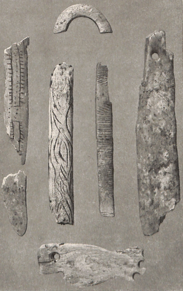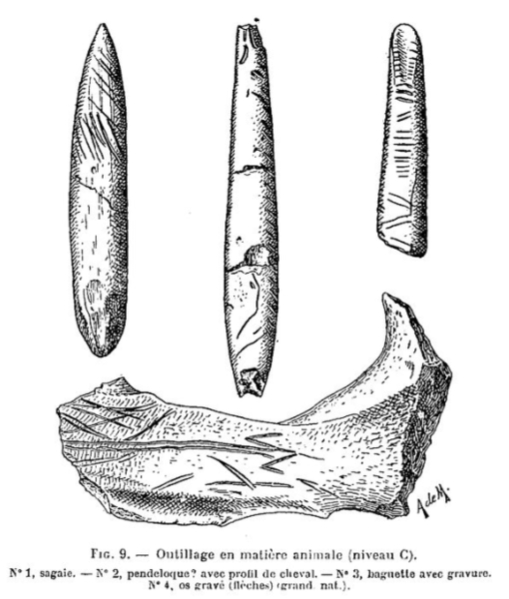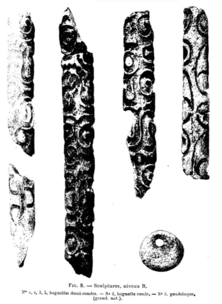 Parmi les découvertes les plus célèbres figure la Vénus de Lespugue, une statuette féminine en ivoire de mammouth trouvée dans la grotte des Rideaux et attribuée au Gravettien moyen ; l'original est conservé au Musée de l'Homme à Paris et des copies sont exposées localement. L'abri des Harpons a livré une autre figure féminine gravée sur une baguette de bois de renne, des baguettes décorées, une représentation frontale d'ours gravée sur os et divers objets de parure. Les ensembles osseux et lithiques comportent, selon les sites, bâtons percés, sagaies, aiguilles à chas, lampes et éléments d'outillage solutréen et magdalénien, ainsi que des témoins de contacts marins sous la forme de coquilles provenant de côtes atlantiques et méditerranéennes. La grotte des Bœufs a notamment fourni une tablette sculptée représentant une sole et d'autres pièces d'art mobilier se distinguent par leur rareté dans le bestiaire préhistorique, comme la côte gravée de serpents des Rideaux.