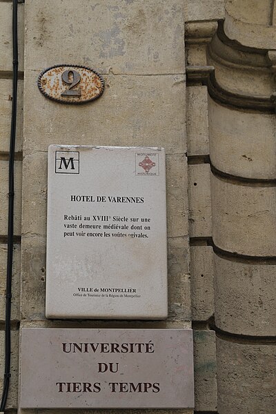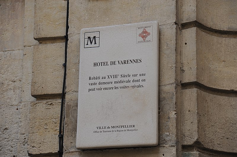 L’hôtel de Varennes, dit aussi hôtel Baudan de Varennes, est un hôtel particulier situé au centre de Montpellier (Hérault). Le rez-de-chaussée s’organise autour de grandes arcades ; aux extrémités de la façade, deux arcs en anse de panier, plus bas que les trois autres, correspondent chacun à deux fenêtres à l’étage. Au centre, l’entrée est marquée par un motif souligné par un balcon galbé en fer forgé attribué à Bongues. Les premier et deuxième étages présentent des fenêtres ornées de clés sculptées, le troisième formant un attique au-dessus d’une corniche très saillante. L’ensemble résulte de la réunion d’au moins deux ou trois maisons patriciennes des XIIIe-XIVe siècles, remaniées au XVe siècle puis en 1637 pour Emmanuel de Girard, intervention dont aucun vestige ne subsiste et qui n’est connue que par les sources. Les maisons médiévales réassociées conservent encore leurs passages d’entrée, leurs cours intérieures et des locaux au rez-de-chaussée ; les entrepôts voûtés en ogives attestent de l’origine marchande de la cité et ont permis la construction d’immeubles sur le bâti ancien. L’hôtel était autonome, avec son puits, et porte des traces qui évoquent la présence de l’écusson de saint Roch ainsi que des vestiges de la basilique Notre‑Dame des Tables. En 1758, le négociant Fulcrand Roux procède à une rénovation importante. L’édifice est inscrit au titre des monuments historiques depuis le 18 octobre 1944 et l’ensemble médiéval a été restauré au XXe siècle en conservant les apports des différentes périodes. Depuis 1992, un étage abrite le Musée du Vieux Montpellier, musée de France, qui présente des collections liées à l’histoire de la ville du Moyen Âge au XXe siècle, tandis qu’un autre niveau accueille le Musée Fougau, espace privé consacré aux arts et traditions populaires et à la culture occitane. Plusieurs associations partagent aujourd’hui les locaux : depuis 2016 l’association Angel (jeunesse LGBT+) est présente aux côtés de Contact, MartinE et SOS homophobie. Au rez-de-chaussée, parmi les salles à l’architecture gothique, la salle Pétrarque fait partie des neuf salles mises à disposition pour l’organisation d’événements associatifs. En entrant à gauche se remarque une porte décorée, récupérée au château de la Roquette et remontée par la Société archéologique de Montpellier. L’édifice offre par ailleurs un ensemble de vues caractéristiques — portail, passage voûté, escalier et cour — ainsi que des éléments sculptés comme une baie géminée et un décor représentant saint Roch montrant son bubon.