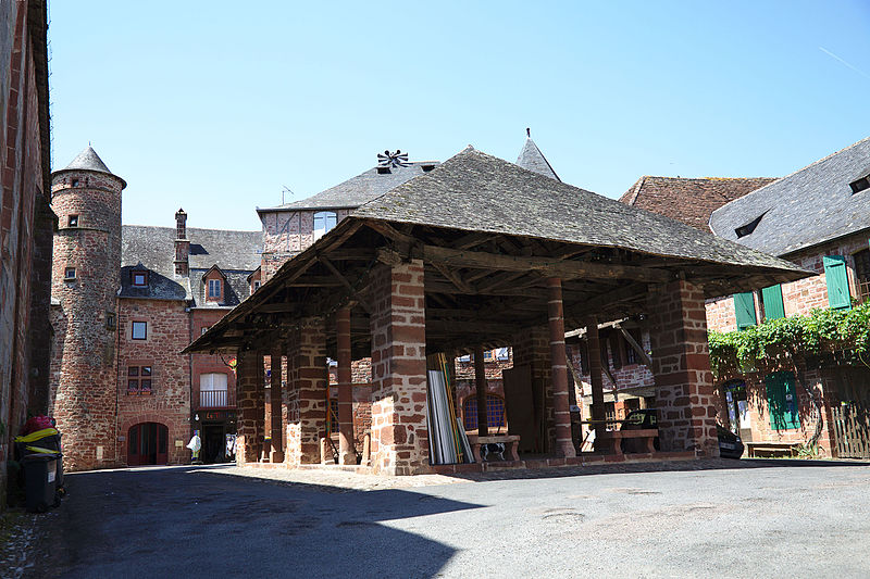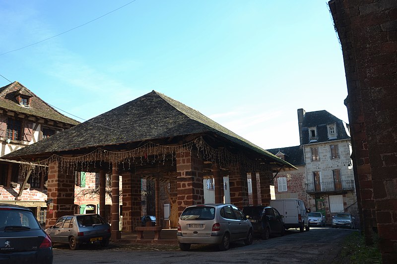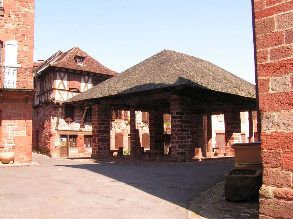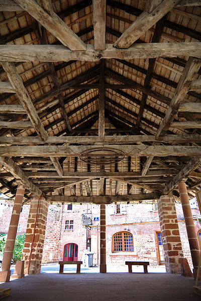 La halle, de plan rectangulaire, comporte six piliers massifs en grès rouge, joints au mortier de chaux. Dans les intervalles, des colonnes cylindriques renforcent la charpente ; leurs tambours sont monolithes. La charpente, en châtaignier, ménage au centre un vide qui permettait probablement d'entreposer sous les combles des sacs de céréales ou de noix. La couverture est en ardoises de Travassac.