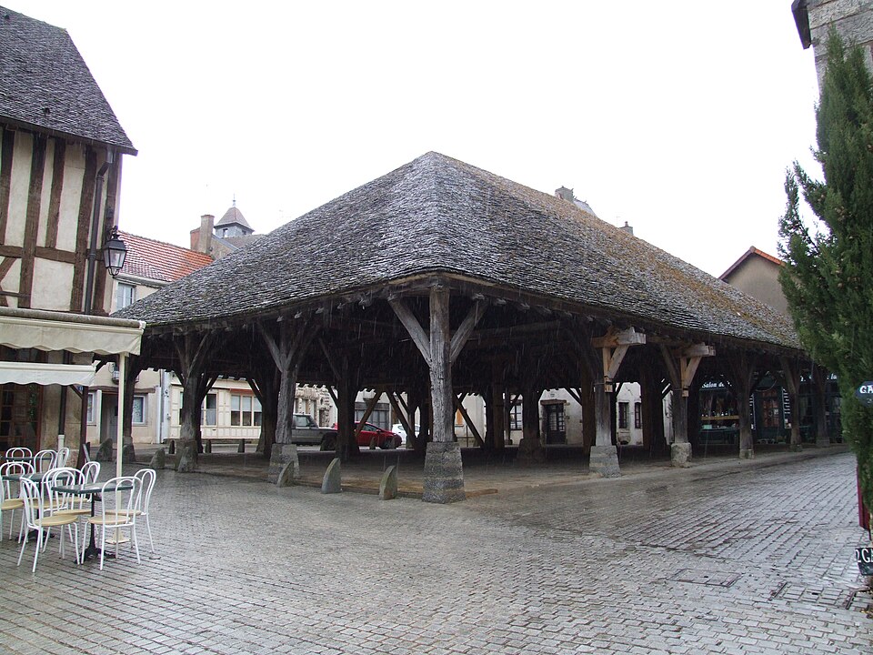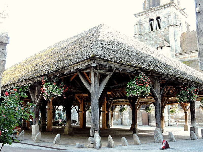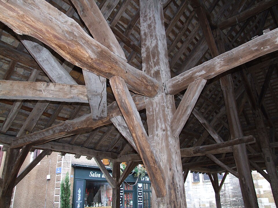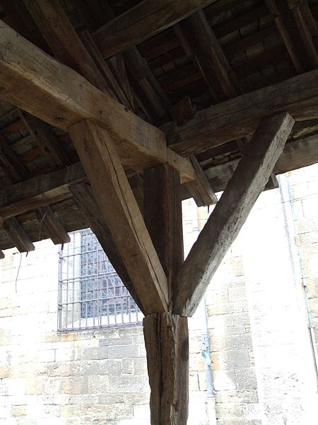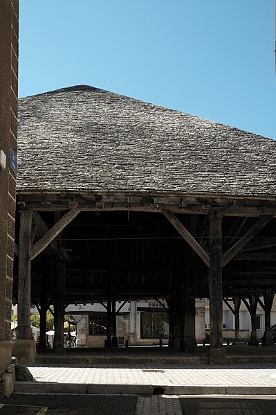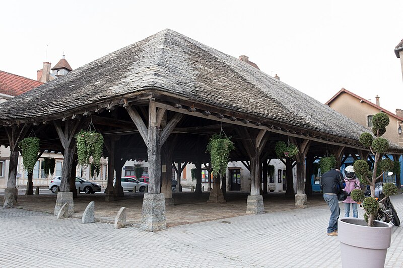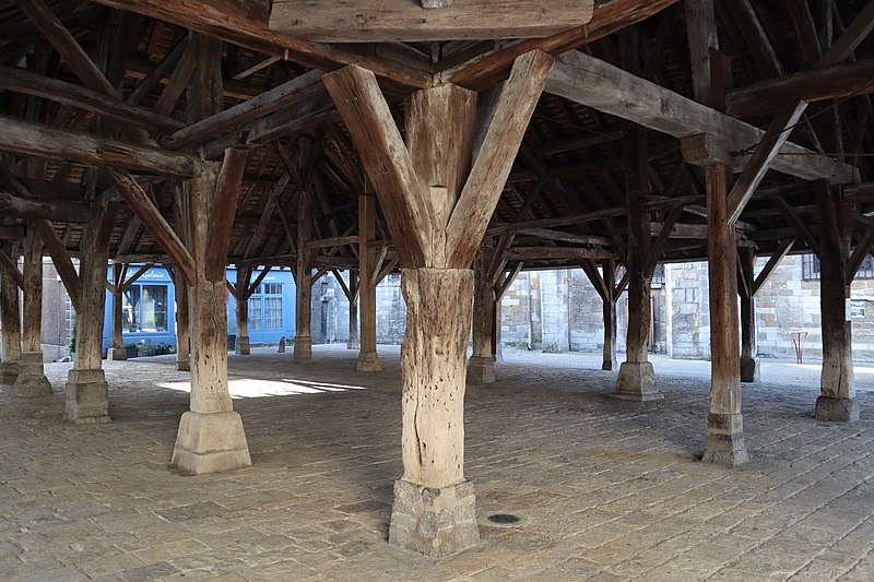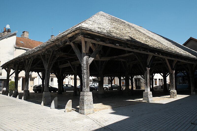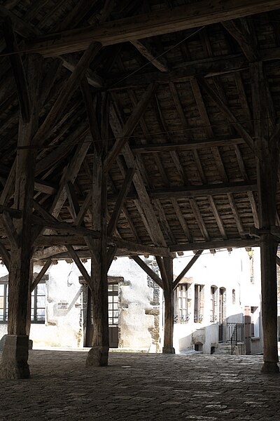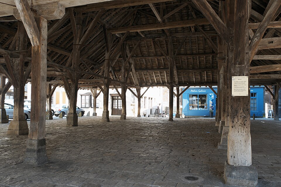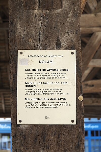 La halle aux grains de Nolay est un édifice médiéval en bois, situé place de la Halle au cœur du village, à proximité de l’église Saint-Martin (Nolay, Côte-d’Or, Bourgogne‑Franche‑Comté). C’est un grand bâtiment rectangulaire dont le comble en pavillon à quatre pans est entièrement couvert de laves de Bourgogne, ces minces pierres calcaires autrefois employées dans la région. Une des poutres de la charpente porte la date 1388, ce qui laisse penser qu’elle correspond à la période de construction. La charpente, réalisée en chêne et en châtaignier, repose sur des blocs de pierre. La couverture en laves représente un poids important, estimé à 600–800 kg par mètre carré. La halle a été classée au titre des monuments historiques (arrêtés mentionnés dans les sources) et rachetée par l’État le 6 août 1936. Le toit a été entièrement refait en 1951 par les services des monuments historiques. Des fouilles menées en 1995 ont suggéré que la halle abritait autrefois un four banal, détruit en 1763 en raison d’incendies qui affectaient la charpente. Des documents et photographies illustrent l’intérieur des halles (dont une vue de 1919), la charpente, la halle avec l’église en arrière‑plan et le panneau d’information.