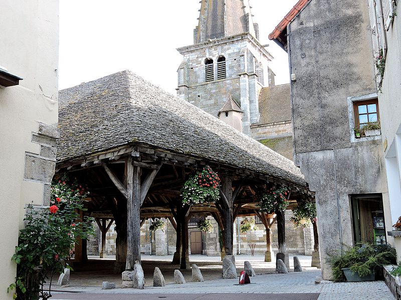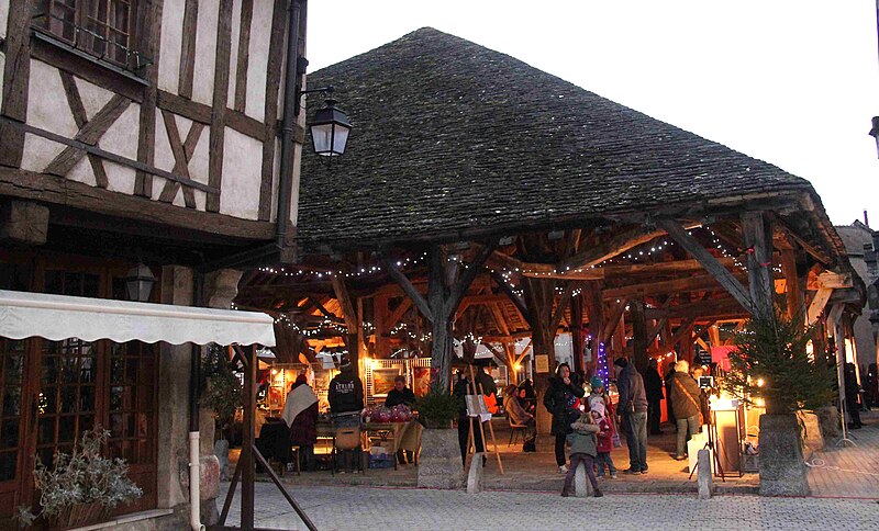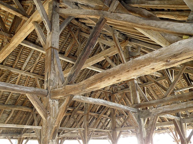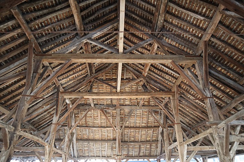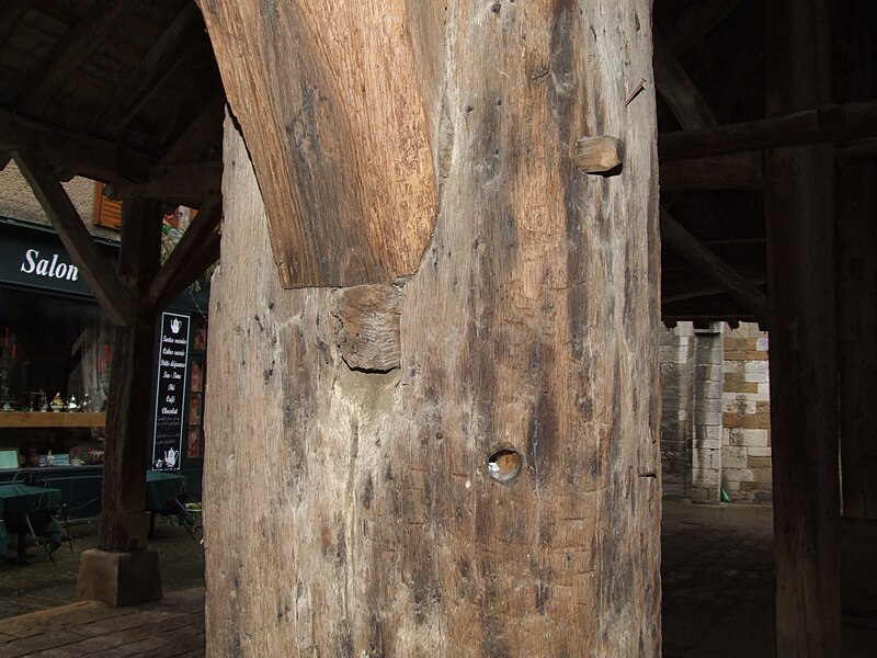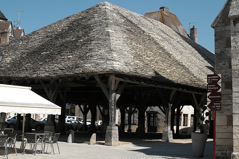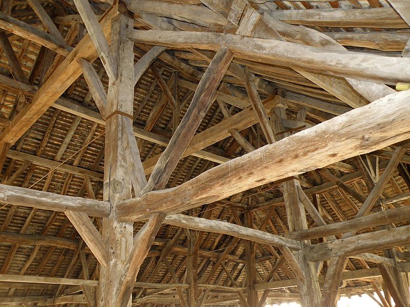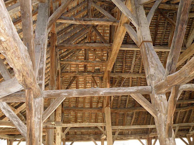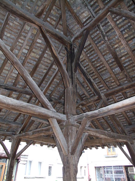 La halle aux grains de Nolay est un édifice médiéval en bois, situé place de la Halle au cœur du village, à proximité de l’église Saint-Martin (Nolay, Côte-d’Or, Bourgogne‑Franche‑Comté). C’est un grand bâtiment rectangulaire dont le comble en pavillon à quatre pans est entièrement couvert de laves de Bourgogne, ces minces pierres calcaires autrefois employées dans la région. Une des poutres de la charpente porte la date 1388, ce qui laisse penser qu’elle correspond à la période de construction. La charpente, réalisée en chêne et en châtaignier, repose sur des blocs de pierre. La couverture en laves représente un poids important, estimé à 600–800 kg par mètre carré. La halle a été classée au titre des monuments historiques (arrêtés mentionnés dans les sources) et rachetée par l’État le 6 août 1936. Le toit a été entièrement refait en 1951 par les services des monuments historiques. Des fouilles menées en 1995 ont suggéré que la halle abritait autrefois un four banal, détruit en 1763 en raison d’incendies qui affectaient la charpente. Des documents et photographies illustrent l’intérieur des halles (dont une vue de 1919), la charpente, la halle avec l’église en arrière‑plan et le panneau d’information.