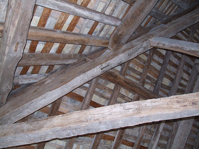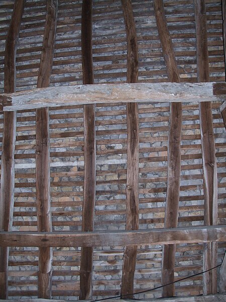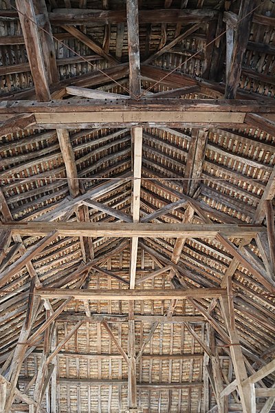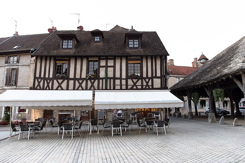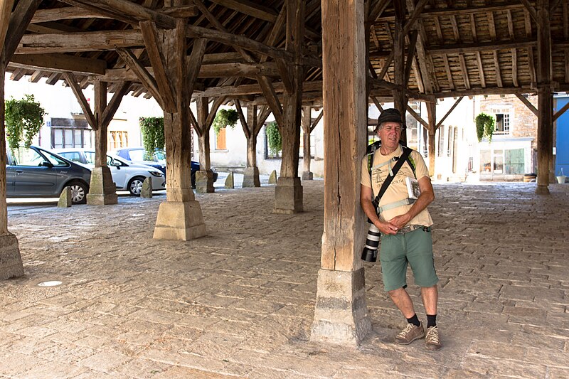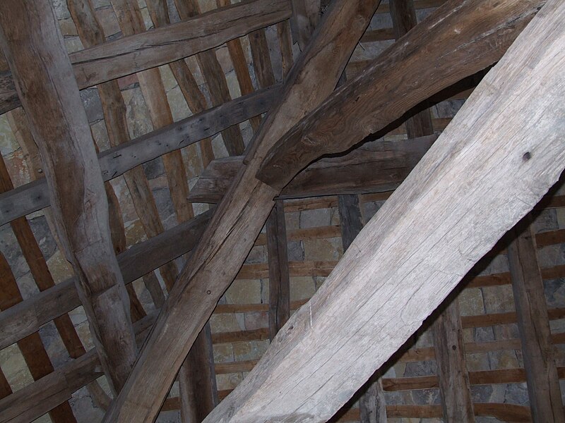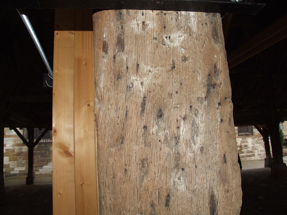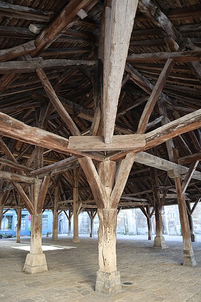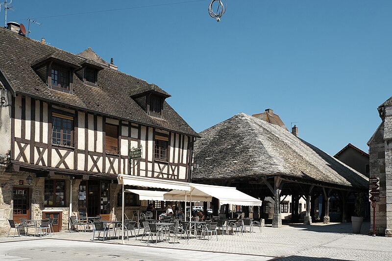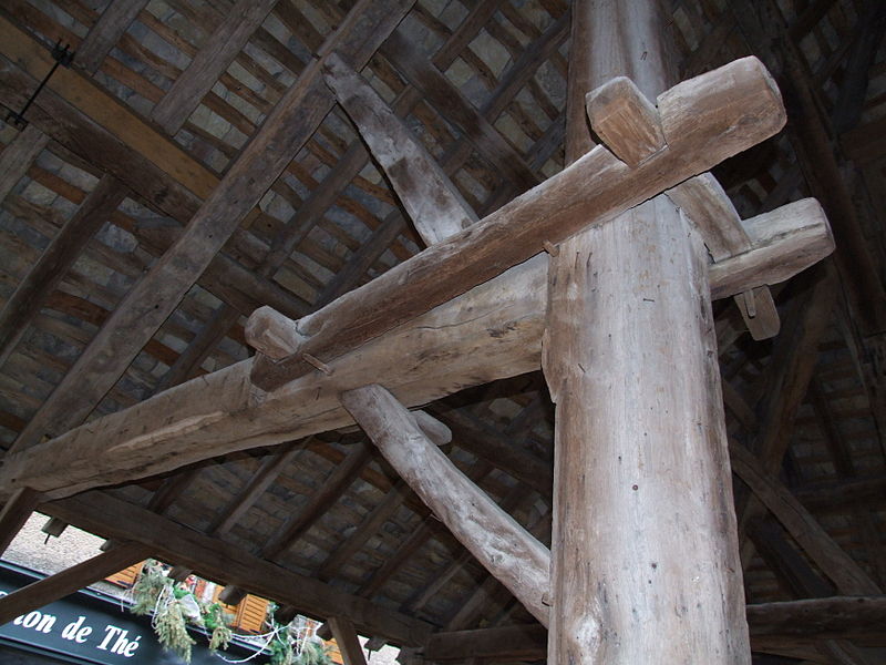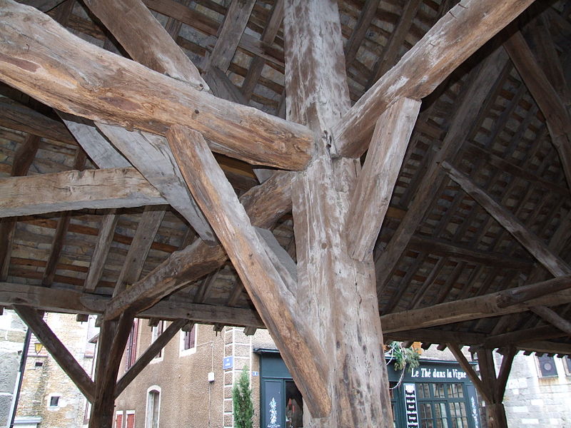 La halle aux grains de Nolay est un édifice médiéval en bois, situé place de la Halle au cœur du village, à proximité de l’église Saint-Martin (Nolay, Côte-d’Or, Bourgogne‑Franche‑Comté). C’est un grand bâtiment rectangulaire dont le comble en pavillon à quatre pans est entièrement couvert de laves de Bourgogne, ces minces pierres calcaires autrefois employées dans la région. Une des poutres de la charpente porte la date 1388, ce qui laisse penser qu’elle correspond à la période de construction. La charpente, réalisée en chêne et en châtaignier, repose sur des blocs de pierre. La couverture en laves représente un poids important, estimé à 600–800 kg par mètre carré. La halle a été classée au titre des monuments historiques (arrêtés mentionnés dans les sources) et rachetée par l’État le 6 août 1936. Le toit a été entièrement refait en 1951 par les services des monuments historiques. Des fouilles menées en 1995 ont suggéré que la halle abritait autrefois un four banal, détruit en 1763 en raison d’incendies qui affectaient la charpente. Des documents et photographies illustrent l’intérieur des halles (dont une vue de 1919), la charpente, la halle avec l’église en arrière‑plan et le panneau d’information.