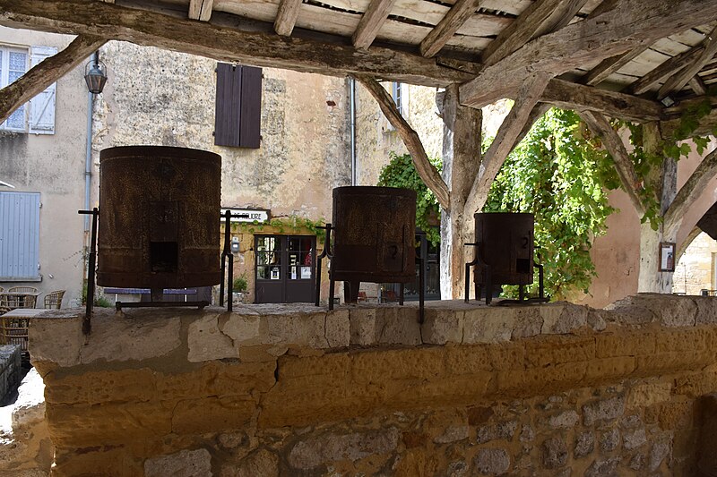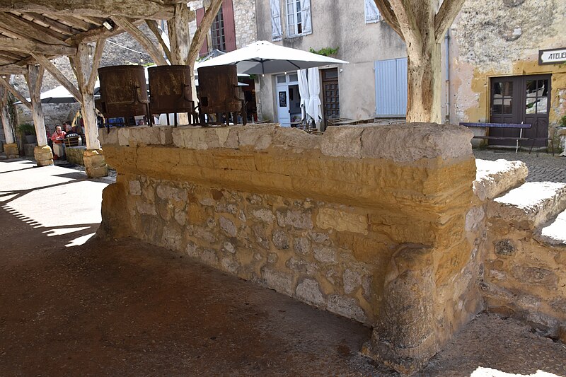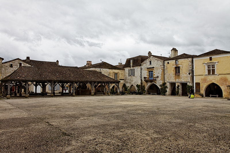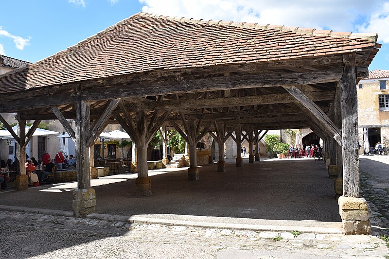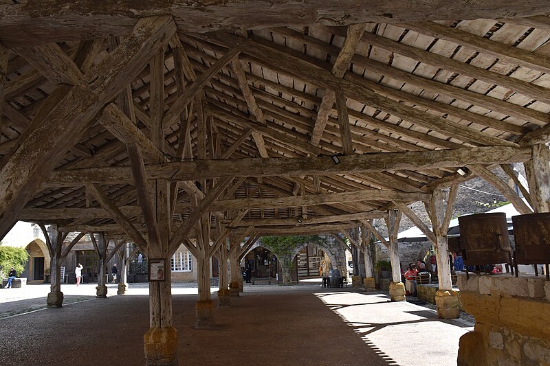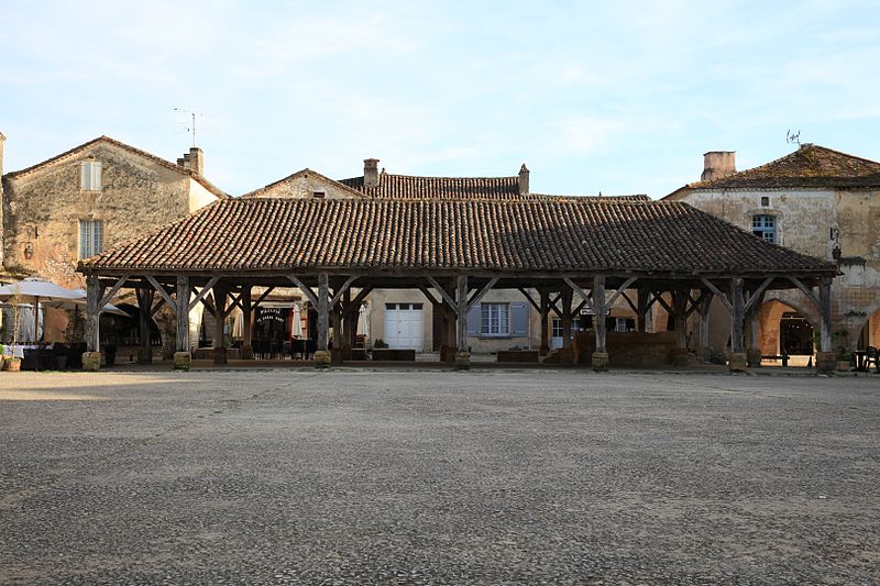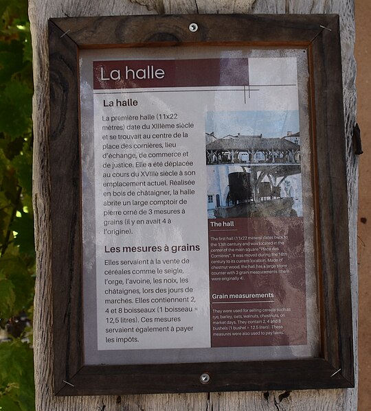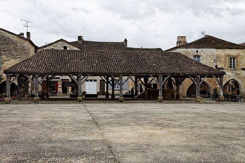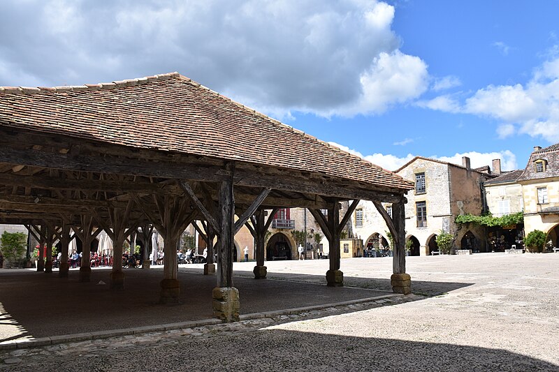 La halle centrale de Monpazier se situe sur le côté sud de la place des Cornières, à proximité de l'église Saint-Dominique, dans le département de la Dordogne. La charte des coutumes de Monpazier de 1284 prévoit un marché hebdomadaire le jeudi. L'édifice, de plan rectangulaire, est construit en bois. Un grand parapet en pierre présente trois mesures à grain de capacités différentes. La halle est classée au titre des monuments historiques depuis le 18 juillet 1960. Pour approfondir, on peut consulter notamment Michel Coste, Monpazier, les clés d'une bastide (Librairie du château, 2002).