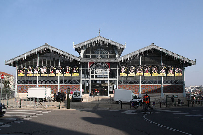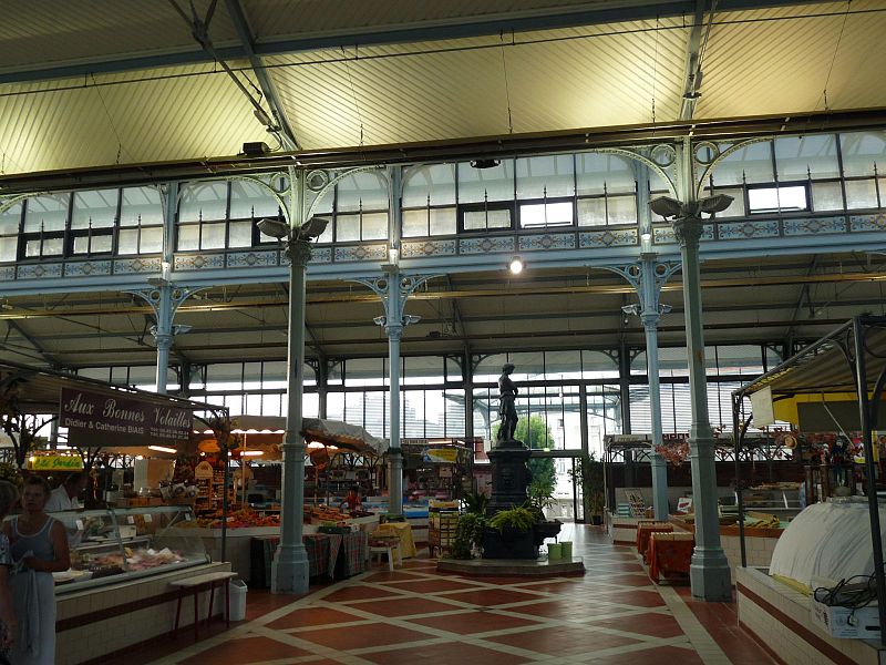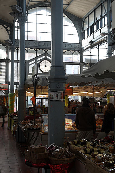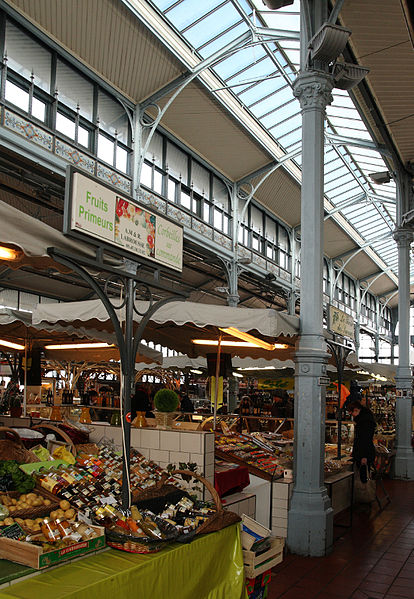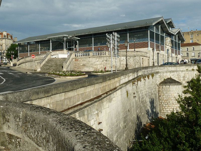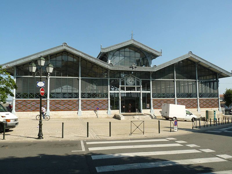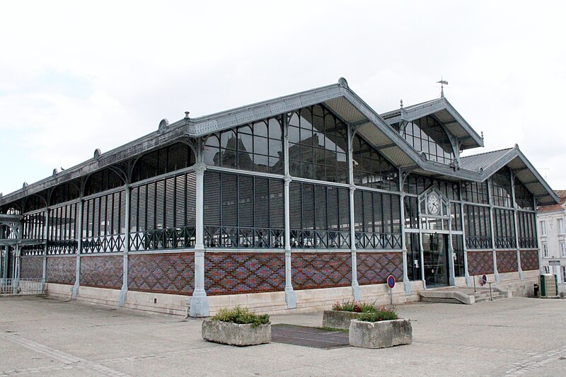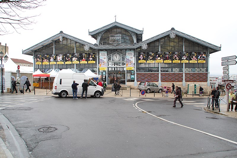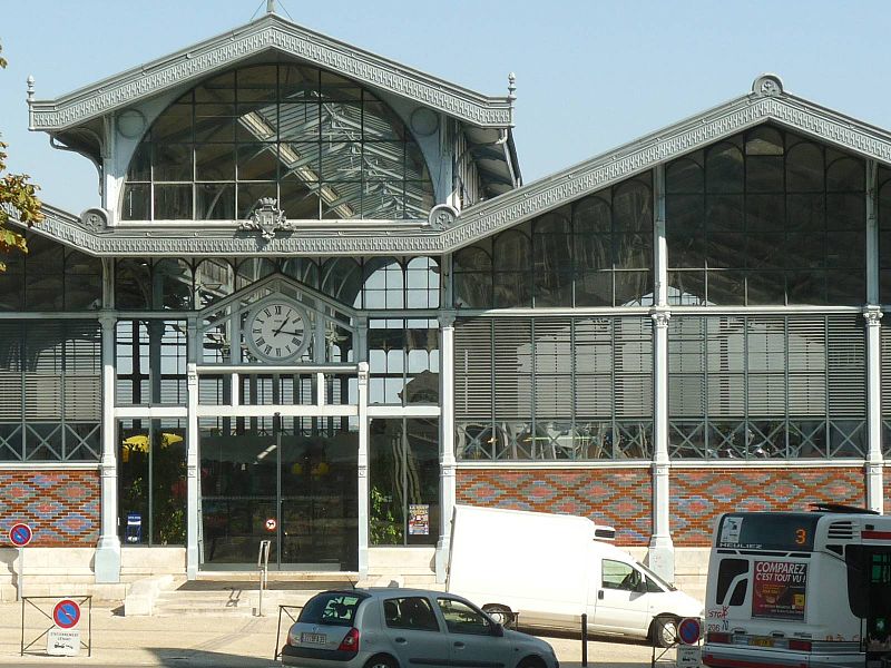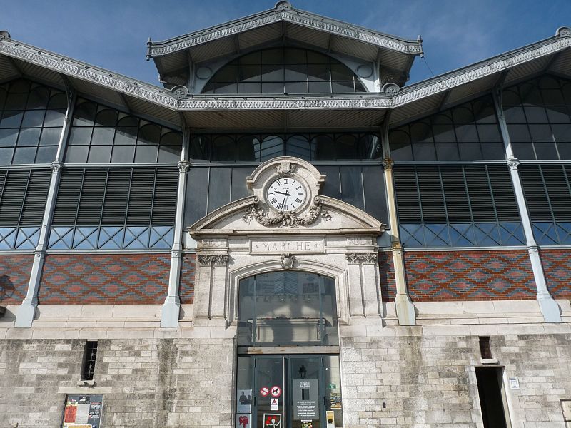 La construction d'un nouveau marché avait été envisagée dès 1859 en raison de l'encombrement du marché en plein air devant l'hôtel de ville et du marché annexe de la place Bouillaud. Sa réalisation fut autorisée en 1886, avec le percement d'une nouvelle voie d'accès depuis l'hôtel de ville ; l'architecte en fut Édouard Varin. La halle se compose de deux corps de bâtiments inscrits dans un rectangle et disposés autour d'une rue centrale formant un lanterneau intérieur. Deux entrées latérales, placées au milieu des longs côtés, sont abritées par une marquise portée par deux colonnettes en fonte et reliées au sol par une rampe ou un escalier afin de compenser la déclivité du terrain vers le rempart. Le marché comporte ainsi un niveau de caves. Le décor se concentre sur la façade principale, où un portail en pierre est surmonté d'une horloge ; une horloge se trouve également sur la façade opposée. Les colonnes, de section octogonale, reposent sur un soubassement en maçonnerie de hauteur variable. Le remplissage des façades associe, en partie inférieure, des briques disposées en motif losangé et, au-dessus, un rideau vitré dont la partie basse, autrefois pourvue de persiennes en bois, a été refaite en 1960 en tôles ondulées de PVC translucide. Une frise en zinc ornée des armoiries de la ville recouvre le chéneau.