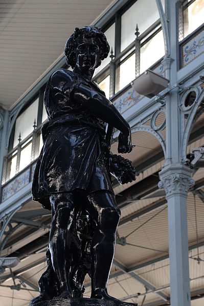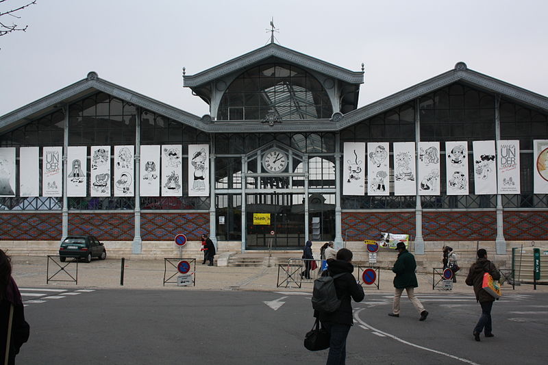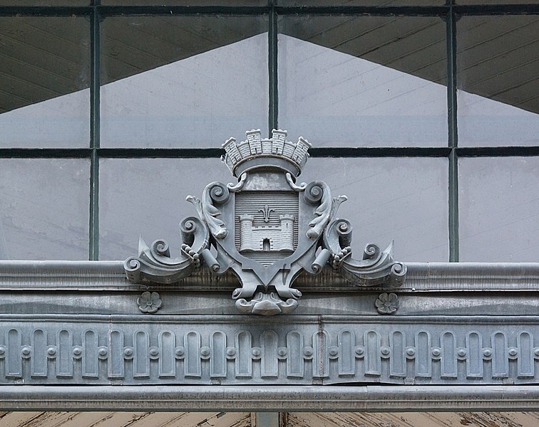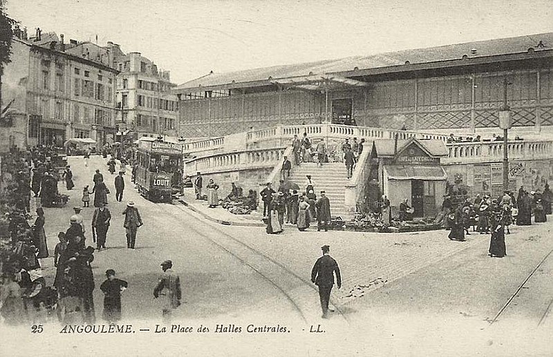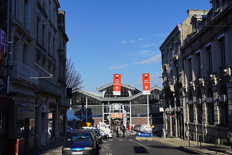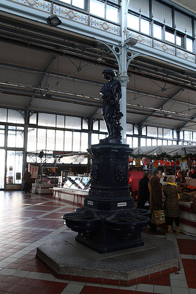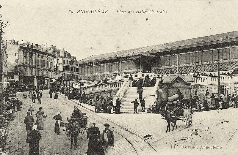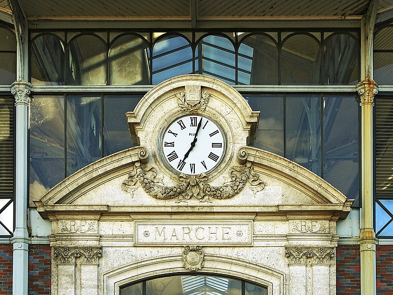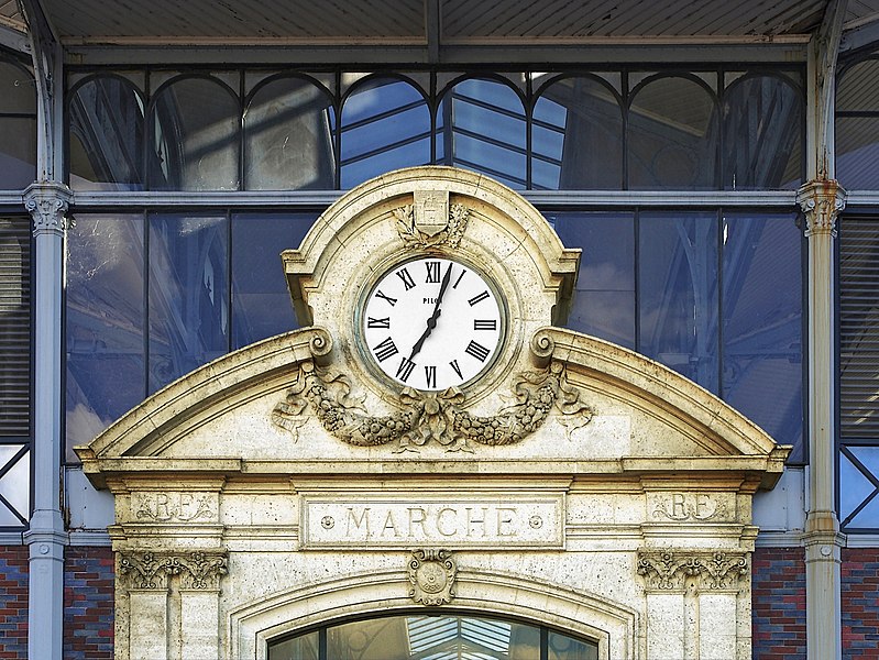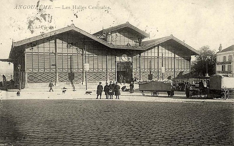 La construction d'un nouveau marché avait été envisagée dès 1859 en raison de l'encombrement du marché en plein air devant l'hôtel de ville et du marché annexe de la place Bouillaud. Sa réalisation fut autorisée en 1886, avec le percement d'une nouvelle voie d'accès depuis l'hôtel de ville ; l'architecte en fut Édouard Varin. La halle se compose de deux corps de bâtiments inscrits dans un rectangle et disposés autour d'une rue centrale formant un lanterneau intérieur. Deux entrées latérales, placées au milieu des longs côtés, sont abritées par une marquise portée par deux colonnettes en fonte et reliées au sol par une rampe ou un escalier afin de compenser la déclivité du terrain vers le rempart. Le marché comporte ainsi un niveau de caves. Le décor se concentre sur la façade principale, où un portail en pierre est surmonté d'une horloge ; une horloge se trouve également sur la façade opposée. Les colonnes, de section octogonale, reposent sur un soubassement en maçonnerie de hauteur variable. Le remplissage des façades associe, en partie inférieure, des briques disposées en motif losangé et, au-dessus, un rideau vitré dont la partie basse, autrefois pourvue de persiennes en bois, a été refaite en 1960 en tôles ondulées de PVC translucide. Une frise en zinc ornée des armoiries de la ville recouvre le chéneau.
