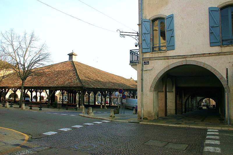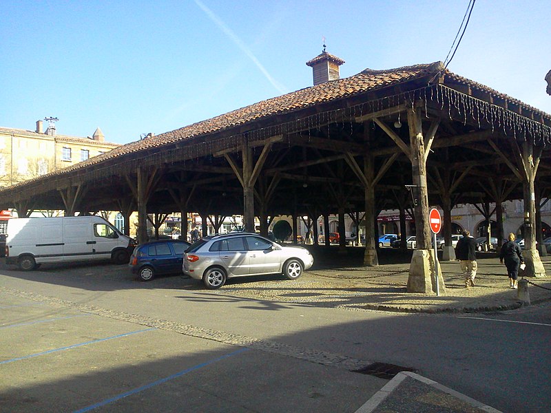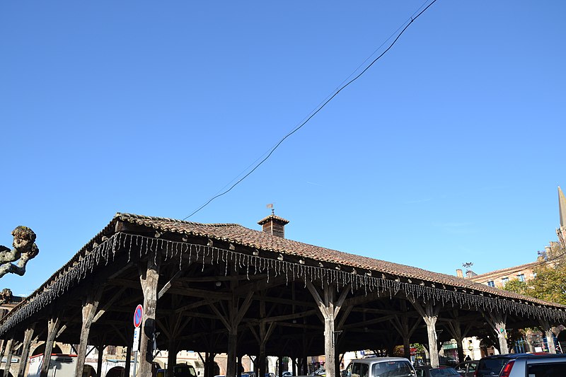 La halle de Beaumont-de-Lomagne, située au centre de la ville du même nom (Tarn-et-Garonne), accueille les marchés du samedi matin depuis le XIVe siècle. Elle est attribuée au XIVe ou au début du XVe siècle ; sa construction avait été envisagée dès la fondation de la bastide en 1278, mais n'a été réalisée qu'au XIVe siècle. Il s'agit d'une halle carrée d'environ 36,40 m de côté ; une source mentionne par ailleurs une surface de 1 560 m². Sa charpente, en chêne, repose sur des poteaux posés sur des dés ou socles de pierre dont les dimensions varient pour compenser la pente du terrain. La structure se compose de plusieurs nefs soutenues par ces poteaux. Le bâtiment a connu de nombreuses réparations et transformations au fil du temps. Son toit, refait en 1857, était autrefois surmonté d'un donjon dont la taille s'est progressivement réduite. Le 27 mars 1647, le donjon s'effondra en provoquant d'importants dégâts ; il fut remplacé par le clocheton qui subsiste aujourd'hui et qui marquait le contrôle de la ville sur l'édifice. La halle fait l'objet d'un classement au titre des monuments historiques depuis le 18 juin 1930. Des notices et ressources sur l'architecture de la halle figurent dans les bases Mérimée et Structurae ainsi que sur les portails consacrés au Tarn-et-Garonne et aux monuments historiques.