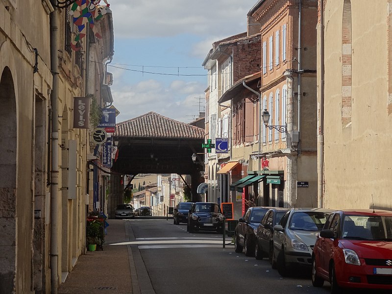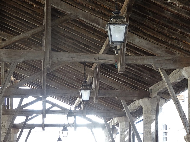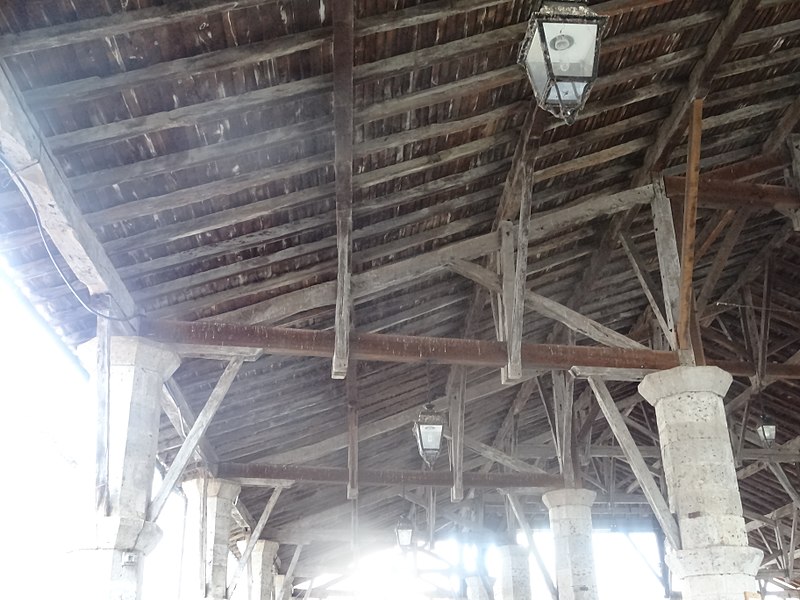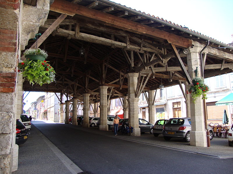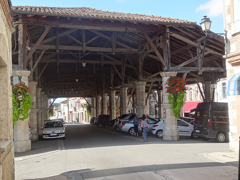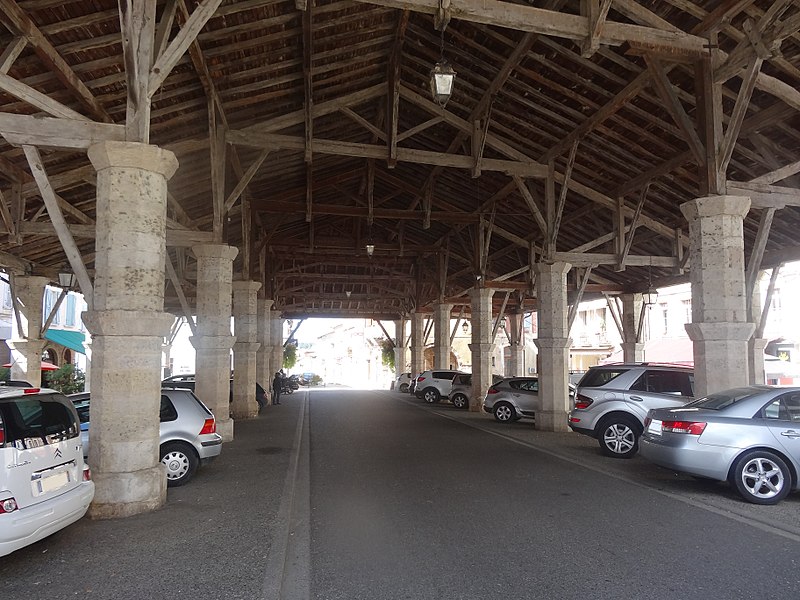 La halle de Gimont, dite « halle‑rue », se situe au centre de la commune de Gimont, dans le Gers. Selon les sources, sa datation varie : elle est parfois présentée comme un édifice du XIIIe siècle, tandis que d'autres éléments la rattachent au XIVe siècle ; une inscription sur un pilier nord‑est porte la date 1331. La bastide de Gimont a été créée en 1265 par un paréage entre l'abbaye de Planselve et le sénéchal d'Alphonse de Poitiers. La halle a été remaniée et rehaussée en 1755 puis en 1875. Elle a été inscrite au titre des monuments historiques le 7 décembre 1972 et rénovée en 2009. Destinée à abriter les marchés, elle accueille notamment le commerce des palmipèdes — oies et canards — ce qui lui vaut le surnom de « halle au gras » ; on y observe encore d'anciennes mesures à grains. Implantée sur une place rectangulaire orientée nord‑ouest - sud‑ouest, l'édifice est organisé en trois nefs. Sa charpente en chêne repose sur deux doubles rangées de sept piliers octogonaux en pierre, qui forment ces nefs. La nef centrale, la plus large, enjambe la rue Nationale, qui passe sous les arcades. La charpente couvre environ 1 000 mètres carrés et est coiffée d'un toit en tuiles canal à quatre pentes.