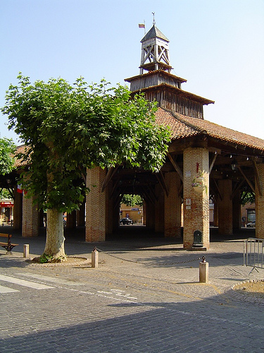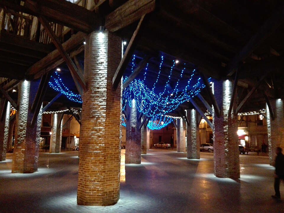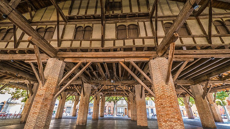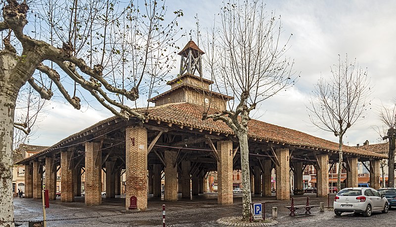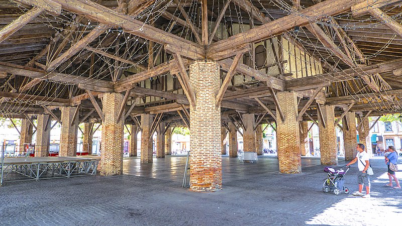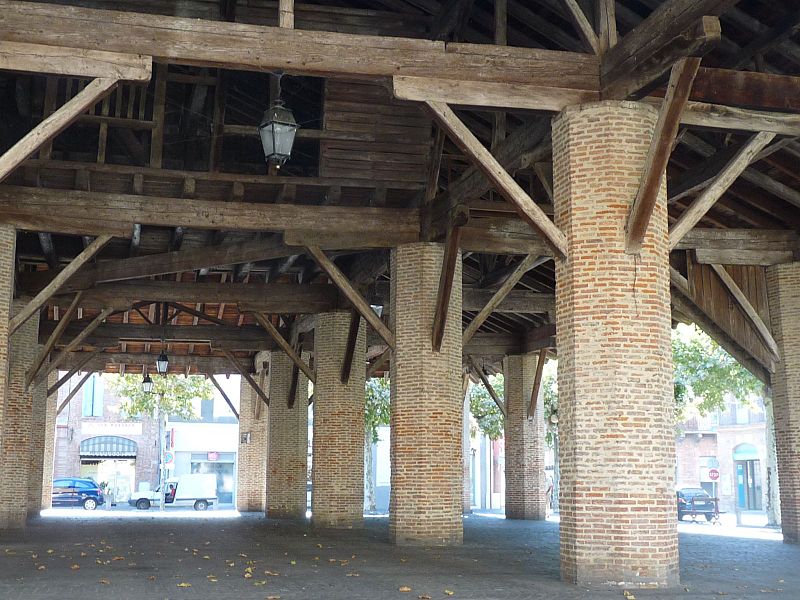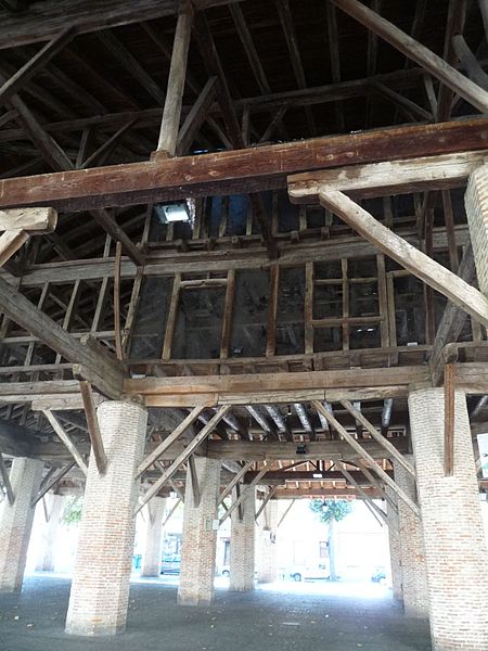Fondée en 1290 par les moines de Granselve, la bastide de Grenade a été conçue comme une ville‑marché destinée à stimuler l’activité agricole et commerciale de la région. La place centrale, établie dès la fondation, mesure environ 72 × 74 mètres et constitue le cœur du plan en damier. Au centre de cette place se dresse une halle de plan carré d’environ 43 mètres de côté, soit près de 1 800 m2. La halle occupe un îlot de la bastide au croisement des axes principaux, rue Gambetta et rue de la République, sur la place du Commerce. Elle présente une charpente sur trois étages surmontée d’un beffroi et reposant sur trente‑six piliers octogonaux en briques roses, typiques du pays toulousain. La toiture pyramidale présente trois décrochements successifs à partir du beffroi, le dernier recouvrant les deux étages à greniers à l’intérieur. Au premier étage, au‑dessus des seize piliers de la surface centrale, se trouvent des greniers à grains accessibles autrefois par des échelles en bois ; cet étage était fermé par des planches et ajouré par de grandes fenêtres à croisillons en bois. Des analyses dendrochronologiques ont montré que certains bois de la charpente datent de la fin du XIIIe siècle, avec des bois coupés en 1293. Certaines sources attribuent toutefois la construction ou des remaniements de l’édifice à la période 1582‑1593. La charte de fondation de 1290 prévoyait déjà la fonction commerciale de la halle, autorisant un marché hebdomadaire et deux foires annuelles ; un texte de 1315 mentionne des tables de cordonniers sur la place, sans que l’on puisse affirmer avec certitude qu’il s’agisse de la halle. Un inventaire de 1617 cite un texte de 1305 indiquant que le conseil municipal se tenait dans la « maison commune » de la ville, ce qui laisse penser que la halle accueillait des fonctions consulaires dès le Moyen Âge. Plusieurs loges y étaient installées de manière permanente, notamment une loge des poids et mesures et la loge du mazel ou boucherie. L’édifice a également eu des fonctions judiciaires et administratives, abritant un auditoire royal et les locaux de travail du juge, du bailli, des notaires, des crieurs publics et des consuls. Les documents d’époque montrent que la halle a subi de nombreux travaux aux XVIIe et XVIIIe siècles : réparations de poutres, entretien de la couverture et interventions sur le bâtiment de l’horloge, qui a été signalé comme menaçant de tomber en 1671 et en 1773. Un acte de 1668 fait état d’une halle soutenue par trente piliers et déjà pourvue d’une horloge publique, tandis qu’en 1671 un autre acte évoque un nombre différent de piliers en l’air. Une gravure réalisée en 1879 montre que la halle était entourée de petits murets au XIXe siècle. Le sol et les piliers ont été rénovés et restaurés en 1992‑1993. La halle couverte, nommée halle Jean Moulin, est classée au titre des monuments historiques par arrêté du 5 décembre 1979. Depuis des siècles, elle reste un lieu de rencontre pour les habitants de Grenade, accueillant le marché du samedi, la foire annuelle de la Saint‑Luc, les bals d’été et d’autres manifestations.