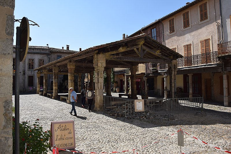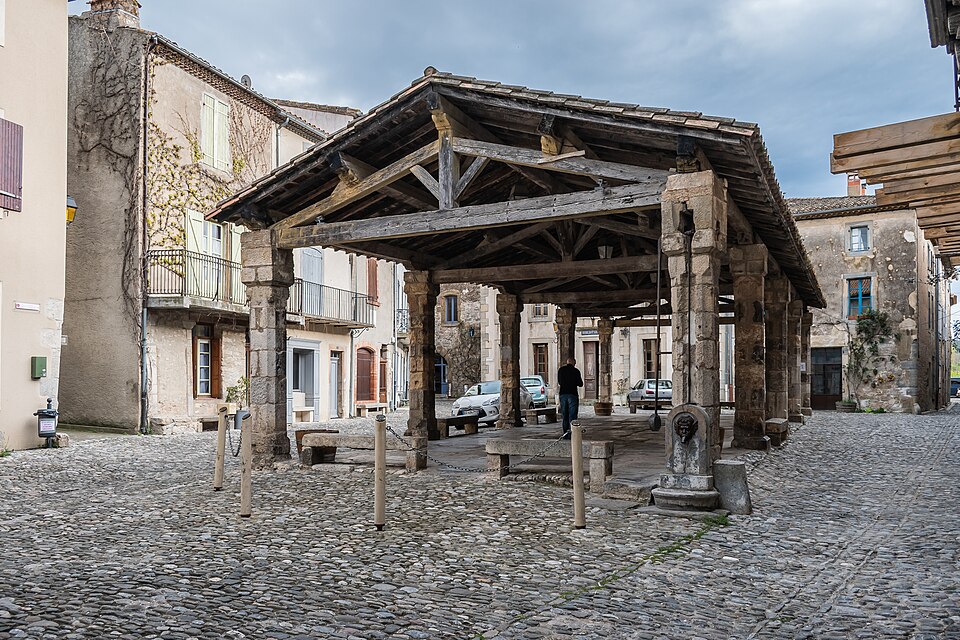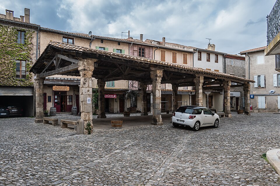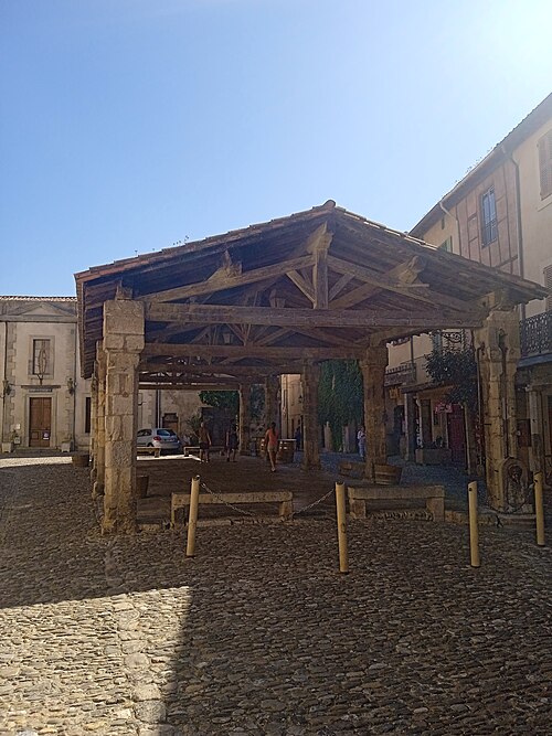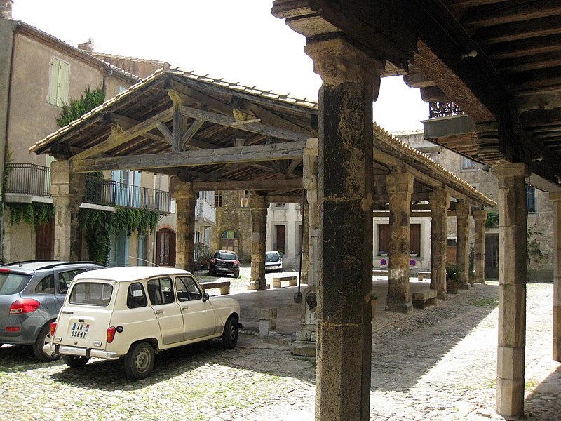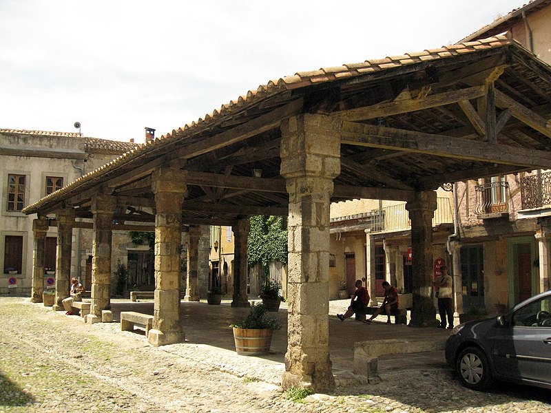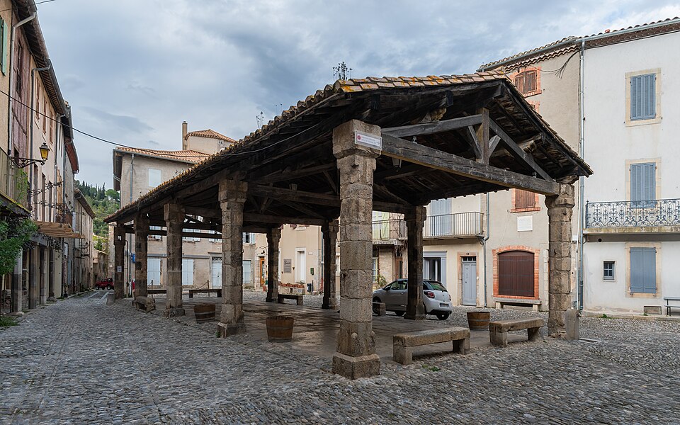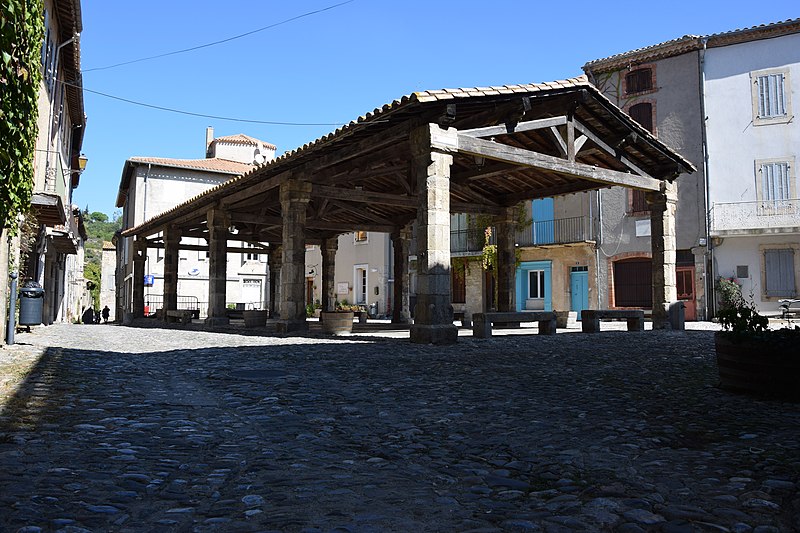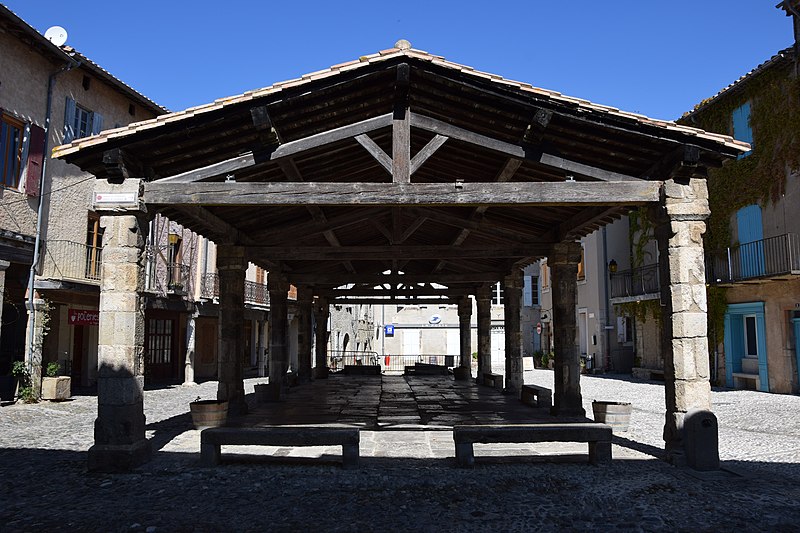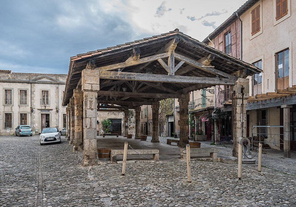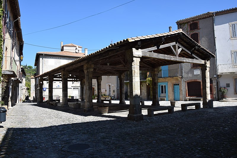 La halle de Lagrasse, située dans l'Aude, est datée du début du XIVe siècle grâce aux écussons armoriés sculptés sur plusieurs piliers de pierre qui portent la charpente. L'édifice repose sur dix piliers soutenant cinq fermes. La partie abritée est dallée et pourvue de six bancs en pierre. Les piliers, en calcaire dur, sont chanfreinés ; ces chanfreins sont interrompus en haut et en bas par un arrondi comparable à un quart de sphère dont deux côtés sont coupés d'équerre. L'édifice est classé au titre des monuments historiques en 1937.