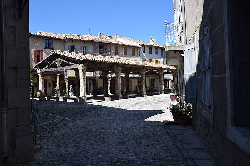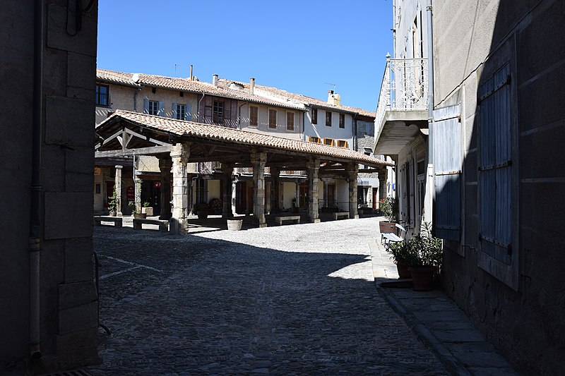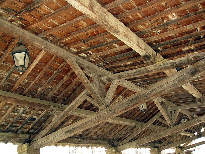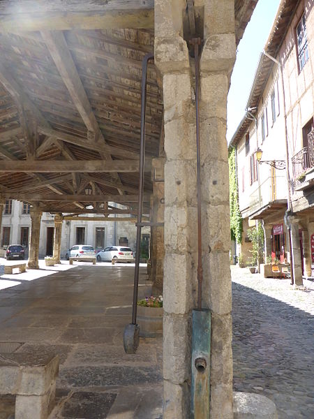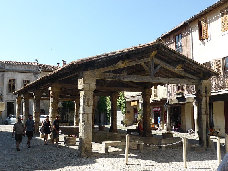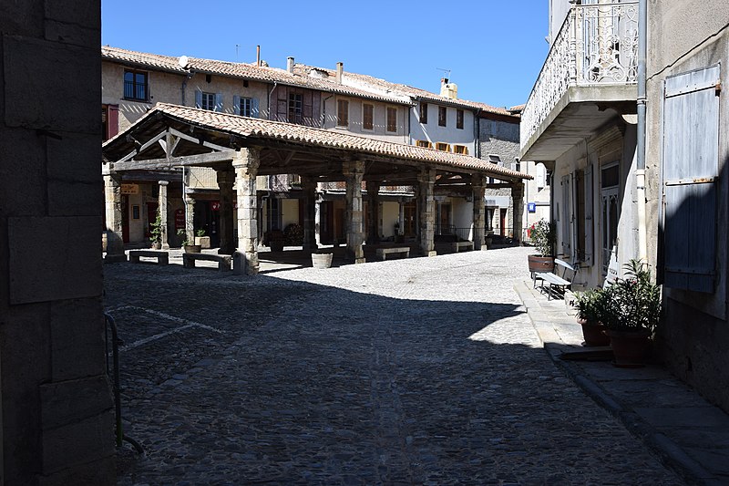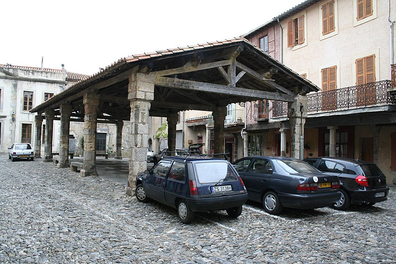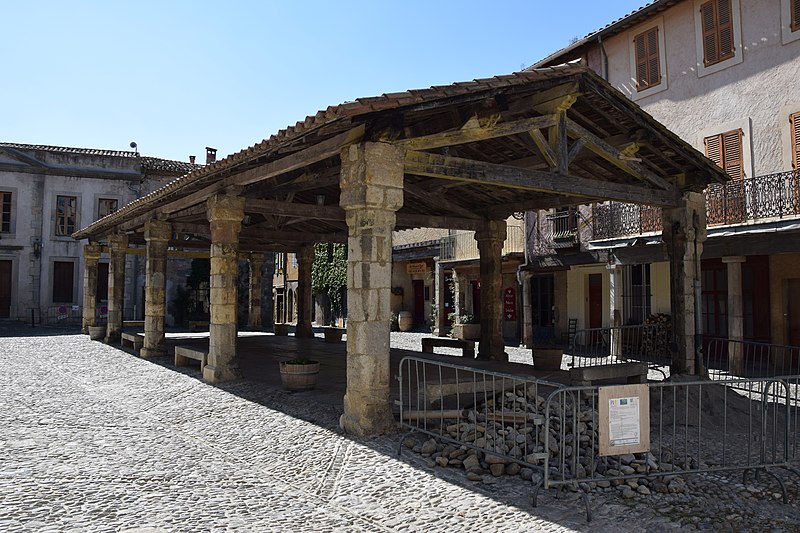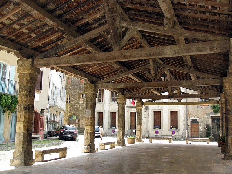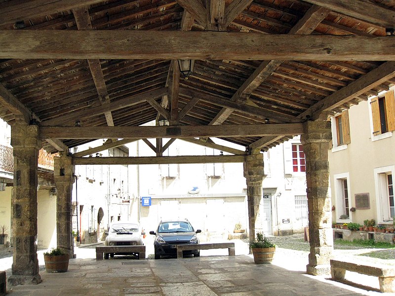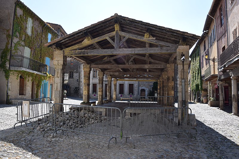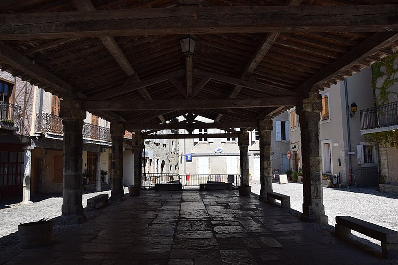 La halle de Lagrasse, située dans l'Aude, est datée du début du XIVe siècle grâce aux écussons armoriés sculptés sur plusieurs piliers de pierre qui portent la charpente. L'édifice repose sur dix piliers soutenant cinq fermes. La partie abritée est dallée et pourvue de six bancs en pierre. Les piliers, en calcaire dur, sont chanfreinés ; ces chanfreins sont interrompus en haut et en bas par un arrondi comparable à un quart de sphère dont deux côtés sont coupés d'équerre. L'édifice est classé au titre des monuments historiques en 1937.