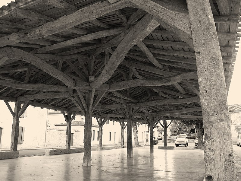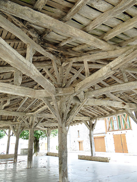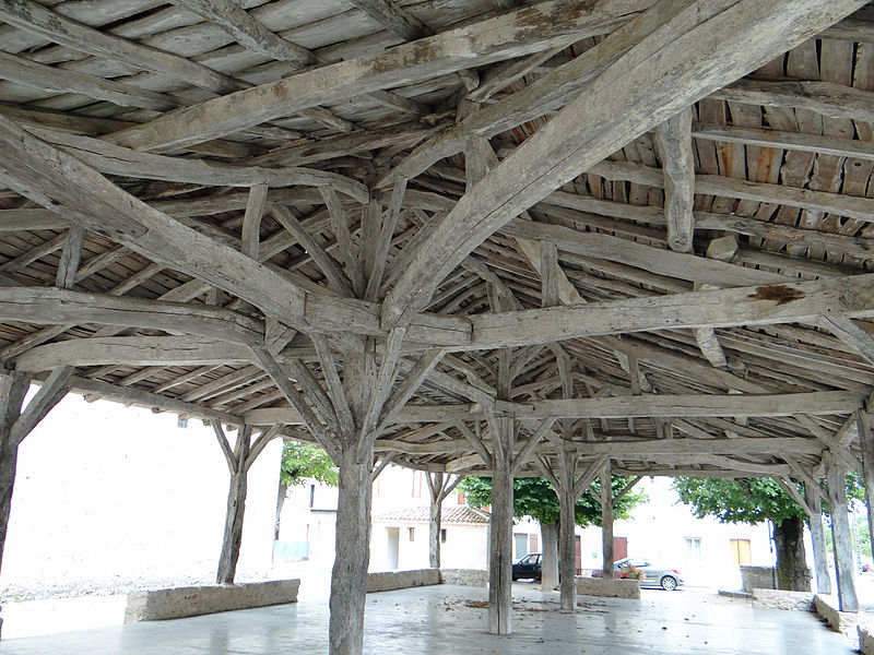 La halle et les deux puits voisins se situent à Laparade (Lot-et-Garonne), place de l'église. Des études signalent qu'une halle, transformée à la fin du XVIe siècle en temple protestant fermé par des murs de torchis, occupait l'emplacement de l'actuelle église édifiée en 1876. Après la révocation de l'édit de Nantes (édit de Fontainebleau), le temple fut démoli en 1685 et était encore en ruine en 1714, ce qui laisse supposer que la halle actuelle a été édifiée à côté de l'emplacement d'origine à une date postérieure à 1714 ; J. Caubet indique une reconstruction en 1762. La halle est de plan rectangulaire et ceinturée d'un muret en maçonnerie, interrompu à deux endroits sur les longueurs et à deux autres sur les largeurs pour permettre l'accès. Douze piliers en bois, posés sur ce muret, portent les sablières de la charpente, tandis que le centre est occupé par trois piliers servant de poinçons et reposant directement sur le sol. La toiture, à quatre pans, est couverte de tuiles canal. Aux angles se trouvent deux puits cylindriques en grand appareil, surmontés d'une ferronnerie où sont fixées quatre poulies sur la margelle ; un marche-pied dallé ceinturant chacun des puits permet l'accès. La halle et les deux puits avoisinants ont été inscrits au titre des monuments historiques le 5 décembre 1984.