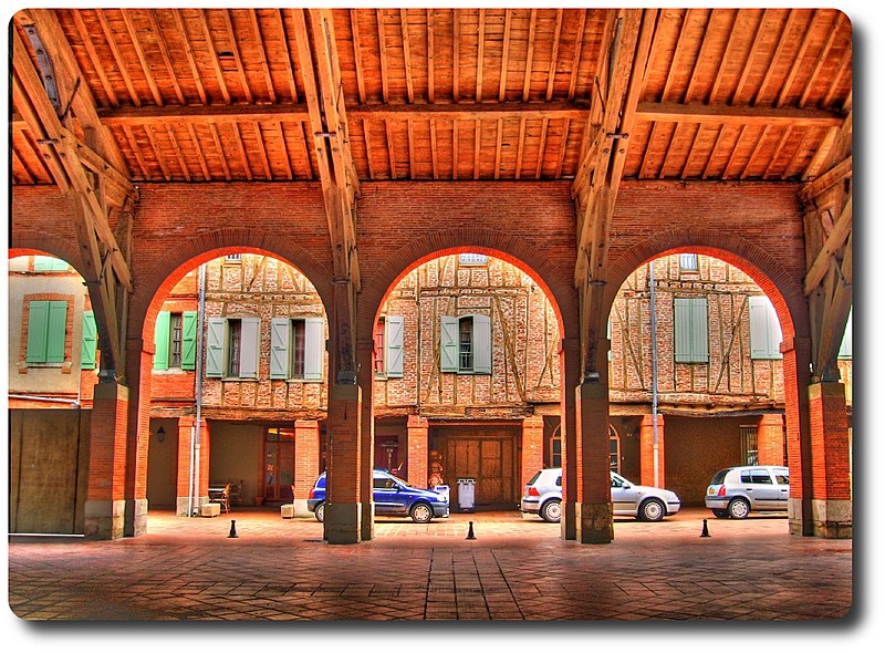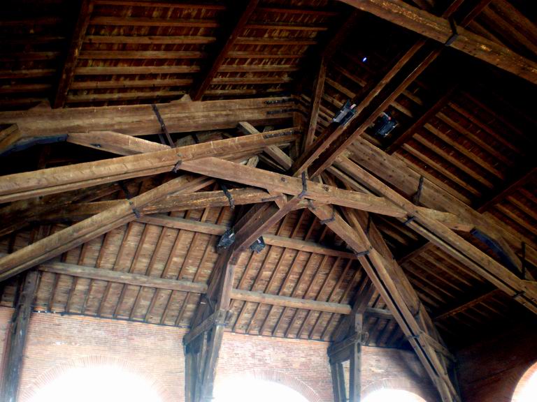 La halle de Mazères, située place de l'Église au centre de la commune de Mazères (Ariège), est un édifice en brique toulousaine. Construite entre 1845 et 1851 par l'architecte Ferdinand Coma, elle remplace une halle médiévale antérieure. L'édifice illustre le groupe des halles néo‑classiques : un quadrilatère percé d'arcades régulières qui ouvre sur un grand volume intérieur. Sa charpente, qui ne repose sur aucun support intermédiaire, crée un espace unifié. La couverture en tuile occitane recouvre 950 m². La halle a été inscrite au titre des monuments historiques par arrêté du 27 octobre 2004. Les couverts à colombages du XVIIe siècle qui l'entourent sont visibles depuis l'intérieur. Le marché hebdomadaire se tient tous les jeudis et une brocante a lieu le premier lundi de chaque mois. En septembre se déroule la fête des vendanges et des fromages, et des événements culturels y sont organisés ponctuellement. La charpente et l'ensemble architectural sont également documentés dans les collections iconographiques, notamment sur Wikimedia Commons.