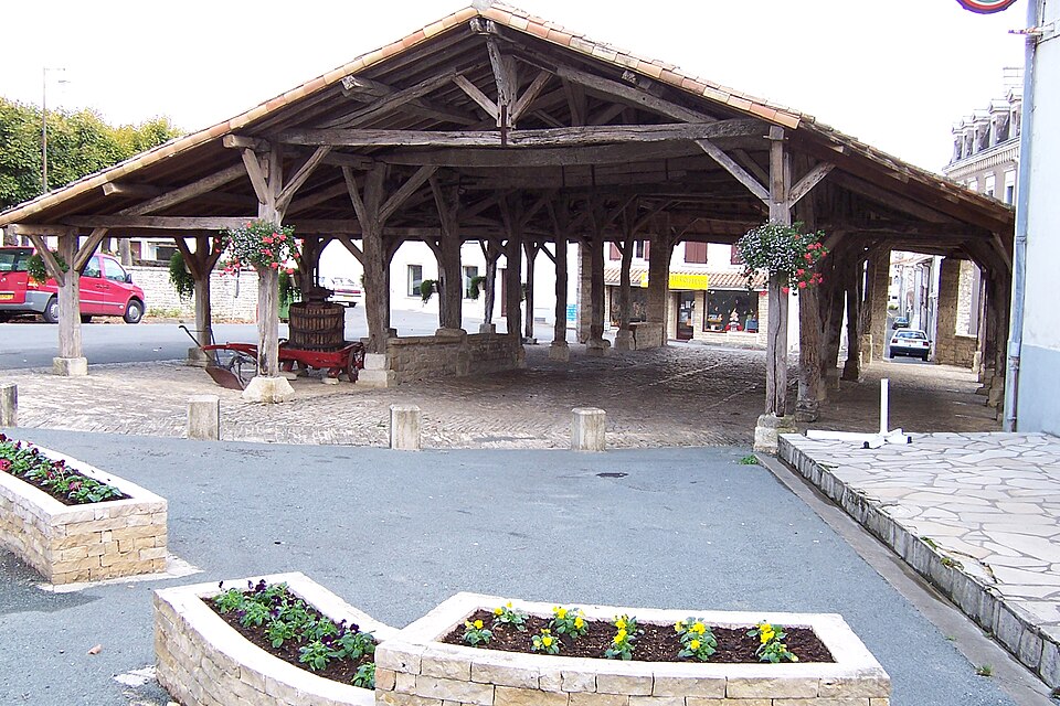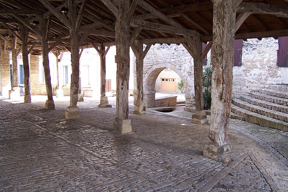 La halle a été construite vers 1700. Elle a fait l'objet de travaux menés par les architectes Bellat et Roy en 1764, puis de réparations en 1828 et d'une remise en état de la couverture en 1923. Des interventions plus récentes, en 1997, ont restauré la charpente dans ses dimensions premières et la couverture; le dallage et les murets ont été repris, et l'éclairage ainsi que les abords aménagés. De plan rectangulaire et au sol pavé, la halle présente un vaisseau central plus large que les vaisseaux latéraux. La couverture en tuile creuse est portée par des piliers en bois reliés par des murets, dont il subsiste quelques traces.