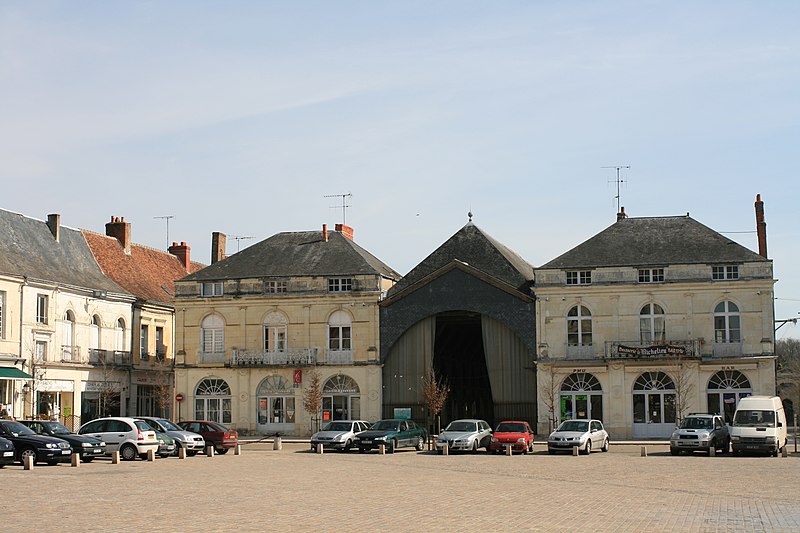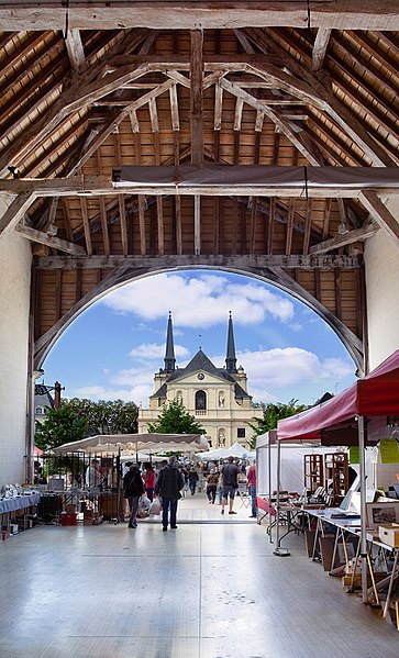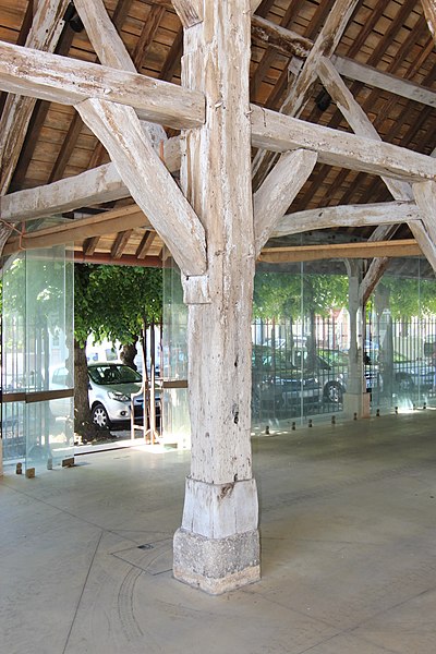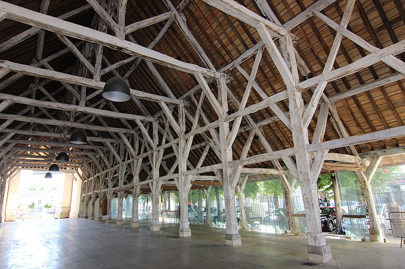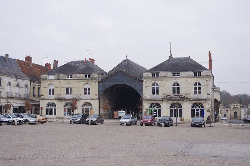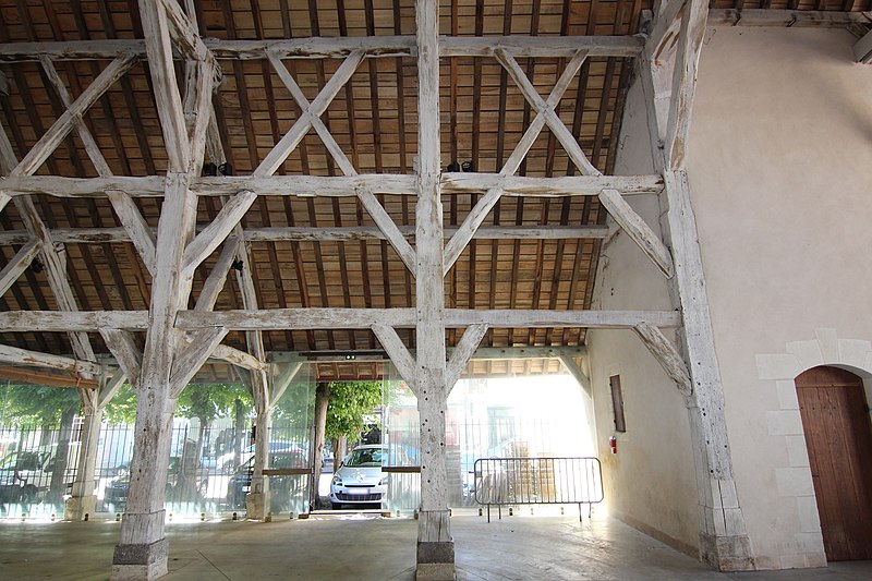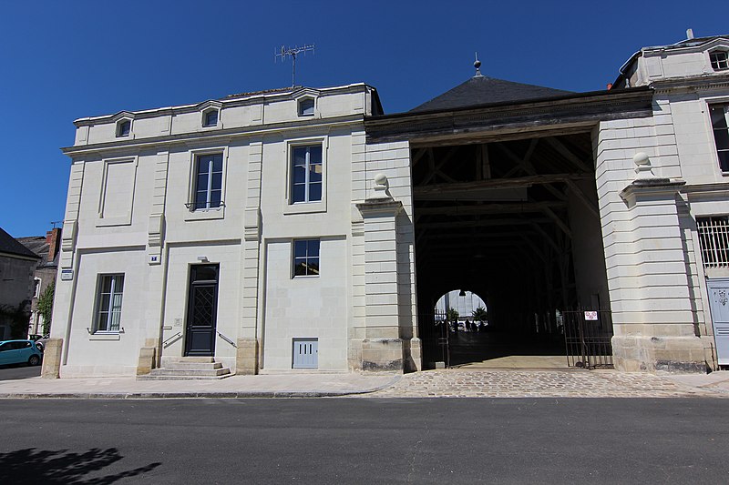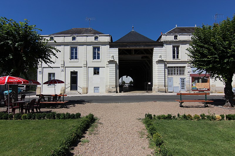 Ces halles figurent parmi les plus importantes constructions en bois conservées en France. Elles consistent en un vaisseau divisé en trois nefs sous un comble à deux pans, avec seize travées dans la nef centrale et onze dans les parties latérales. Trois travées du côté ouest et deux du côté est ont été englobées au XIXe siècle dans des constructions qui masquent les façades. À l'intérieur, les travées reposent sur de grandes fermes composées de poteaux, d'arbalétriers, d'entraits, de poinçons et de liens. Elles étaient prévues dans le chantier de la ville de Richelieu conçu par l'architecte Jacques Lemercier. L'entrepreneur de la charpente pourrait être Denis Barbet, frère de Jean Barbet, entrepreneur de maçonnerie. Sur la gravure d'Israël Silvestre, elles ne présentent pas de bas-côtés. Les pavillons ouest qui flanquent l'entrée ont été créés par l'architecte L. Dezigny de Chinon en 1843, tandis que les pavillons du front est ne sont pas attribués. L'entrée, en très mauvais état, a été entièrement refaite dans les années 1950. Le grand pignon en pierre de taille qui surmontait l'arc segmentaire a disparu.