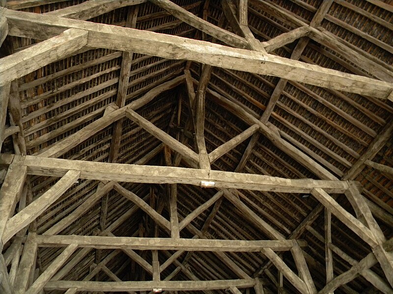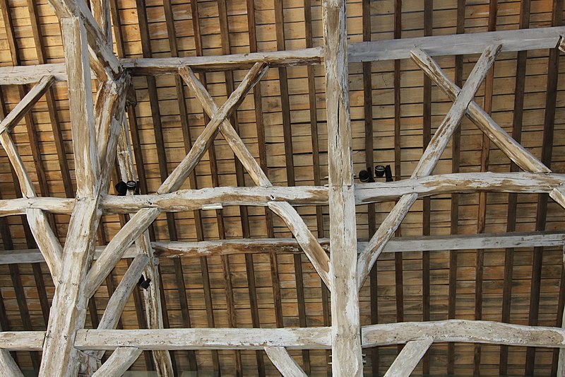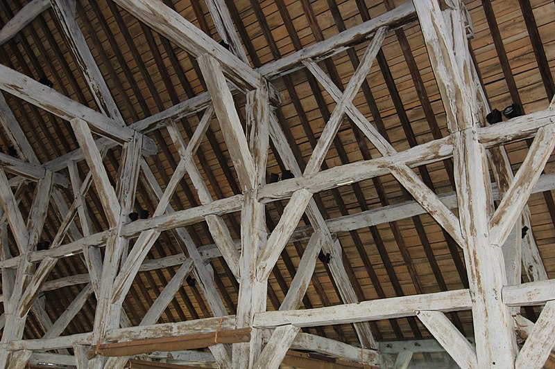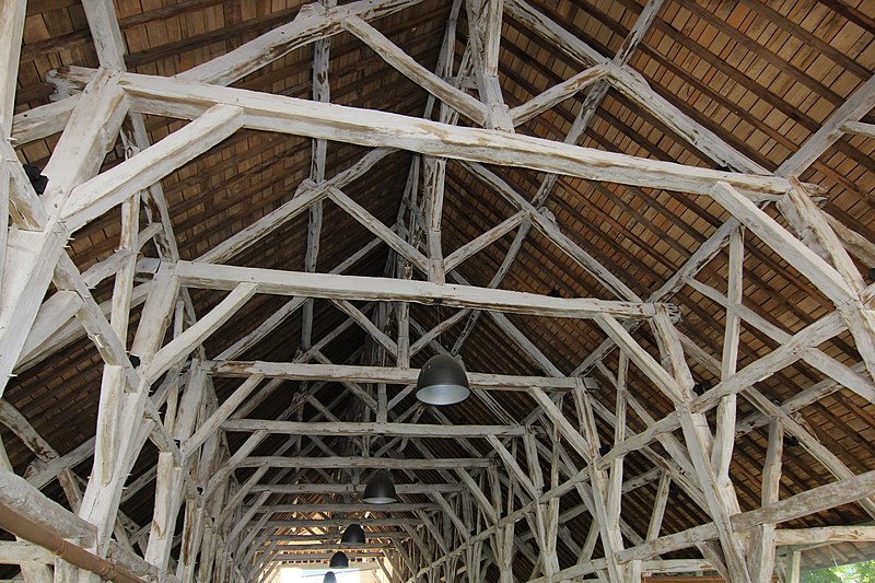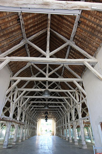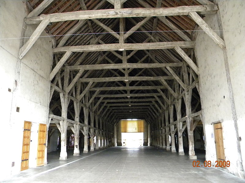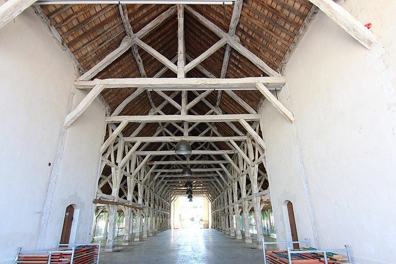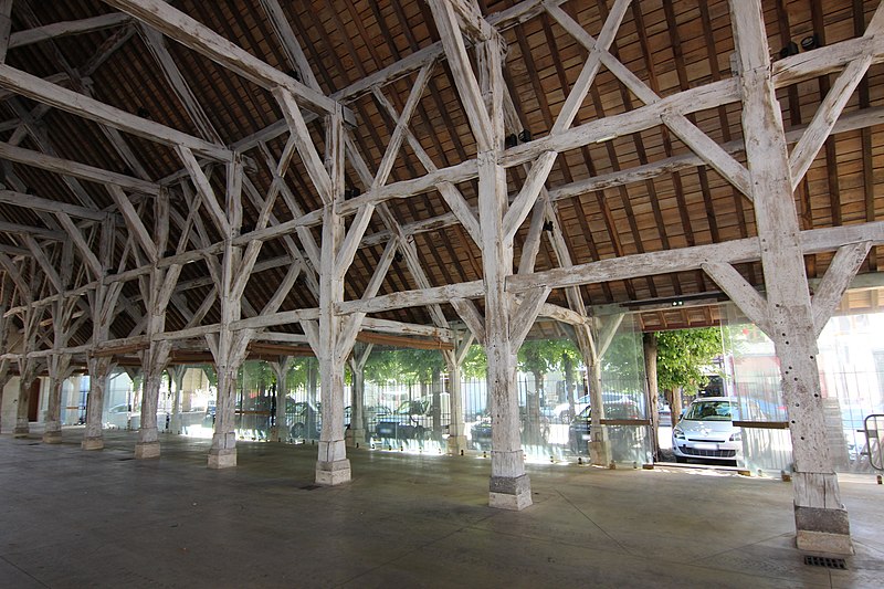 Ces halles figurent parmi les plus importantes constructions en bois conservées en France. Elles consistent en un vaisseau divisé en trois nefs sous un comble à deux pans, avec seize travées dans la nef centrale et onze dans les parties latérales. Trois travées du côté ouest et deux du côté est ont été englobées au XIXe siècle dans des constructions qui masquent les façades. À l'intérieur, les travées reposent sur de grandes fermes composées de poteaux, d'arbalétriers, d'entraits, de poinçons et de liens. Elles étaient prévues dans le chantier de la ville de Richelieu conçu par l'architecte Jacques Lemercier. L'entrepreneur de la charpente pourrait être Denis Barbet, frère de Jean Barbet, entrepreneur de maçonnerie. Sur la gravure d'Israël Silvestre, elles ne présentent pas de bas-côtés. Les pavillons ouest qui flanquent l'entrée ont été créés par l'architecte L. Dezigny de Chinon en 1843, tandis que les pavillons du front est ne sont pas attribués. L'entrée, en très mauvais état, a été entièrement refaite dans les années 1950. Le grand pignon en pierre de taille qui surmontait l'arc segmentaire a disparu.