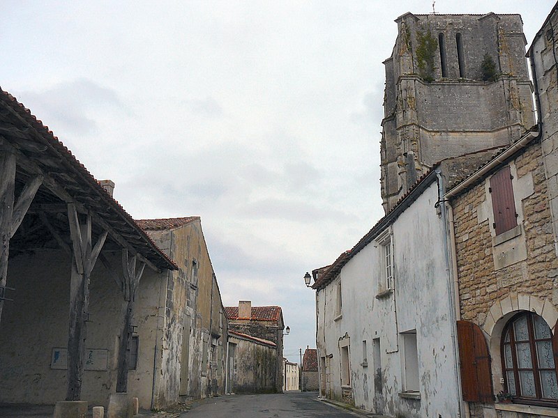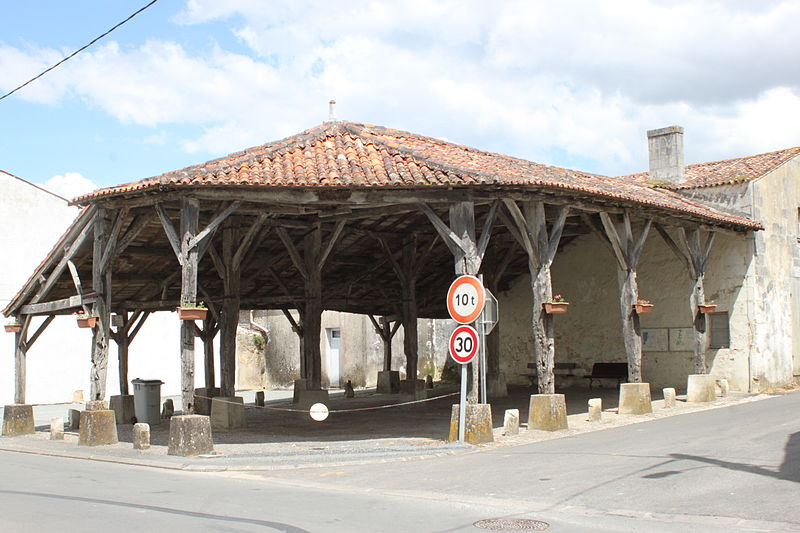La halle de Saint-Jean-d'Angle (Charente-Maritime, Nouvelle-Aquitaine) remplace une première construction du XVIe siècle et pourrait remonter au XVIIe siècle. Implantée au centre du bourg, elle couvre un rectangle d'environ 10 x 20 m et s'appuie sur une maison du bourg côté est. Elle se compose d'un vaisseau principal et d'un bas-côté au nord. L'angle sud-ouest, formé par le croisement des rues, a été tronqué plus tardivement pour faciliter la circulation. La charpente, assemblée par tenons et mortaises à mi-bois, est une structure à pannes portée par dix grands poteaux et six plus petits, dont les têtes présentent un épaississement asymétrique. Les bases en pierre de taille ont été noyées dans du béton coffré. Le sol conserve un cailloutis dans les zones non goudronnées ; le marché couvert fait l'objet d'une inscription au titre des monuments historiques depuis le 26 mai 2011.