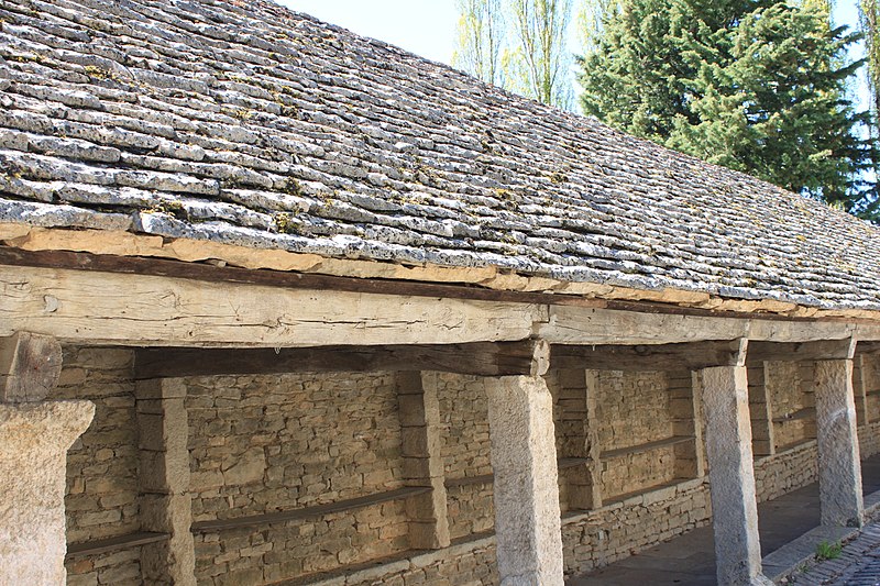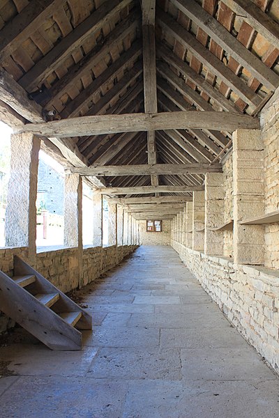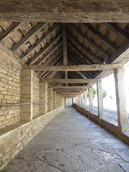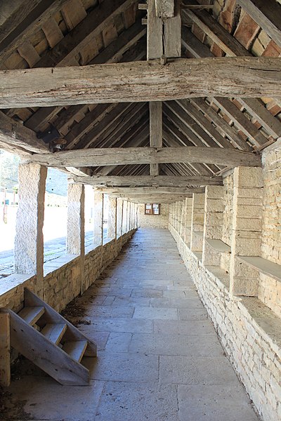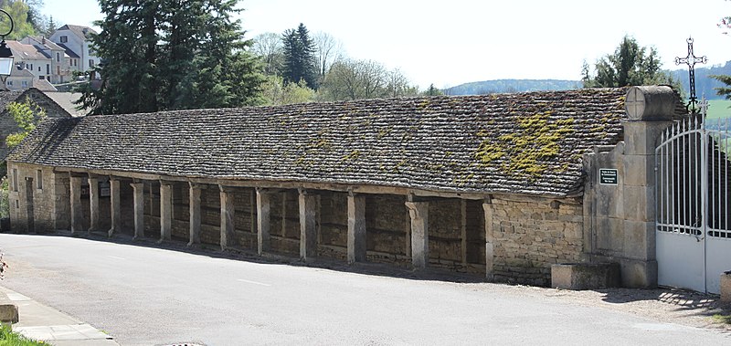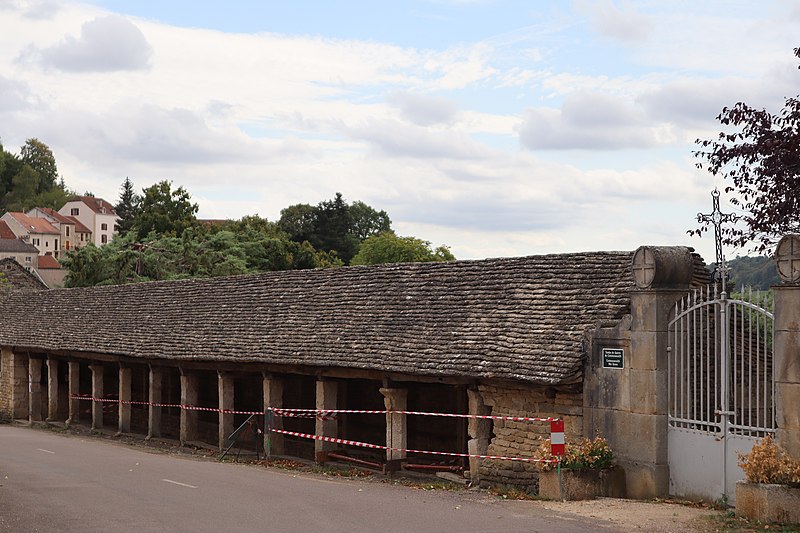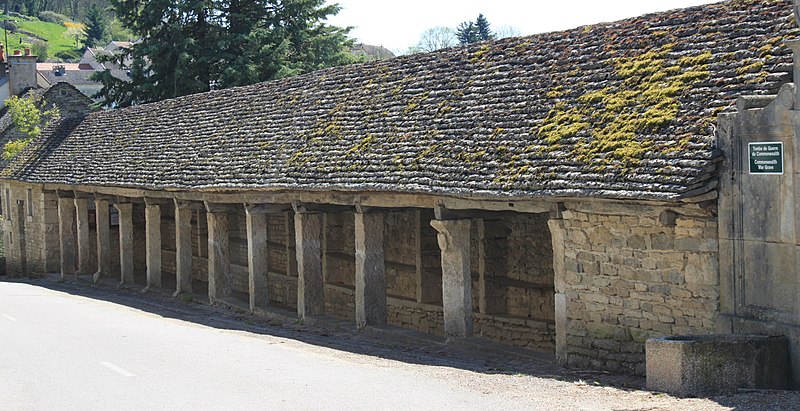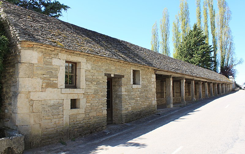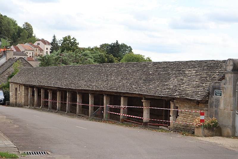 La halle de Salmaise, située à 400 m d'altitude dans la commune de Salmaise (Côte-d'Or), est un édifice en pierre adossé au cimetière et desservi par la RD 117. Bâtie tout en longueur, elle présente une façade rectiligne rythmée par onze piliers carrés et repose sur un sol dallé, conçu pour compenser la pente de la route. Sa charpente à deux pans, sans support intermédiaire, est couverte de lauze et le mur du fond est dépourvu d'ouvertures. L'édifice a été initié dans la seconde moitié du XIIIe siècle : par la charte des libertés du 12 mai 1265, Étienne II de Mont-Saint-Jean permit aux Salmaisiens d'y établir un marché couvert, en réutilisant notamment des piliers gallo-romains. Sur le dernier pilier se lit un blason orné d'un croissant et de trois étoiles, qui pourrait correspondre aux armes de Guillaume II, seigneur de Salmaise, tué à la bataille de Mansourah lors de la septième croisade en 1250. Pendant longtemps la halle a servi de lieu de rassemblement et de délibération : y étaient nommés le maire, les échevins, le recteur d'école, le garde, les pâtres et le marguillier, et s'y tenaient les marchés ainsi que cinq grandes foires annuelles. Classée au titre des monuments historiques par arrêté du 4 août 1930, elle conserve son intérêt architectural mais son étroitesse et la proximité de la route principale, sans aire de déambulation, limitent aujourd'hui les possibilités d'utilisation.