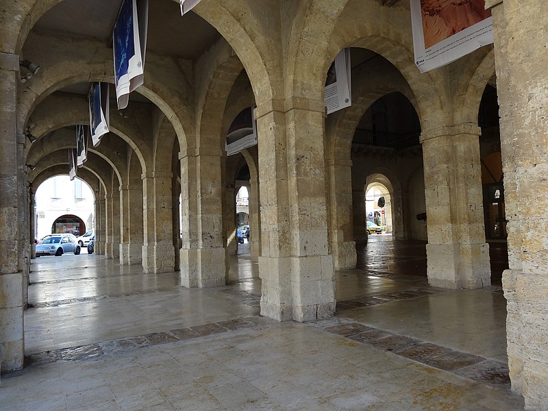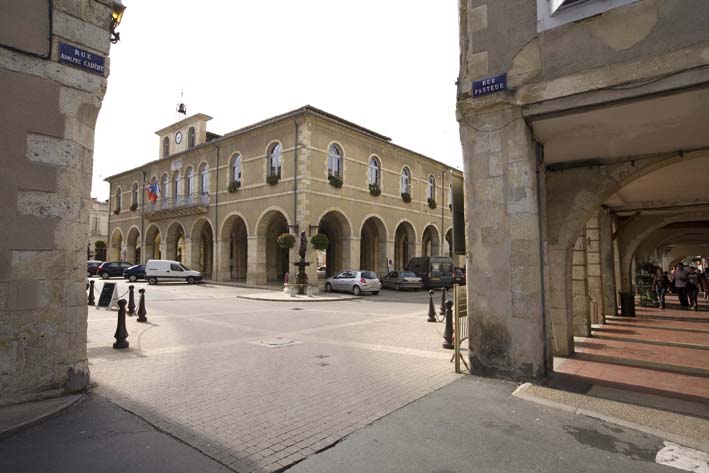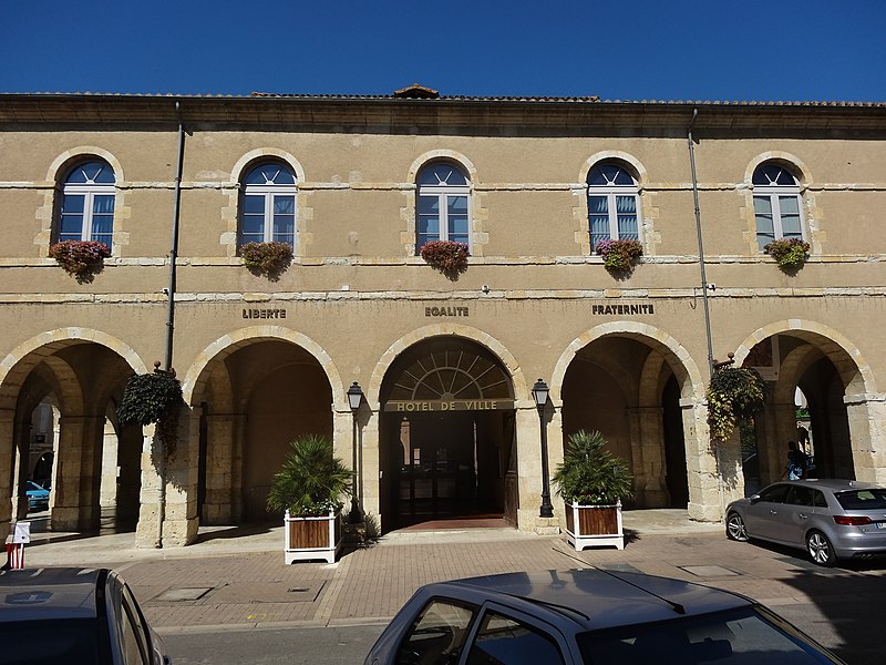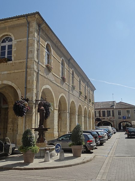 La halle-hôtel de ville de Fleurance (Gers) remplace la halle primitive détruite par un incendie en août 1833 et a été édifiée entre 1834 et 1837. Fleurance, bastide au plan régulier, possède une place centrale bordée d’arcades où se tiennent la halle et le bâtiment communal destinés aux réunions et délibérations. Le bâtiment d’origine, bas avec galetas, était accosté d’une halle simple dont la charpente reposait sur vingt-huit piliers en bois et qui abritait les instruments de mesure du marché. La municipalité confia la reconstruction à l’architecte d’Auch Ardenne ; le cahier des charges prévoyait une halle de grande surface et des locaux municipaux incluant la justice de paix. L’architecte opta pour une organisation privilégiant l’utilisation de l’espace : la halle au rez-de-chaussée et les bâtiments à l’étage, répartis autour d’une double colonnade périphérique de piliers carrés, l’espace central libre étant éclairé par des fenêtres hautes et un lanterneau. Un escalier droit, peu encombrant, conduit à l’étage. Des statues-fontaines représentant les Quatre Saisons furent ajoutées aux angles peu après la construction. La halle-hôtel de ville a été inscrite aux Monuments historiques le 14 mai 1987.