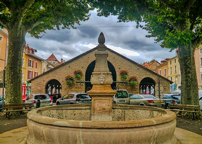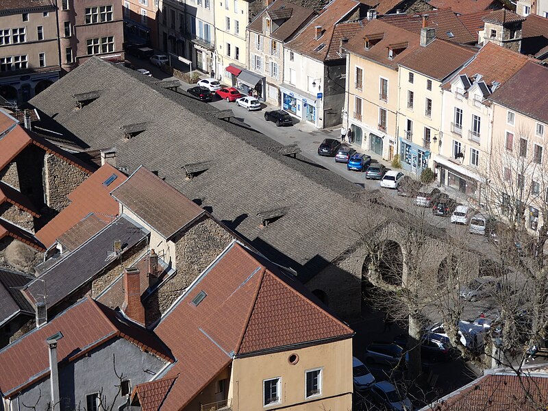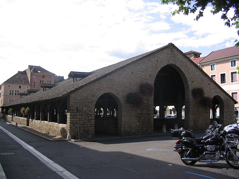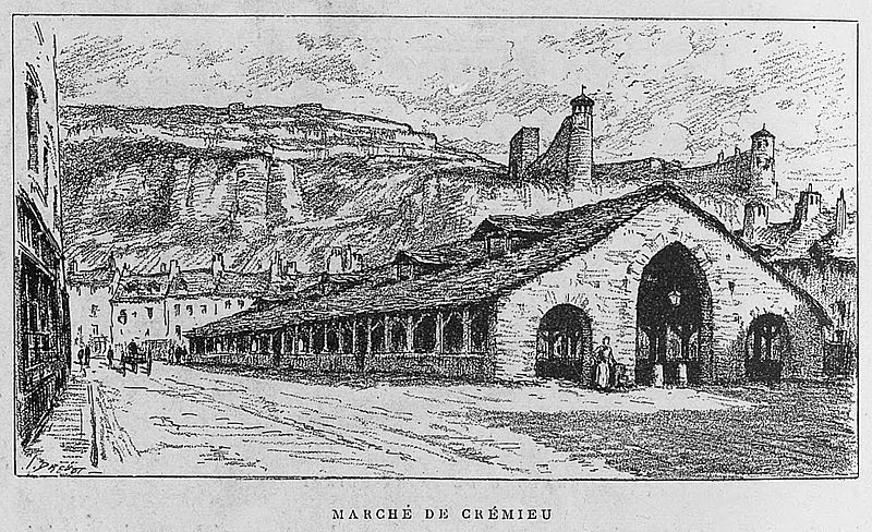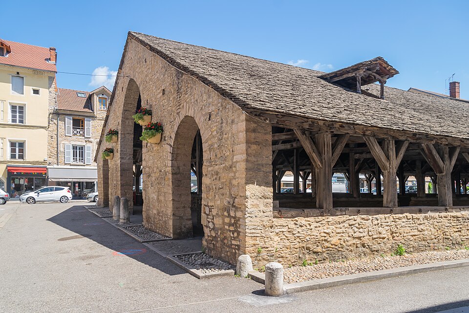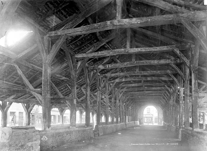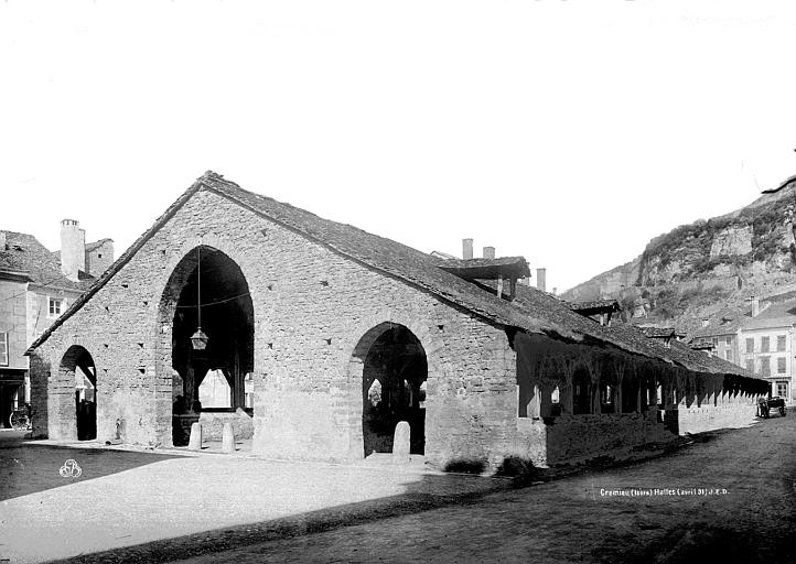Les halles de Crémieu, situées au centre du bourg ancien de Crémieu dans le département de l'Isère (Auvergne-Rhône-Alpes), occupent la place de la Poype entre les rues de la Porcherie et Lieutenant-Colonel Bel ; l'édifice, daté du XVe siècle, est classé au titre des monuments historiques depuis le 19 mai 1906. La création d'une ville basse au début du XIVe siècle par le dauphin Jean II entraîna l'établissement d'un nouveau marché en 1314, mieux desservi par les rues rectilignes de la ville neuve que ne l'était l'ancien marché installé sur les pentes. Une étude dendrochronologique réalisée en 1994 par le service des Monuments Historiques situe la construction de la halle actuelle en 1433, tandis que d'autres sources indiquent un achèvement en 1434. L'édifice a remplacé le « marché‑vieux » et, en tant que bâtiment long et ouvert, servait d'entrepôt et de lieu de régulation des grains lors des foires et marchés médiévaux. À l'intérieur subsiste une mesure à grain en pierre taillée comportant quatre alvéoles, témoignant des pratiques de contrôle des volumes échangés. Les unités de mesure locales comprenaient le bichet, évalué à 19,5 litres, ainsi que l'émine (deux bichets), le setier (deux émines), la bichette (un demi‑bichet) et la coupe (un quart de bichet). La charpente en chêne supporte une couverture de plaquettes de calcaire local pesant environ quatre cents tonnes. Présentée comme la deuxième halle de France par ses dimensions, elle mesure 61 mètres de longueur sur 19,50 mètres de largeur. La nef méridionale constituait autrefois un passage où les habitants déposaient leurs ordures. L'édifice a fait l'objet de restaurations en 1910‑1911 et en 1994 ; cette dernière intervention a principalement porté sur la couverture. Faute de matériau local, les anciennes pierres calcaires ont été remplacées par des laves de Bourgogne, plus épaisses, ce qui a modifié la silhouette de la halle. Les halles demeurent en fonction et abritent un marché hebdomadaire ; l'accès est libre, à pied ou par les transports publics. Le site accueille également des manifestations régulières, notamment la Fête de la musique en juin et la foire aux dindes le 15 décembre de chaque année. Des vues récentes montrent l'édifice sous ses aspects extérieurs Est, Ouest et Sud ainsi qu'une vue générale intérieure.