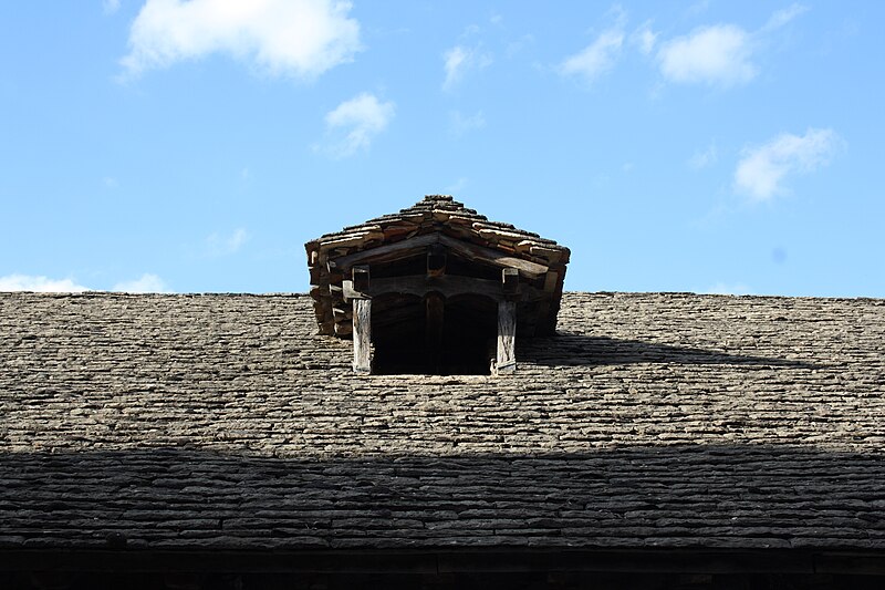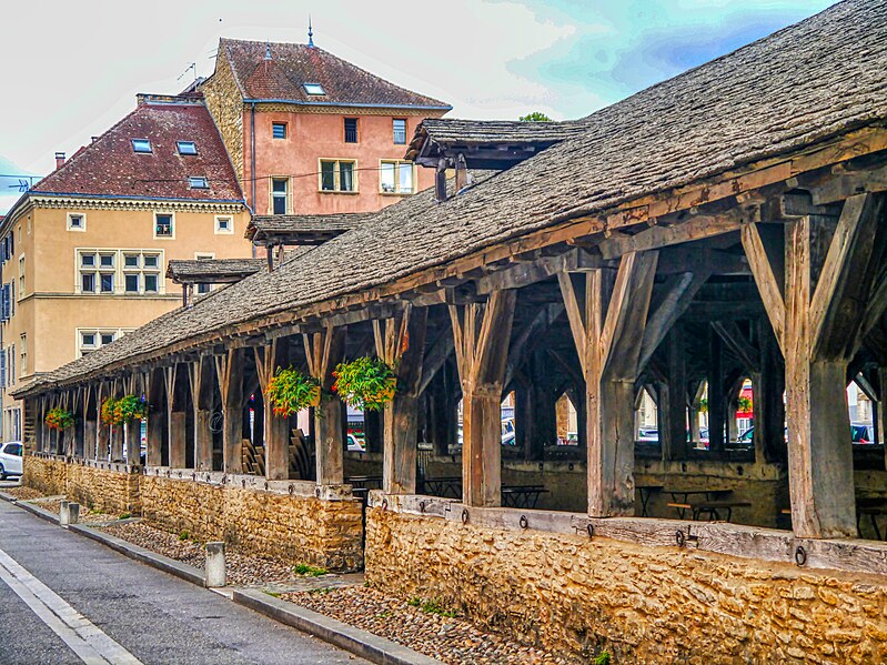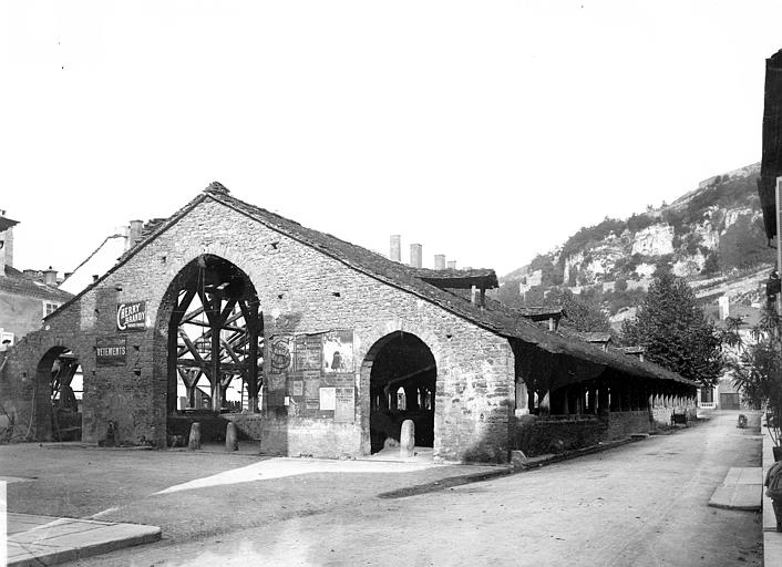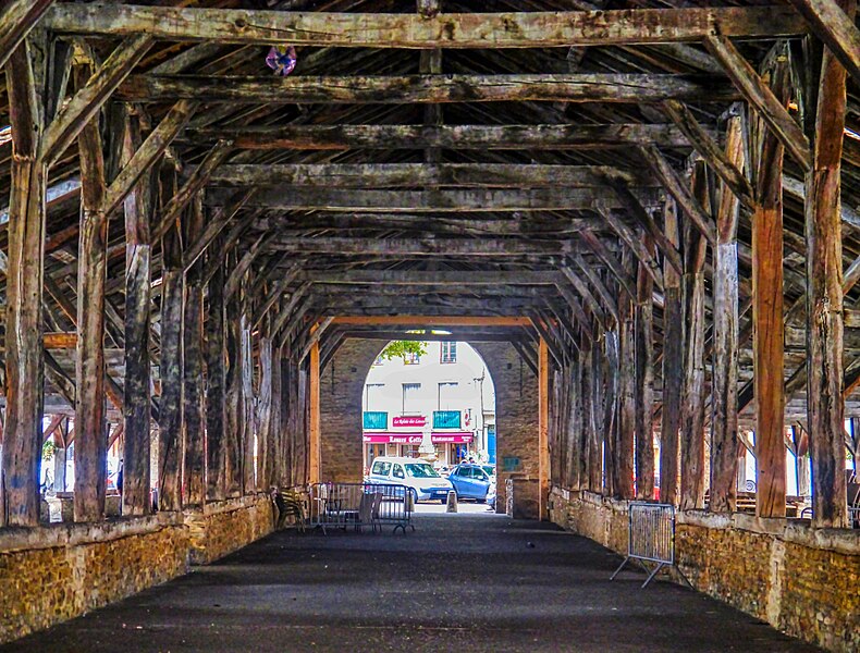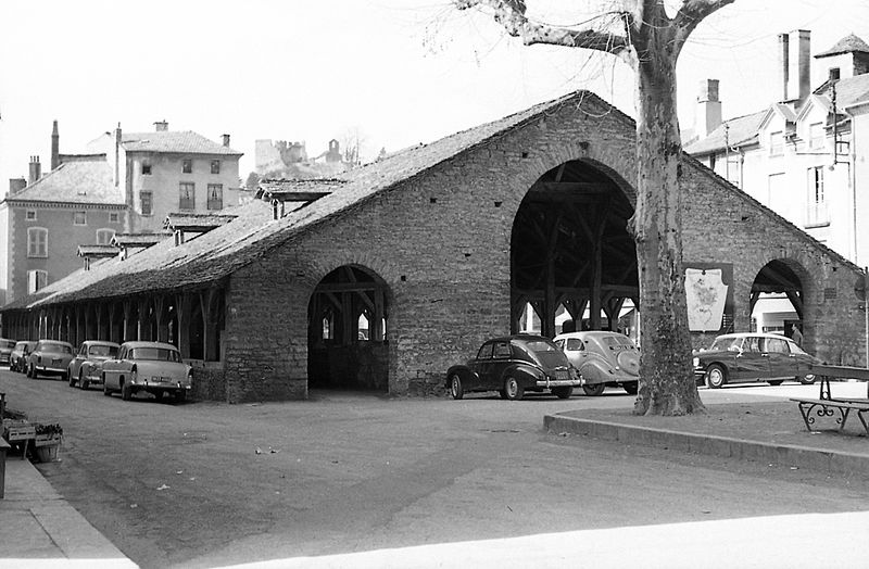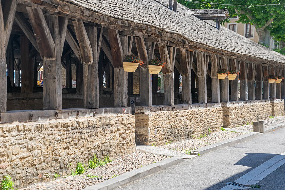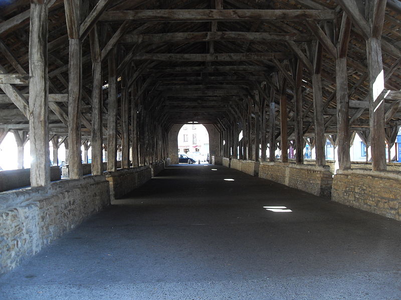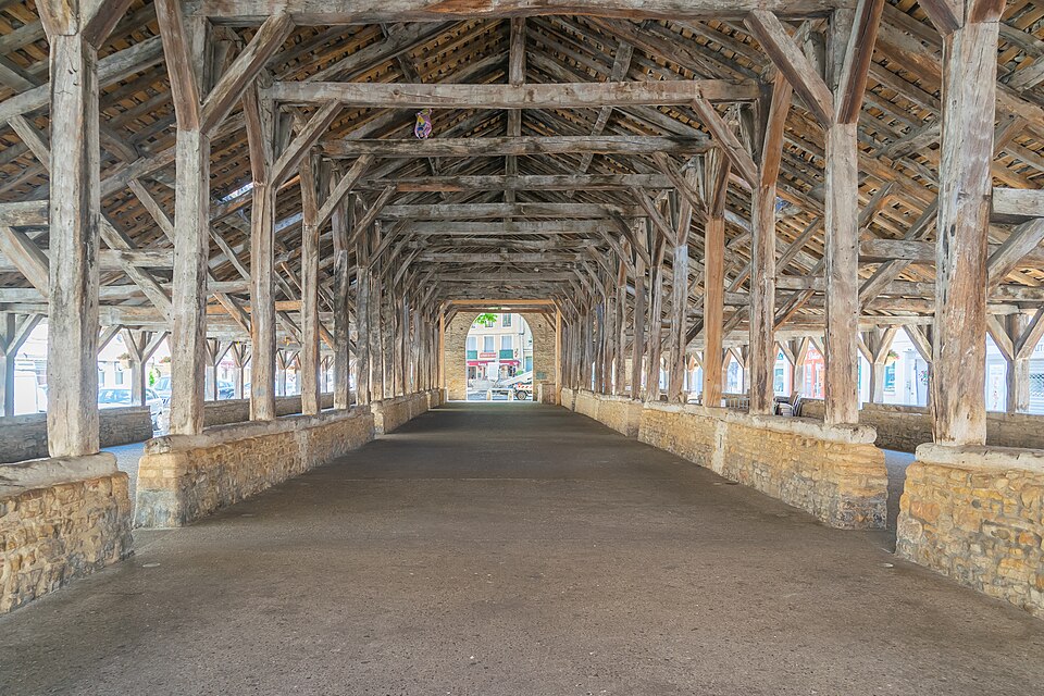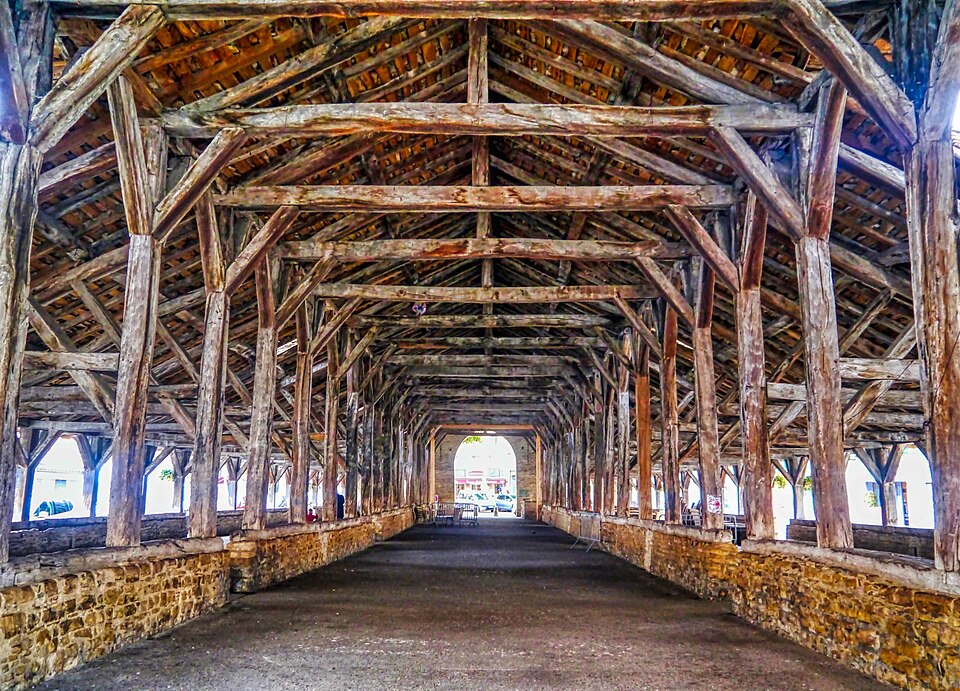 Édification de la halle avec une charpente en chêne et une couverture de plaquettes de calcaire.