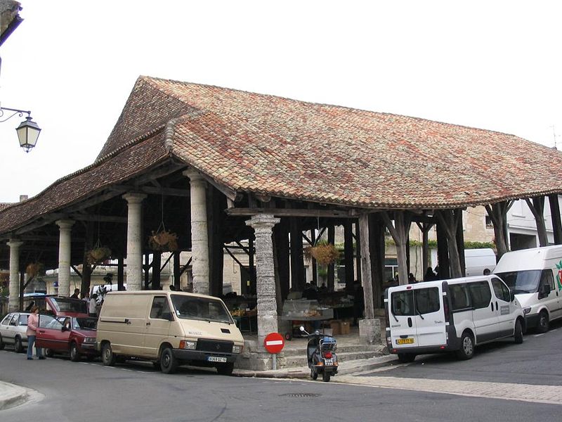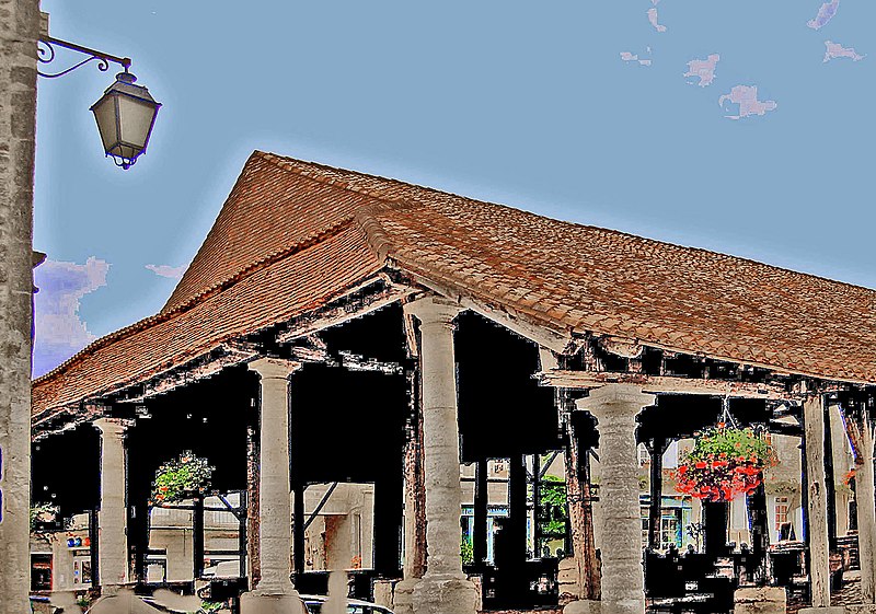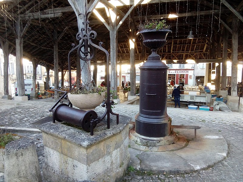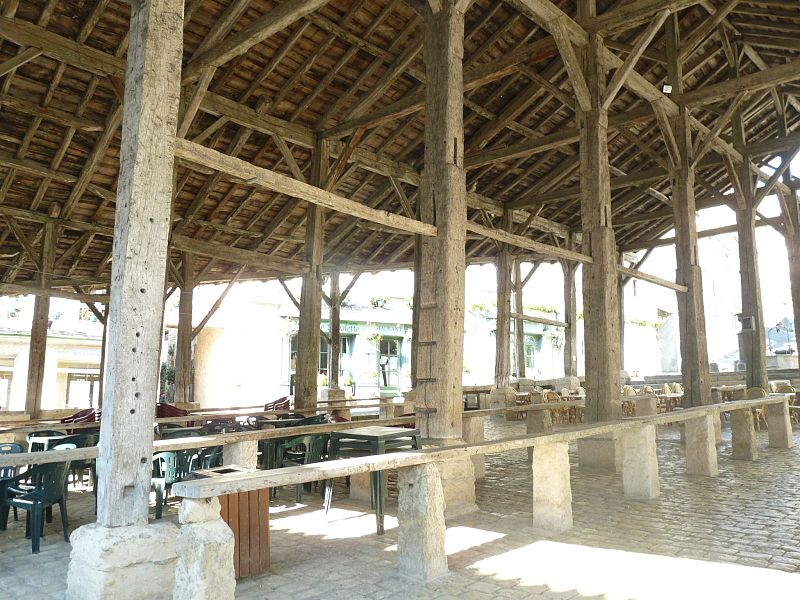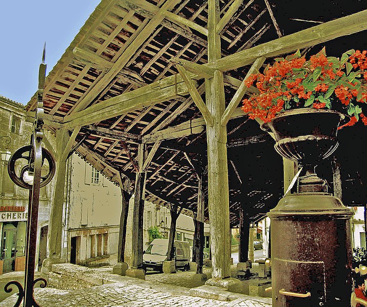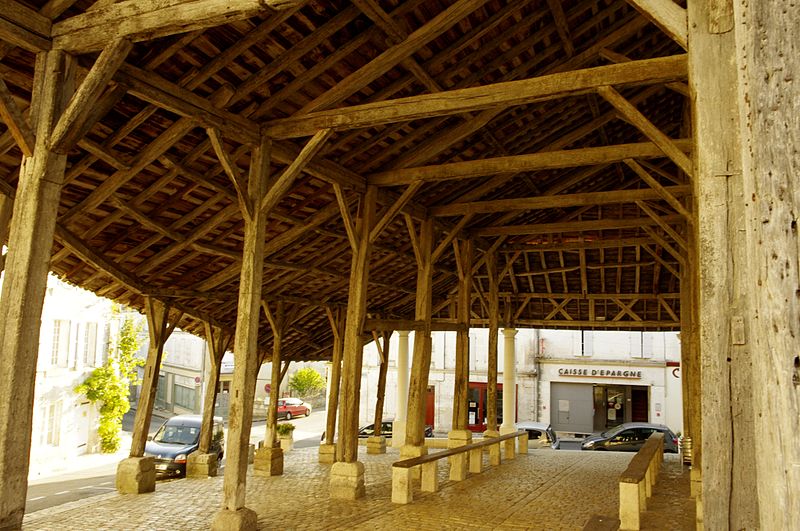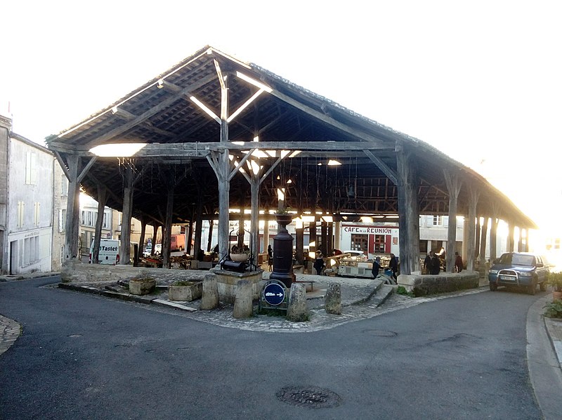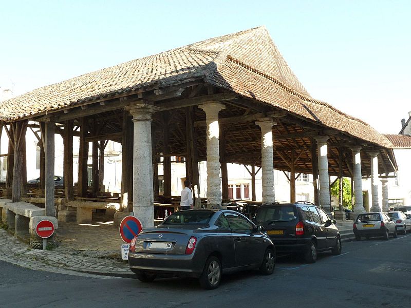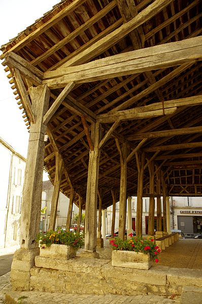 Les halles de Villebois-Lavalette, situées sur la place centrale triangulaire du bourg à Villebois-Lavalette (Charente, Nouvelle-Aquitaine), sont classées au titre des monuments historiques depuis 1948. Elles reposent sur un soubassement du XIIe siècle et leur origine est attribuée au XVIIe siècle, certaines sources évoquant la seconde moitié du XVIIIe siècle. Implantées au centre de la ville et bordées par trois rues, elles épousent la légère déclivité de la place, dont le sol pavé s’abaisse vers l’ouest et est bordé, sur ce côté, par trois marches. Le bâtiment est couvert par un vaste toit à plusieurs pans d’environ 670 m2, coiffé d’un versant en tuiles creuses et, sur une partie retravaillée, de tuiles plates ; la couverture comporte aussi un auvent recouvert d’ardoises soutenu par cinq colonnes doriques sur la façade principale. La charpente, très solide, s’appuie sur des poteaux en bois portés sur des dés ou piédestaux de pierre et présente des poutres entrecroisées assemblées à mi-bois. Sur le bord ouest, la charpente est soutenue par sept colonnes toscanes en pierre ajoutées lors d’aménagements au milieu du XIXe siècle. Les piliers en bois, disposés de façon régulière, laissent l’édifice ouvert sur les côtés, tandis qu’une borne-fontaine occupe l’angle oriental. Selon le cadastre et les archives locales, les halles auraient été élevées autour de 1665 et ont peut‑être été édifiées par les mêmes ouvriers que le château alors possédé par le duc de Navailles. Entre 1784 et 1787, M. Dauber Daubœuf de Villée, seigneur de Blanzaguet et capitaine au château de Villebois, fit réparer la charpente et fit poser des dés de pierre à la base des piliers en bois. En 1806, les halles, ainsi que le champ de foire, devinrent propriété communale. D’après le site communal, elles furent inscrites aux monuments historiques en 1852; en 1855 le bâtiment fut reculé d’un mètre le long de la route départementale 17 pour améliorer la circulation, et des marches ainsi qu’un second pan de toit furent aménagés. L’arrivée de l’eau courante en 1853 depuis la fontaine de la Font Trouvée compléta l’alimentation en eau publique et la borne-fontaine des halles est la seule de la commune encore en place. Un projet communal de démolition datant de 1946 échoua et les halles furent finalement classées par décret le 10 mai 1948. La toiture fut entièrement restaurée en 1976, le pavage refait ensuite, et des travaux de rénovation ont également été menés en 2012 et 2013. Aujourd’hui, un marché alimentaire se tient sous les halles le samedi matin et un petit marché biologique a lieu le mercredi.