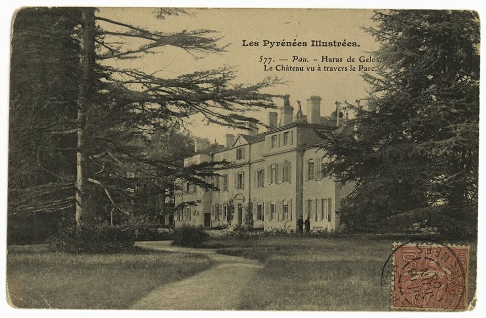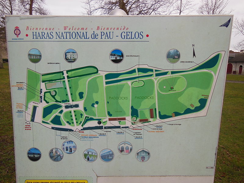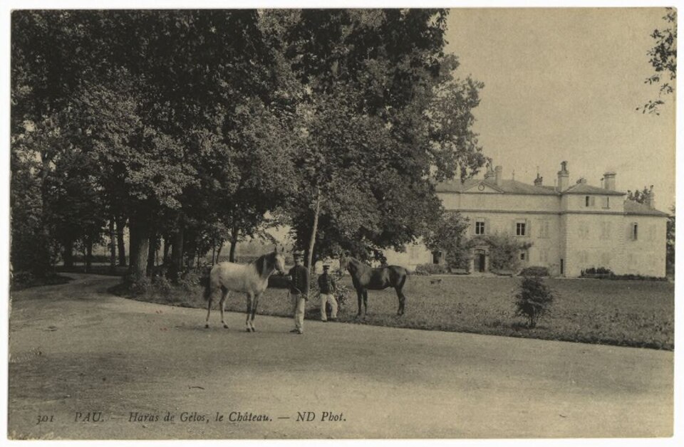 Le haras national de Pau‑Gelos est situé à Gelos, au sud de Pau, dans les Pyrénées‑Atlantiques. Il fait partie des Haras nationaux, établissement public depuis 1999, et a été intégré à l’Institut français du cheval et de l’équitation (IFCE) en 2010. Le site remplit des missions publiques : identification des chevaux, reproduction, formations professionnelles pour les acteurs de la filière et aide à la recherche d’emploi via le service équi‑ressources. L’entrée du domaine se fait par un portail situé en face de l’église ; un petit parking est disponible et le site est également accessible aux piétons depuis le stade d’eaux vives par une passerelle franchissant le gave. L’emplacement aurait appartenu dès 1630 à monsieur de Portau, abbé laïque de Gelos, puis la propriété fut revendue au baron de Duplaa. Le baron fit édifier en 1784 le château actuel, qui devint le lieu des fêtes de l’aristocratie locale et valut à Gelos le surnom de « Versailles béarnais ». En 1808, après une nuit passée au château avec l’impératrice Joséphine, Napoléon Ier choisit le domaine de Gelos pour y transférer le haras alors installé à Astous. Le château d’origine comporte un grand corps de logis central, légèrement en retrait par rapport aux deux pavillons est et ouest construits au XIXe siècle, et présente un avant‑corps central en saillie coiffé d’un fronton triangulaire. Le hall d’entrée conserve un escalier dont la grille en fer forgé, provenant de l’hôtel Duplaa d’Escout à Pau, a été installée en 1959. Le domaine comprend également une collection de voitures hippomobiles, deux vastes écuries le long de la rue du Maréchal‑Leclerc — dont l’écurie nommée « Dionysos II » — une troisième écurie destinée à la reproduction, une carrière sablée avec la petite écurie « Jacquart », un rond d’Havrincourt et une maréchalerie. L’ensemble du bâti et le parc ont été inscrits au titre des Monuments historiques par arrêté du 4 août 2011. Historiquement centre de reproduction et d’élevage, le haras a vu cette activité transférée au secteur privé en 2012, reprise par la coopérative animale SORELIS. Dans la continuité d’une volonté d’ouverture des sites de l’État, des manifestations touristiques et sportives se sont développées. Le domaine a notamment accueilli des races telles que les pur‑sang arabes et anglo‑arabes, plusieurs chevaux de trait (ardennais, bretons, franc‑comtois), le poney landais et le pottok. En novembre 2015, l’IFCE a annoncé la mise en vente du haras pour janvier 2016. Le site a été repris en 2018 par Catherine de Lartigue, à la suite du désengagement de la SORELIS.