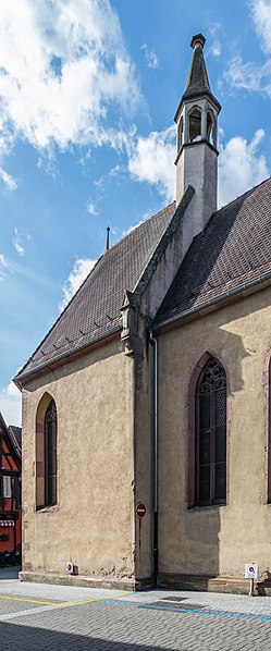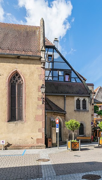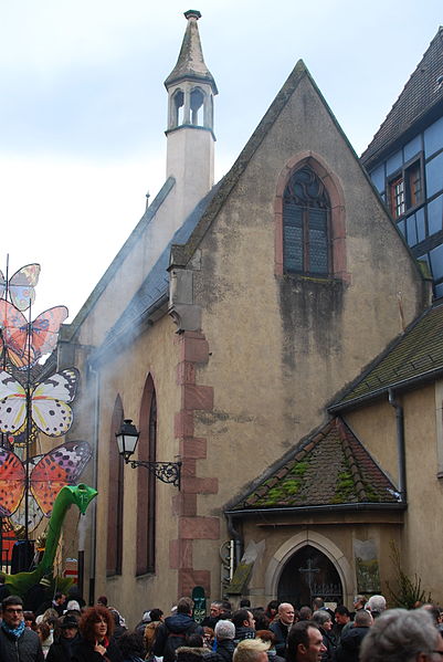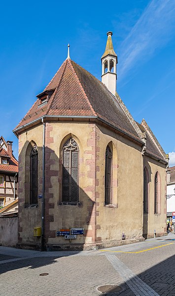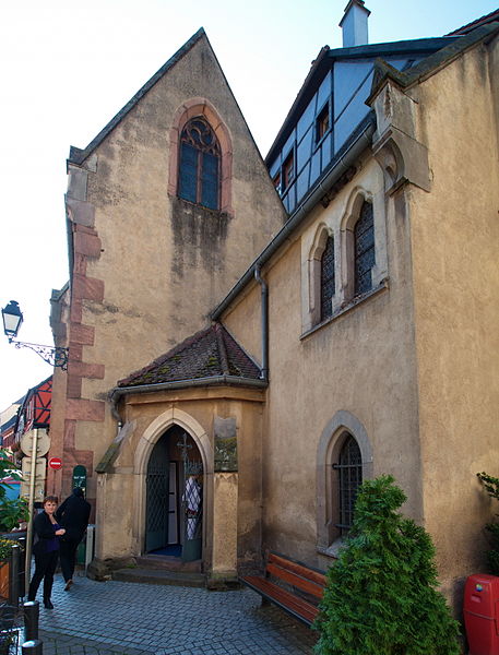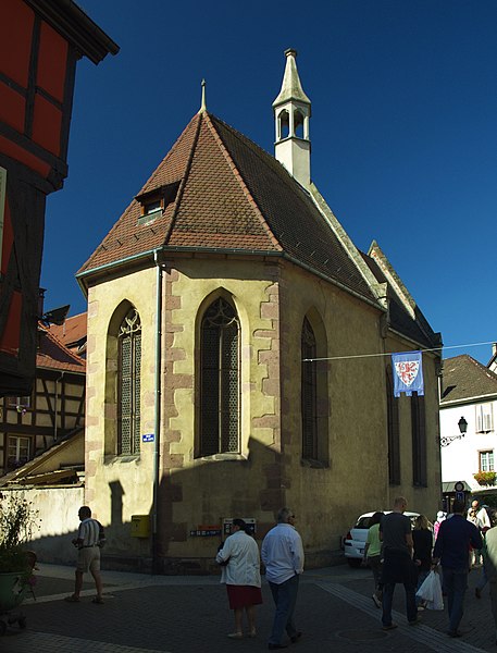 L'hôpital de Ribeauvillé, situé 41 Grand-Rue, comprend une ancienne chapelle dédiée à Sainte‑Catherine. L'édifice est classé au titre des monuments historiques depuis 1898. Un établissement hospitalier est mentionné en 1342, la chapelle existant en 1362. L'hôpital fut agrandi en 1542, date gravée sur une plaque du bâtiment adjacent à la chapelle et qui concerne sans doute celle-ci. Les caractéristiques architecturales du chœur (voûte, remplages des fenêtres) concordent avec cette datation, tandis que la nef paraît légèrement antérieure, avec un plafond et des remplages attribués au XVe siècle. Selon Kraus, la sacristie accolée au mur sud du chœur portait la date de 1688. En 1812 la commune acheta la chapelle et la transforma en halle au blé. Des travaux de restauration eurent lieu en 1898 ; un petit corps de bâtiment fut ajouté à l'ouest contre le pignon et un porche placé en biais entre les deux corps. Ces aménagements permirent d'accueillir, en 1909, un petit musée consacré à l'histoire locale. En 1925 la ville reçut en donation une collection de tableaux de Marcel Lenoir, présentée dans ces locaux jusqu'en 1929, date à laquelle les œuvres furent déposées à l'hôtel de ville. Une reconstitution du musée historique eut lieu en 1957, regroupant des objets provenant de Ribeauvillé — armes, drapeaux, outils liés à la culture de la vigne, trouvailles archéologiques —. Ces collections ont depuis été dispersées entre l'hôtel de ville et la bibliothèque ; la chapelle est actuellement vide. Pour approfondir, voir la thèse de Denis Gérardin, Hospices et hôpitaux à Ribeauvillé : des origines à l'annexion allemande (v. 1264-1871).