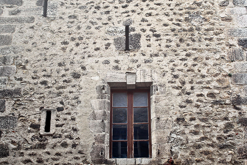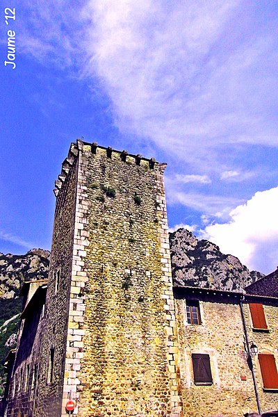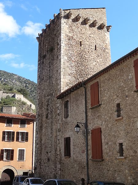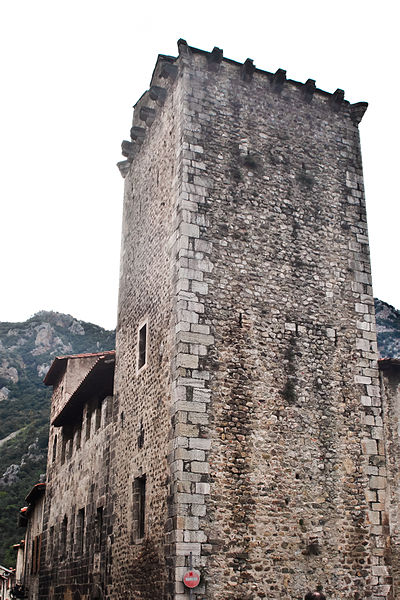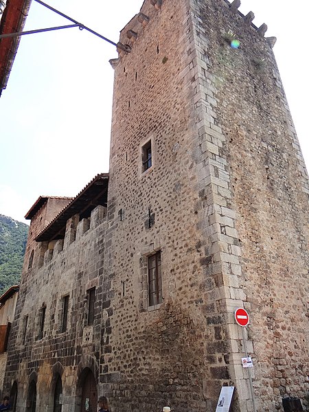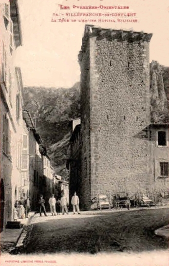Fondé par Pons de Sarabeu en 1225 dans la maison qu'il avait fait construire, l'ancien hôpital a été conservé presque sans remaniements. Il présente une tour couronnée de corbeaux de pierre — cinq sur chaque face et un à chaque angle — profilés en double quart de rond, vestiges d'un chemin de ronde détruit lors d'une réfection des couvertures. L'ouvrage est par ailleurs percé de plusieurs embrasures. Les murs sont bâtis en petits matériaux disposés en lits horizontaux soignés, avec de fortes chaînes d'angle où, sur chaque face, un moellon de renfort apparaît toutes les deux assises. Le corps principal, entièrement en pierre d'appareil, repose à la base sur une série de quatre arcs au tracé en plein cintre ou très légèrement brisé, sans chanfrein d'encadrement. L'arc de droite a conservé les vantaux anciens, tiercés, de la porte d'entrée. Au premier étage, quatre fenêtres à peu près alignées sur les arcades de base résultent d'un remaniement tardif. Le sommet de la façade conserve des vestiges de crénelage, ultérieurement obturés et surélevés pour former une galerie. La partie est de la façade, surélevée en forme de tour, fait pendant à la tour d'angle.