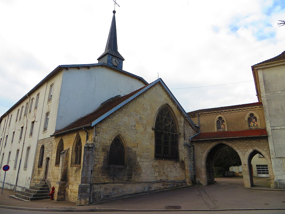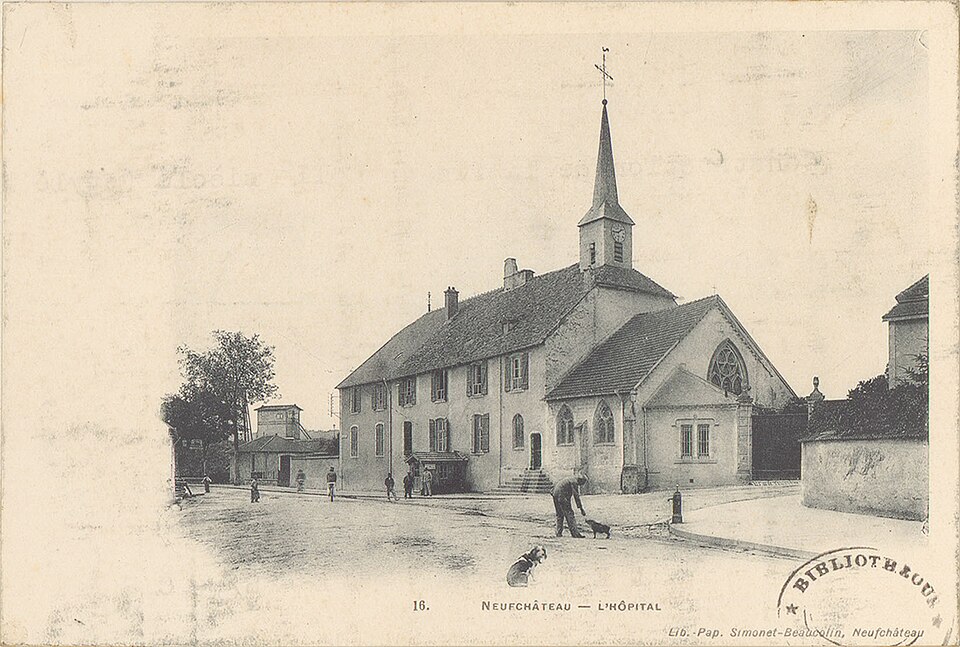 L'hôpital a été fondé en 1237 par le frère Robert, de l'ordre du Saint-Esprit, sur un terrain concédé par le duc de Lorraine Mathieu II. Les bâtiments furent achevés en 1261 ; la date figure sur le tympan de l'ancien portail de la chapelle, et le vaisseau central conserve des éléments du XIIIe siècle. Du XIVe siècle à la Révolution, l'établissement dépendit de la protection de l'hôpital du Saint-Esprit de Besançon. Aux XVe siècle, il comprenait une grande salle à nef unique, une halle terminée par un chœur et trois autres salles. La chapelle sud fut fondée en 1385 par Thierry Houdiard ; au même siècle on construisit la chapelle nord et l'on perça la baie est du vaisseau central. Les bâtiments furent restaurés sous le frère Georges-Charles Mesnier (1656-1674), puis, après 1696, par ordre du frère Adrian Bullet. Ils furent transformés en 1744-1746. Après l'incendie de 1779, l'hôpital fut reconstruit en 1780 et 1781. En 1793, on posa la rampe d'escalier provenant de l'abbaye de Mureau. À partir de 1884, le bâtiment fut agrandi et exhaussé dans le prolongement de la chapelle sur des plans de l'architecte Michaux. De 1897 à 1899, Regnier Labbé, entrepreneur à Grand, construisit la sacristie, aujourd'hui détruite.